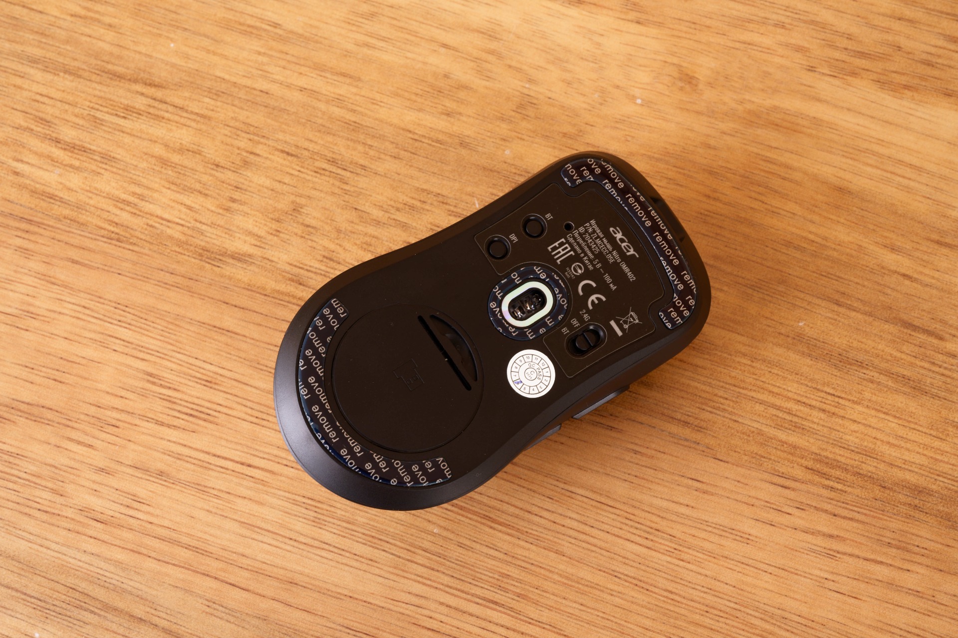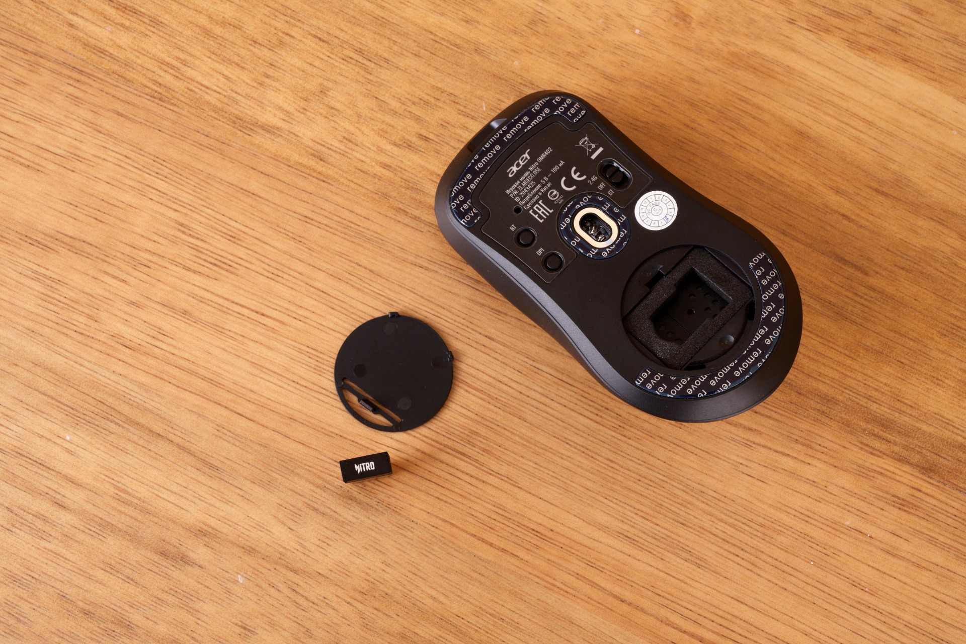 Перевернем мышь. На днище расположены три небольшие тефлоновые ножки: две по краям и одна возле оптического сенсора. Рядом с сенсором находятся кнопки переключения DPI и Bluetooth-сопряжения. На противоположной стороне предусмотрен физический тумблер для смены режимов работы. А чуть ниже сенсора скрывается круглый отсек с магнитной крышкой — внутри лежит USB-донгл для беспроводного подключения на частоте 2.4 ГГц.