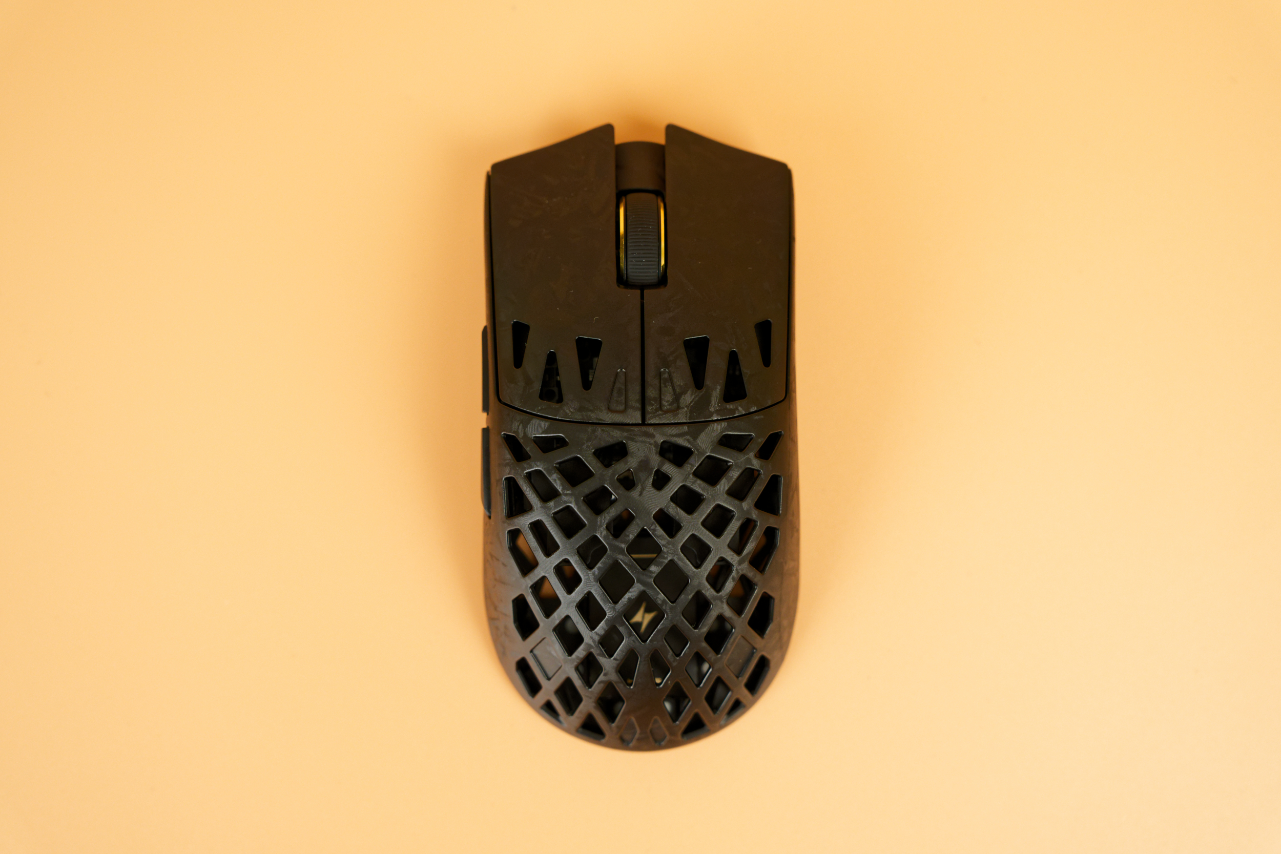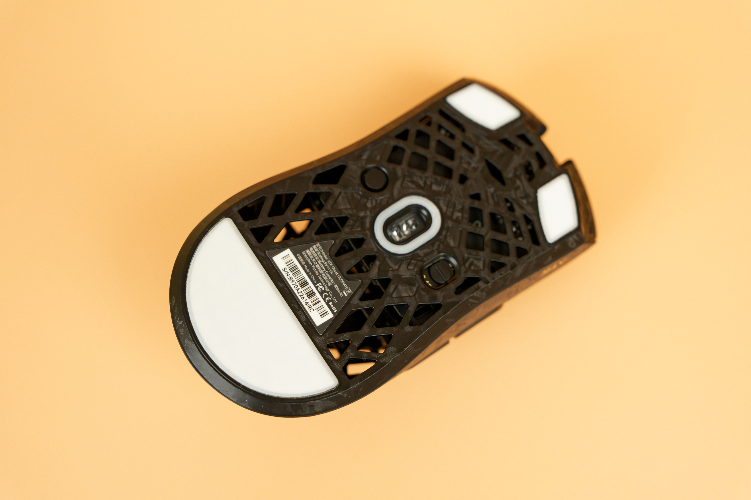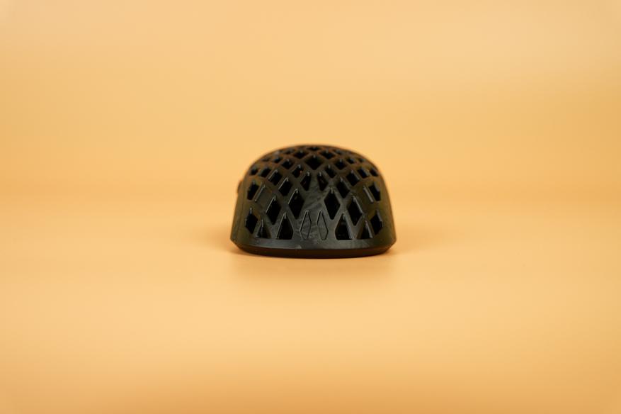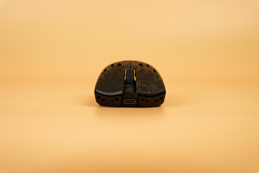 Корпус мыши выполнен из композитного материала на основе углеродного волокна, причем из него изготовлена не только верхняя часть с основными клавишами, но и основание. Этот материал отличается прочностью и легкостью: вес устройства составляет всего 50,9 грамма. Поверхность корпуса гладкая, приятная на ощупь и совершенно немаркая.