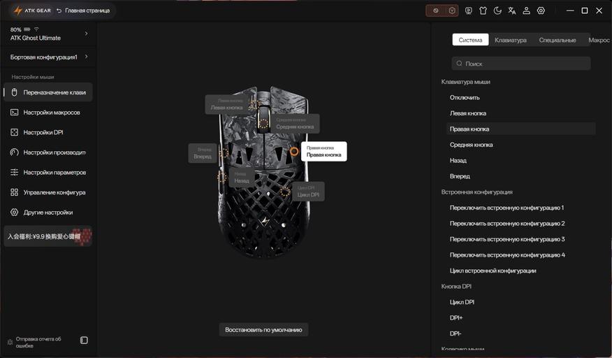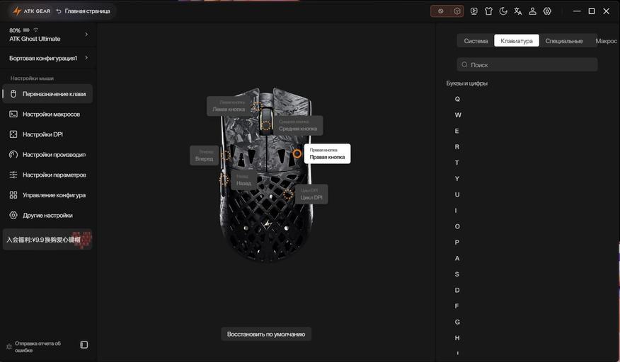 Боковые клавиши расположены слева, поэтому модель ориентирована на правшей. К слову, боковые клавиши выполнены из пластика и имеют гальваническое покрытие, которое встречается довольно редко. Такое покрытие дает ряд преимуществ, например повышает прочность деталей, делая их устойчивее к механическим воздействиям. С левой стороны ближе к передней части корпуса нанесена надпись ATK, а справа по центру — GHOST.