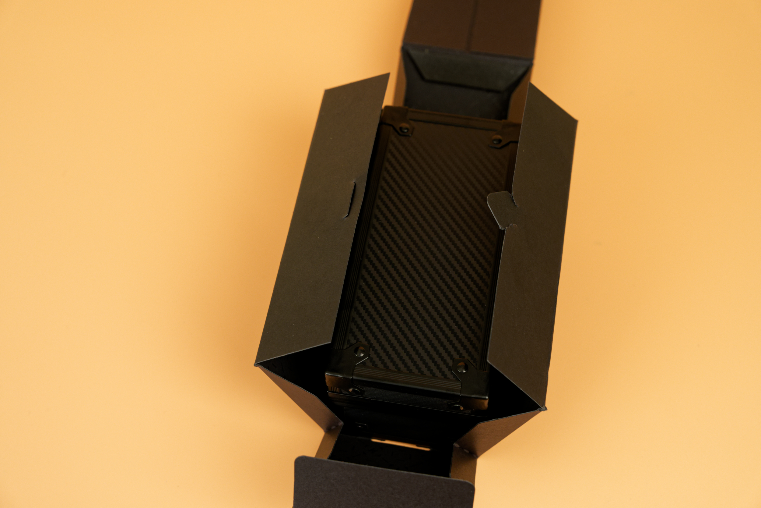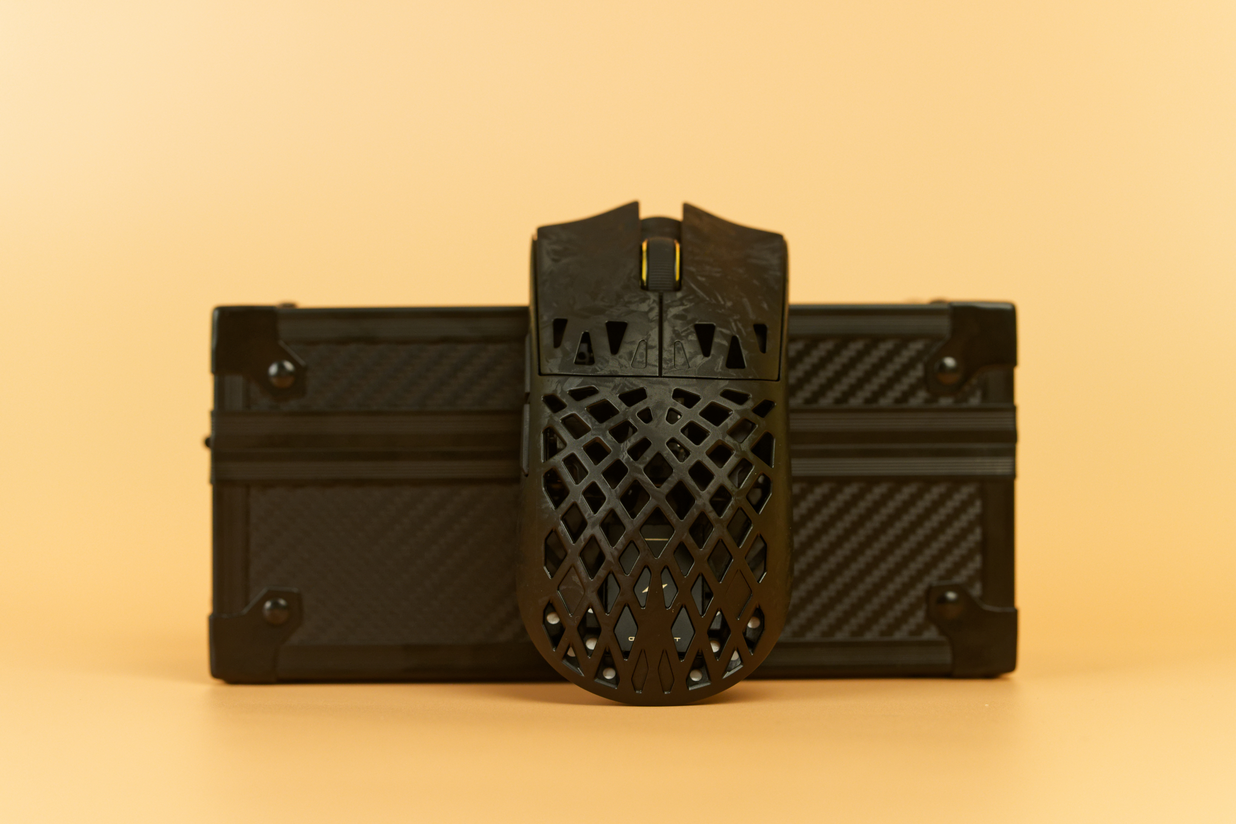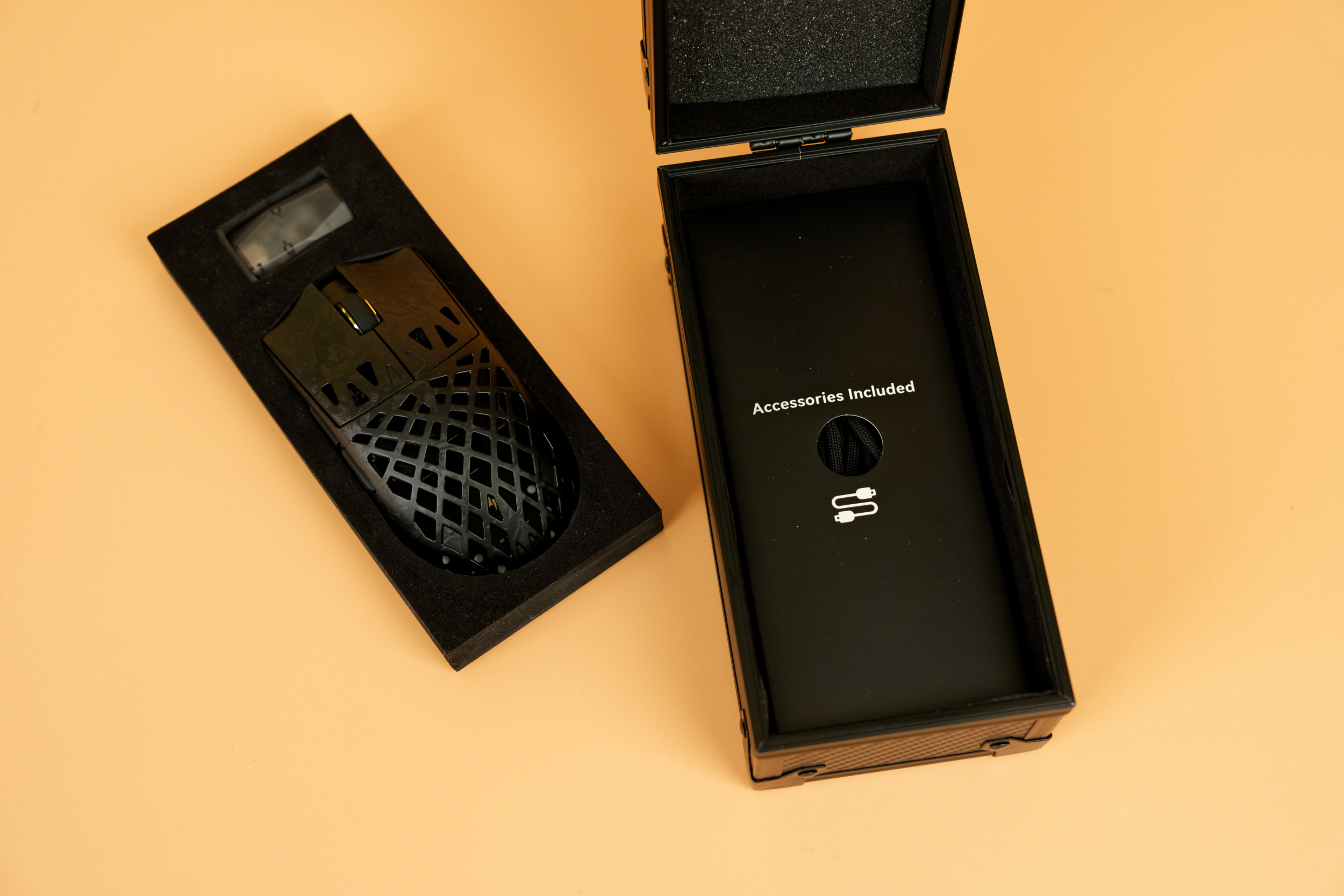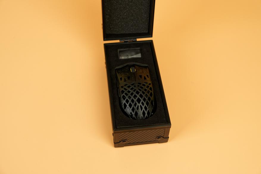Внутри внешней коробки находится жесткий кейс. Несмотря на внешнее сходство с пластиком, он выполнен из углеродного волокна, что обеспечивает надежную защиту содержимого и придает комплекту премиальный вид. Дизайн кейса выдержан в лаконичном, технологичном стиле. Внутри футляра мышь и беспроводной передатчик надежно зафиксированы в формовочном ложементе из мягкого материала, что исключает их повреждение при транспортировке. Под основным отсеком, в отдельной картонной коробке, скрывается комплект аксессуаров.