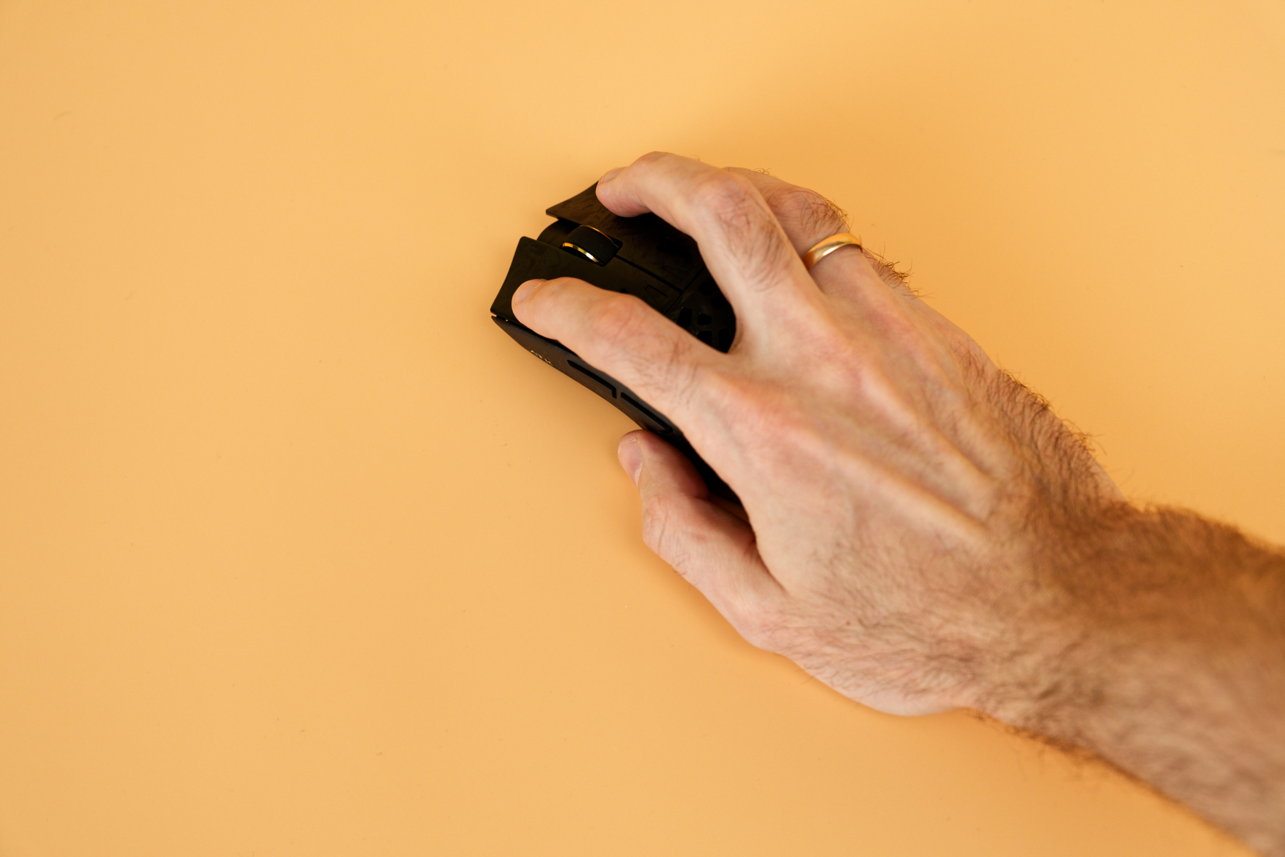 На верхней панели расположены две крупные основные кнопки. Они имеют удобный размер, а установленные переключатели обеспечивают мягкий, но отчетливый клик. Между кнопками находится колесико с металлической основой и прорезиненным покрытием — оно вращается легко и плавно. Нажатие на колесико также реализовано удачно: не слишком тугое, но с уверенным откликом. Окантовка колесика имеет золотистый цвет, что дополняет минималистичный дизайн.