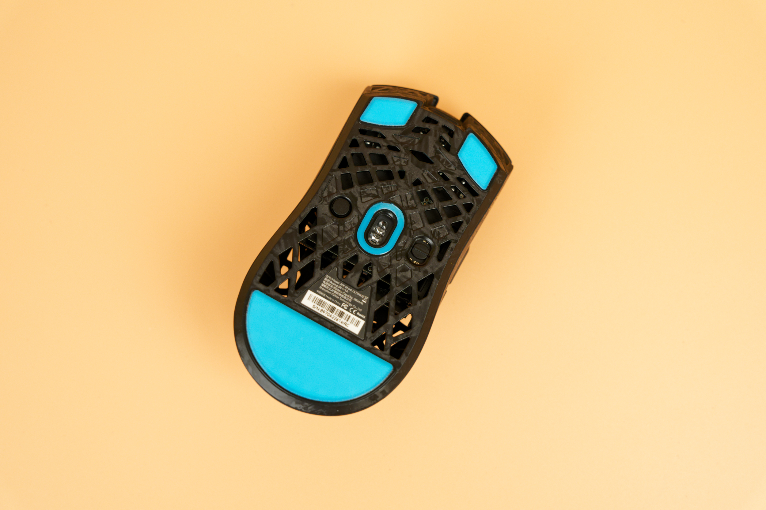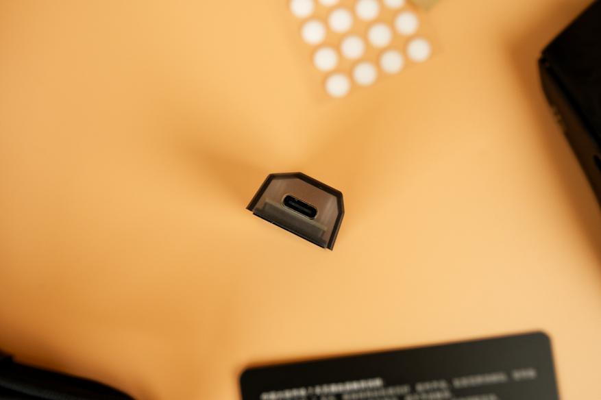 На нижней части корпуса расположены четыре белые тефлоновые глайд-ножки: три из них установлены по краям, а одна выполнена в виде кольца вокруг датчика в центре. Справа от сенсора находится переключатель режимов подключения: по Bluetooth или через USB-приемник на частоте 2,4 ГГц. Слева от сенсора расположена кнопка изменения DPI.