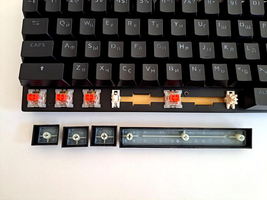 Колпачки выполнены методом двойного литья. Значит, символы на них долговечны и не сотрутся в течение длительного периода времени. А так же хотелось бы добавить, что хоть клавиатура хотя и бюджетная, но стоят стабилизаторы на всех широких клавишах, а не обычные скобы. Сделано это для стабилизации широких клавиш, долгого срока службы, а также для улучшения звука и ощущений тайпинга.