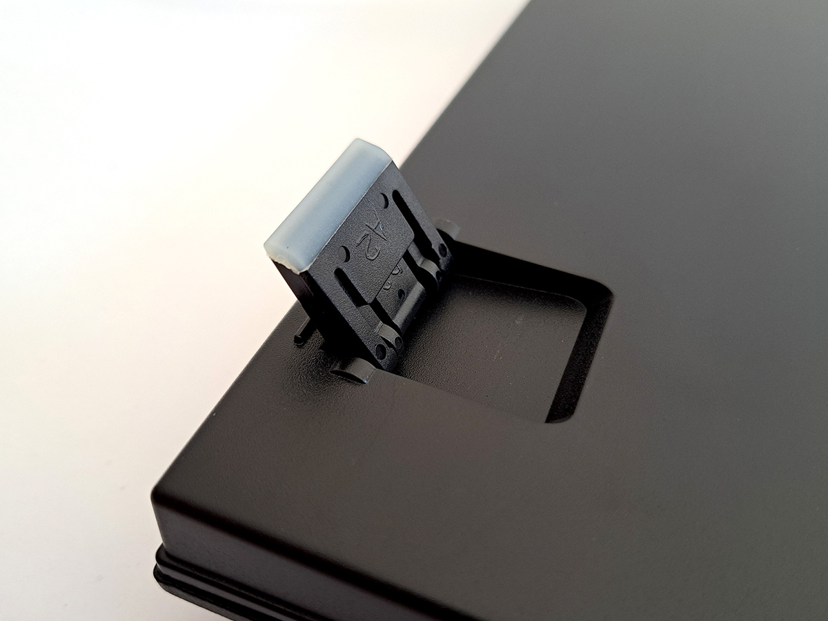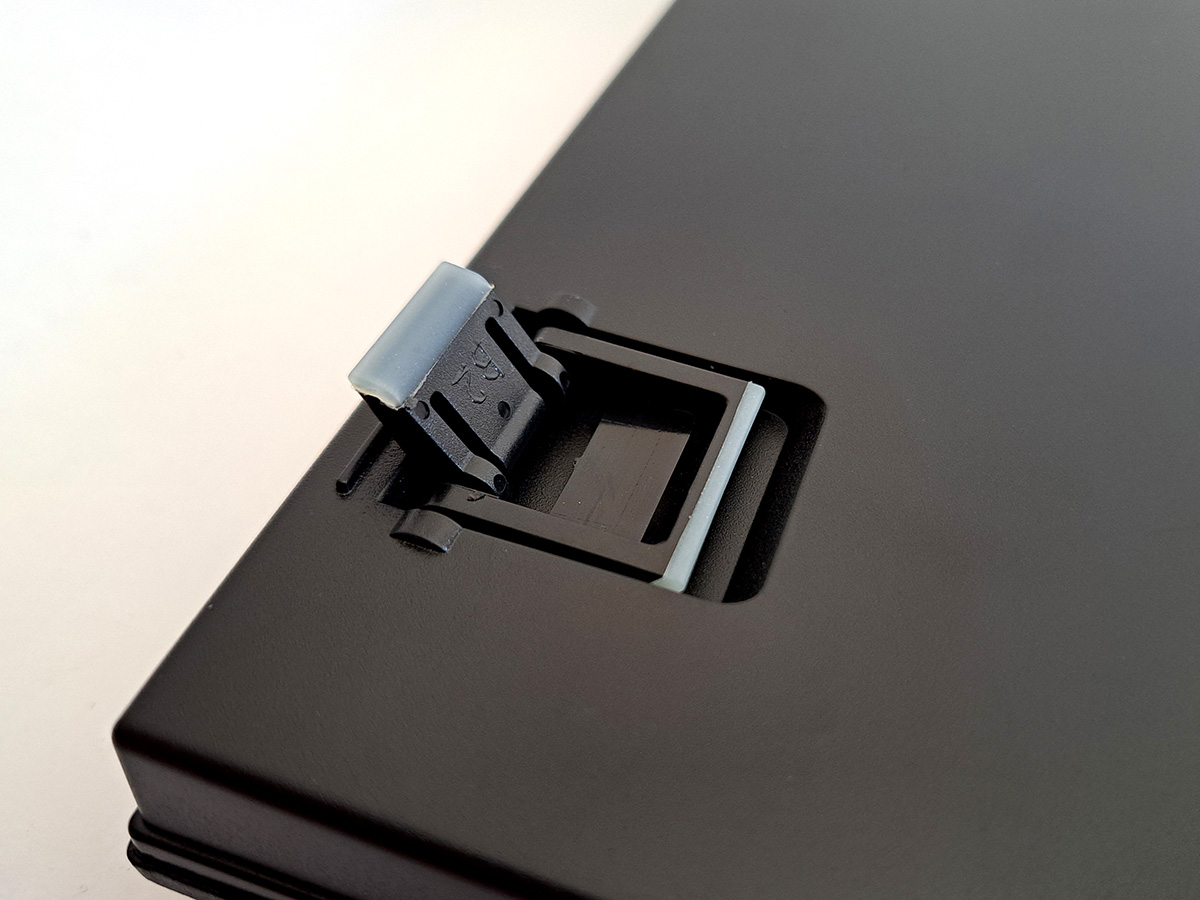 Наклон клавиатуры над поверхностью стола регулируется при помощи двухступенчатых передних ножек. То есть, вы можете поднять задний край клавиатуры на большой или меньший угол. Ножки покрыты нескользящим силиконом, что обеспечивает стабильность даже при небольшом весе корпуса клавиатуры.