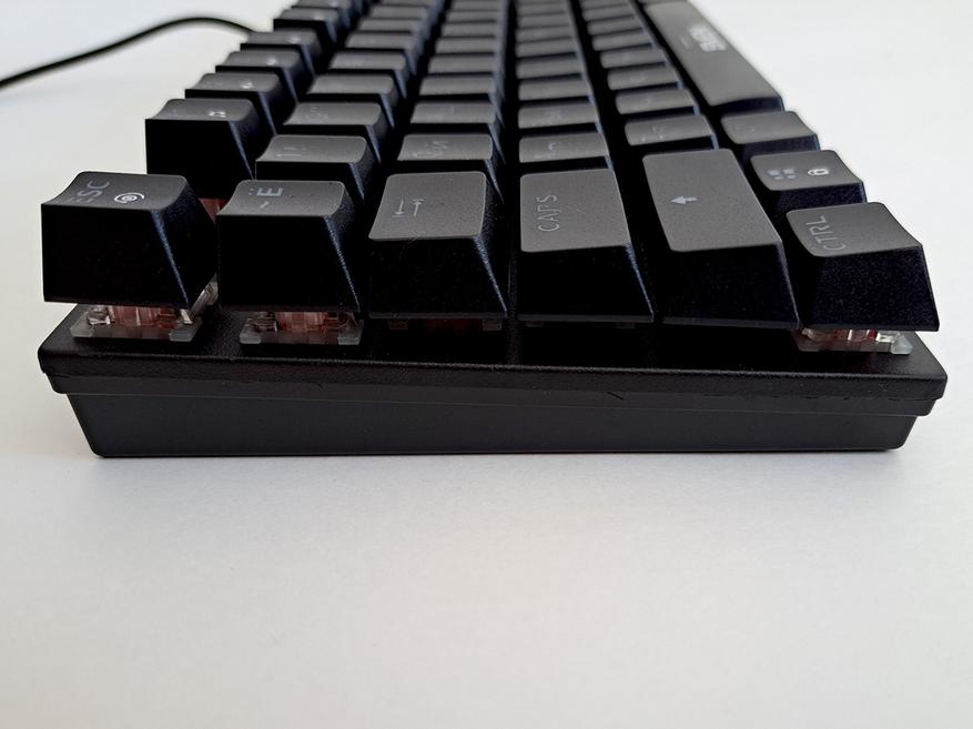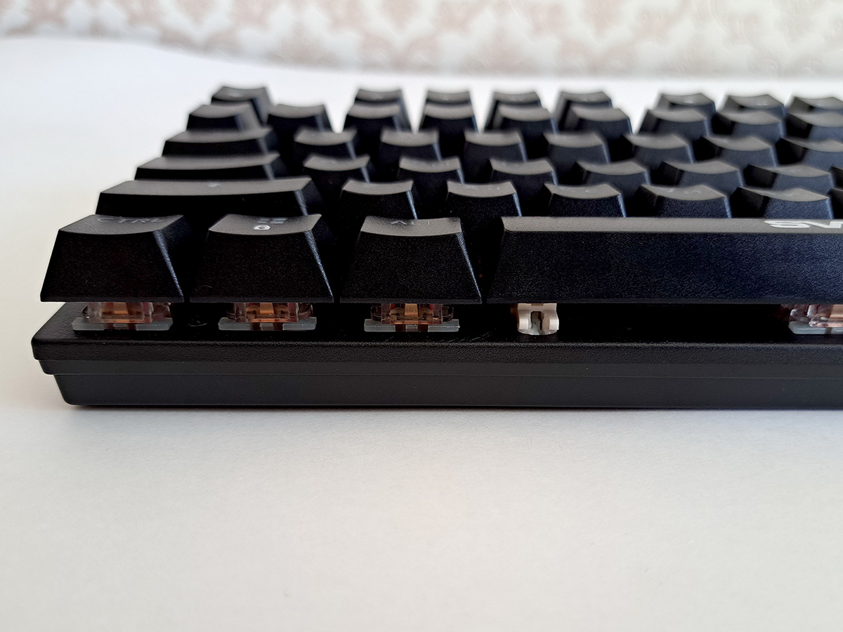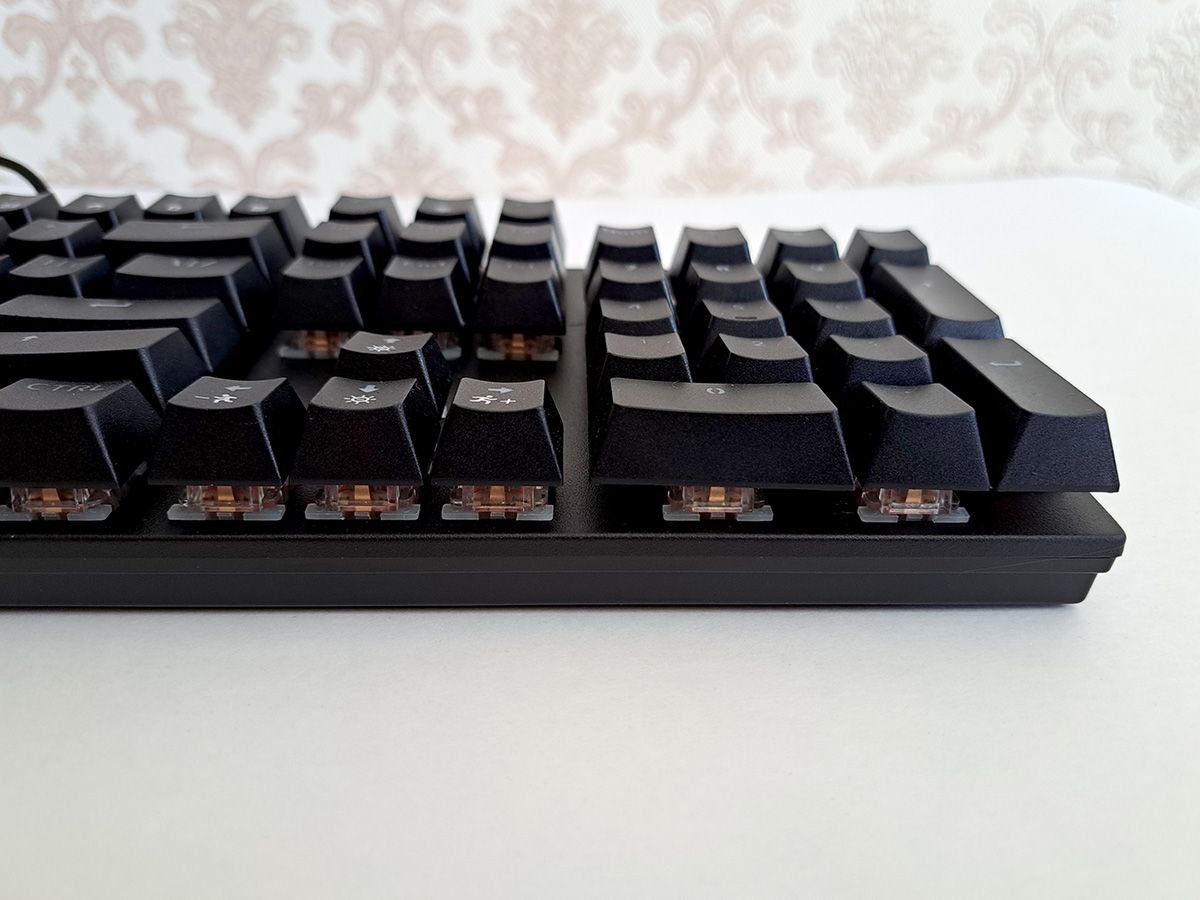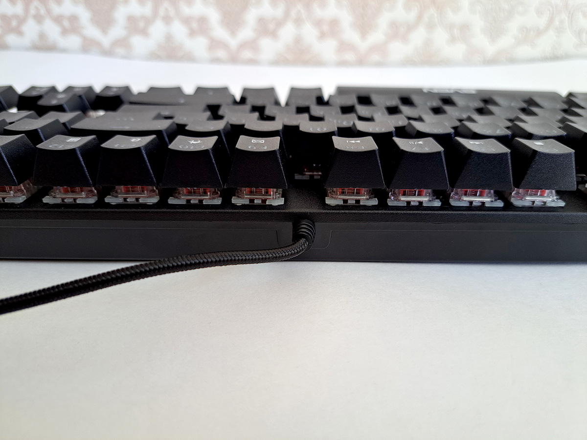 А что же насчет удобства набора? Этот текст набран на героине обзора. Я пересел на нее с другой полноразмерной клавиатуры. И честно говоря: количество опечаток увеличилось, так как эта клавиатура, хоть и короче буквально на 3 см, но ощущается более «тесной». Но в среднем, ничего страшного. Чувствую, 2-3 часа адаптации, и все будет хорошо. Звук от набора довольно громкий. Но стоит понимать, что это бюджетная механическая клавиатура, и чудес тут ждать не стоит. Тут важнее следующее — все клавиши четко срабатывают на нажатия, что действительно важно как для офисной работы, так и для игр.