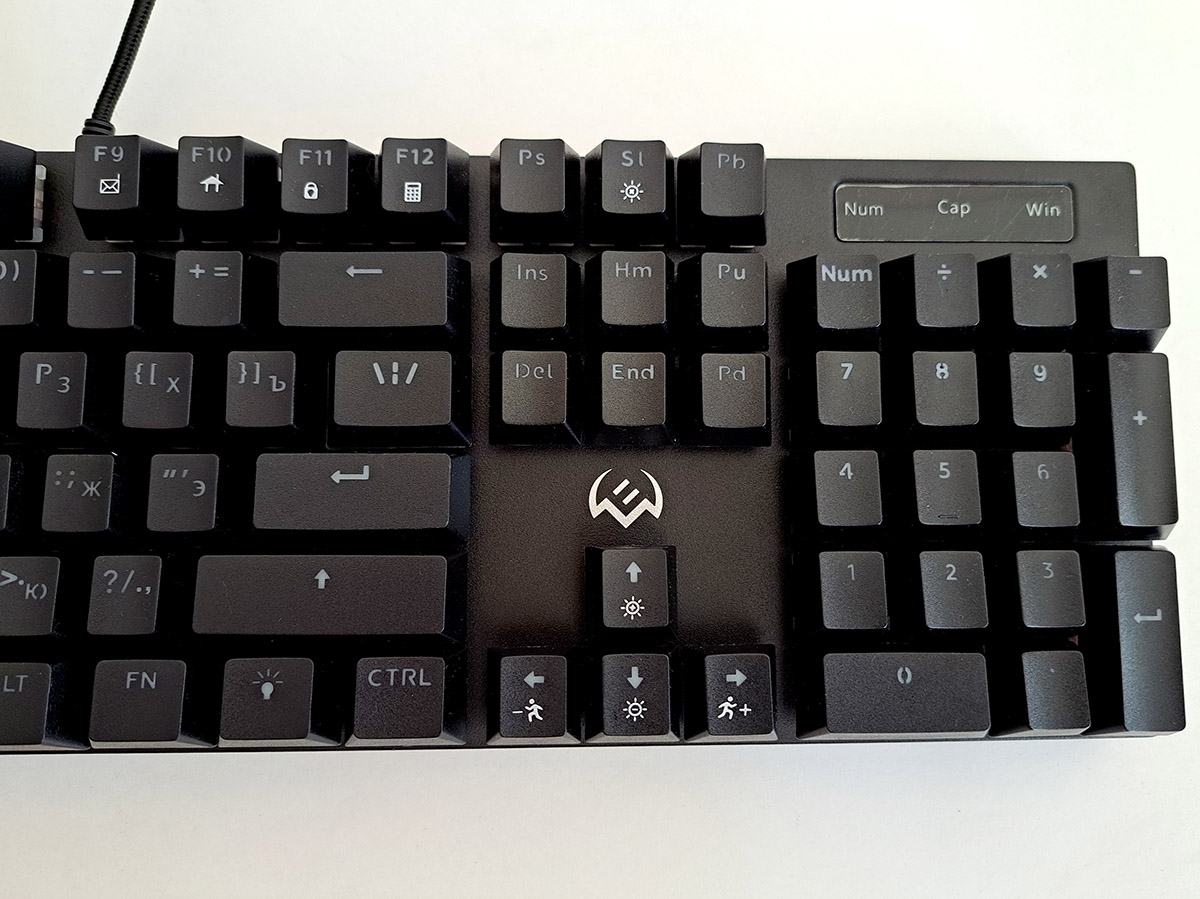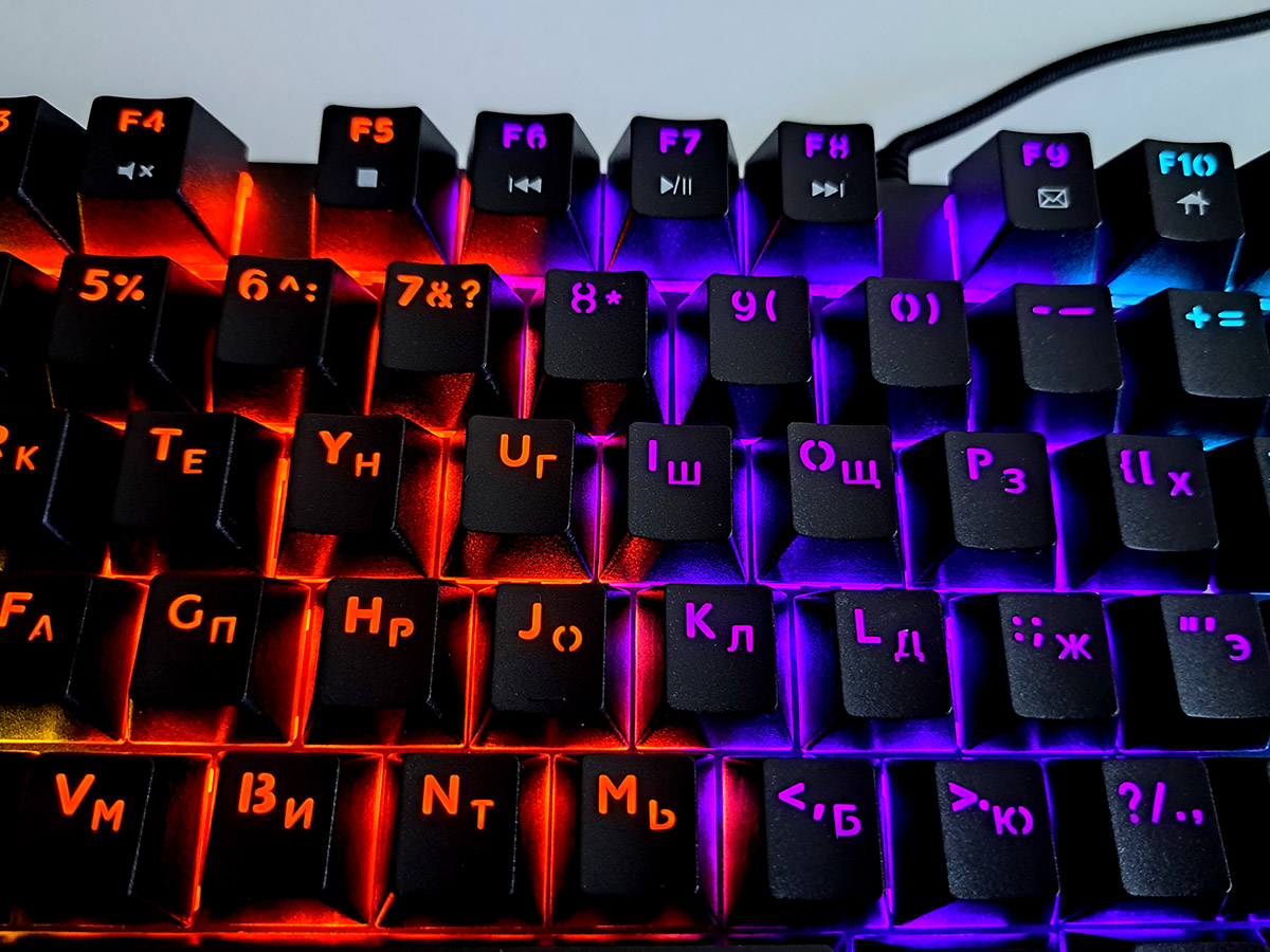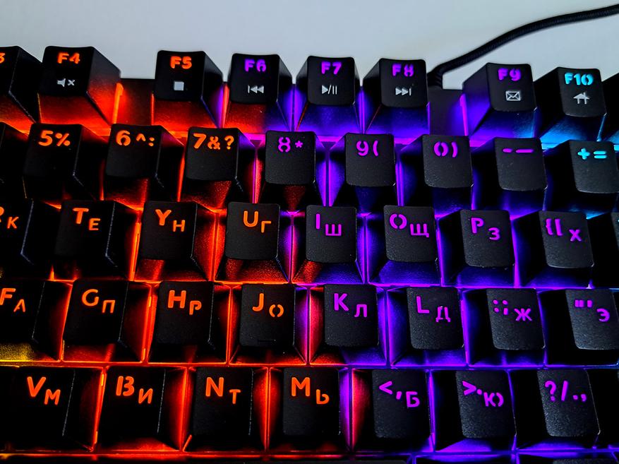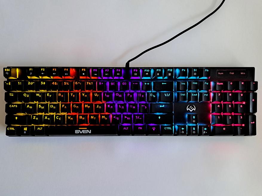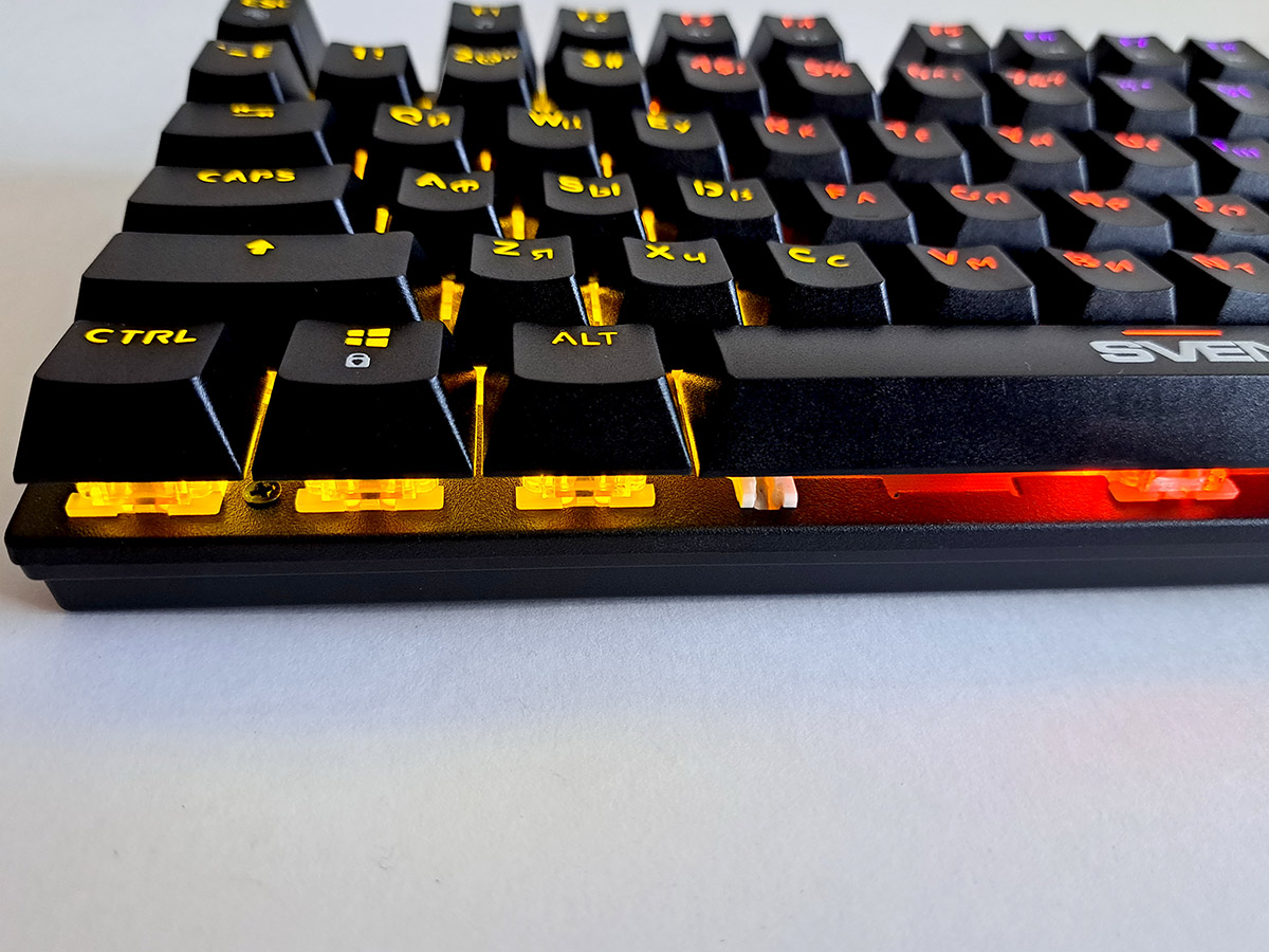 У клавиатуры присутствует яркая подсветка всех клавиш. К сожалению, она не RGB, то есть цвет подсветки изменить нельзя, только яркость. И лично мне больше нравится однотонная подсветка, а не в виде поперечных цветовых полос. Или хотя бы в виде продольных полос, как у Sven KB-G9150 https://www.ixbt.com/live/periphery/obzor-mehanicheskoy-igrovoy-klaviatury-sven-kb-g9150.html. Но это дело индивидуальных предпочтений.