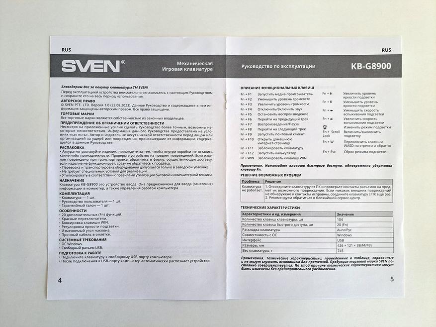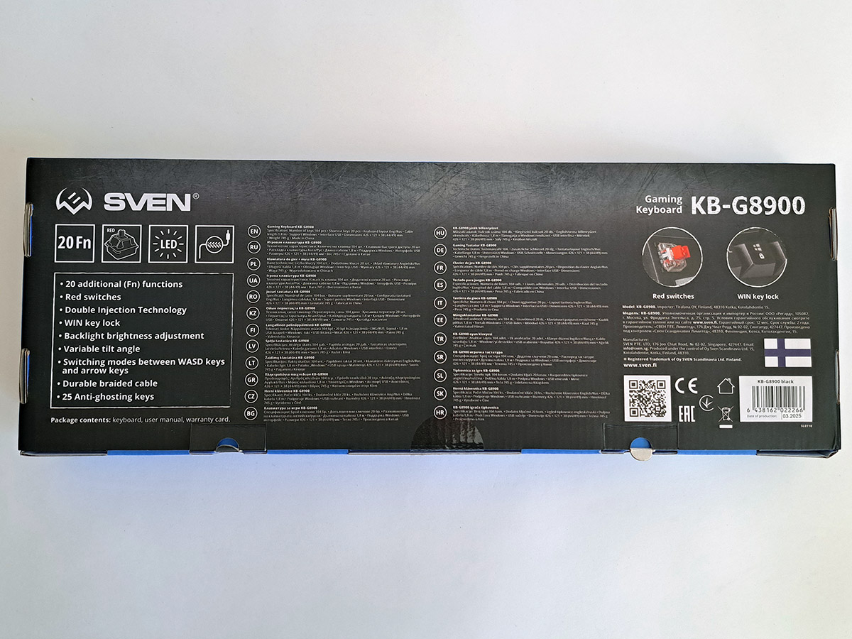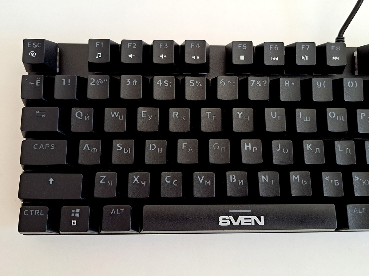 Если подводить итог, Sven KB-G8900 это неплохая бюджетная механическая клавиатура. К минусам можно отнести не очень контрастные символы на клавишах и специфическую подсветку (если вы владеете «слепым набором», то оба пункта несущественны). А к плюсам: полноразмерный формат, красные хорошо работающие свитчи, кейкапы с двойным литьем, наличие 20 функциональных клавиш и длинный качественный кабель в оплётке.