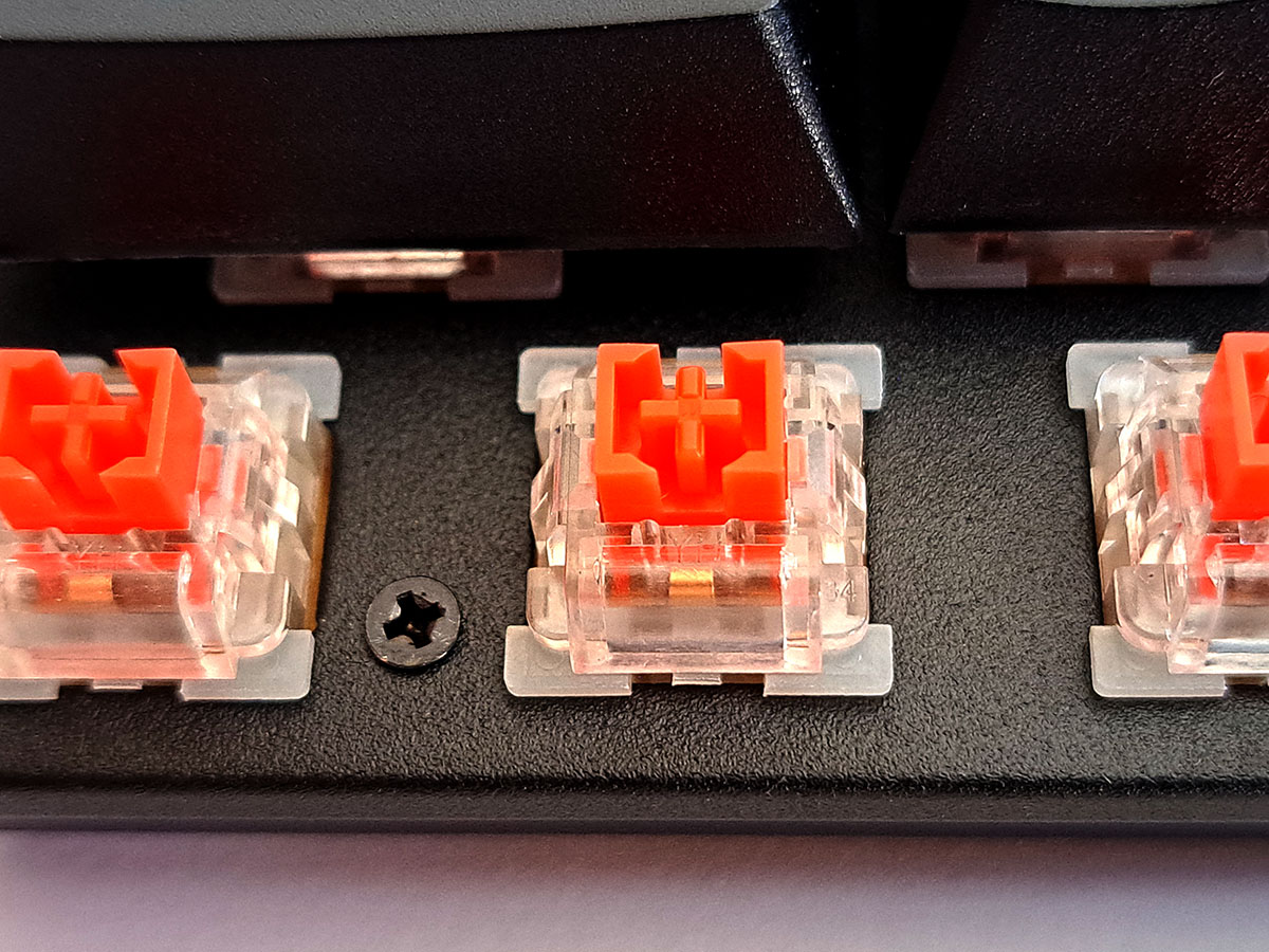 Они тут красного цвета. То есть линейные, без отчетливого щелчка. Обычно, красные свитчи рекомендуют для геймеров. На корпусе переключателей есть маркировка YH.