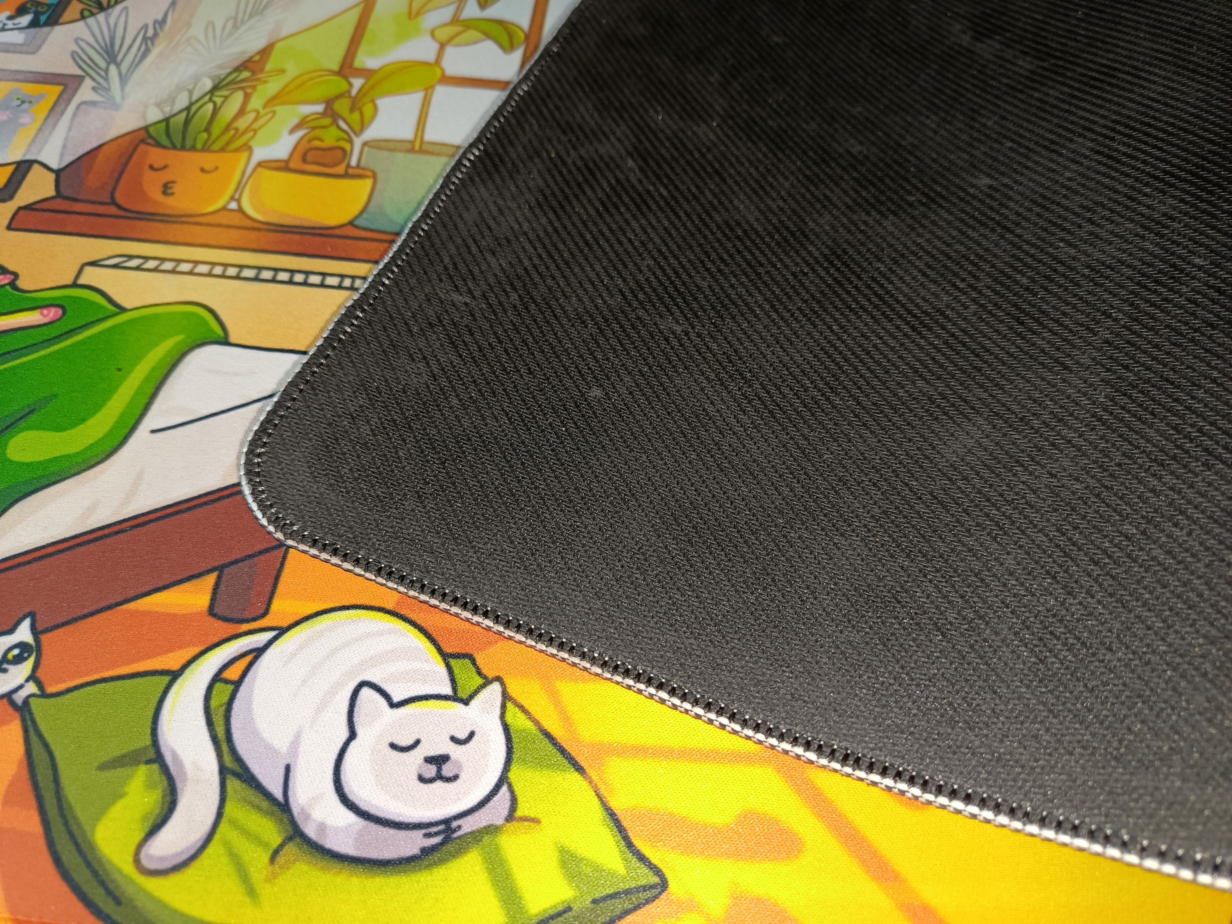 Коврик выполнен из прочного текстильного покрытия с аккуратно прошитыми краями, что предотвращает его расслоение и износ со временем. Нижняя часть прорезинена, благодаря чему коврик надёжно фиксируется на столе и не скользит даже во время активного использования.
