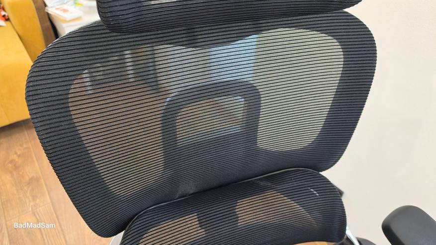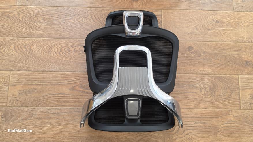 Основная часть спинки построена вокруг жесткой рамы с крупным вырезом по центру. Этот элемент сразу притягивает внимание, и по нему хорошо читается, как распределяется нагрузка. Сетка натянута вокруг этой рамы и разделена на несколько зон. В верхней части она натянута плотнее, ниже уже работает немного иначе. Из-за этого поверхность не выглядит плоской, появляется объем и рельеф.