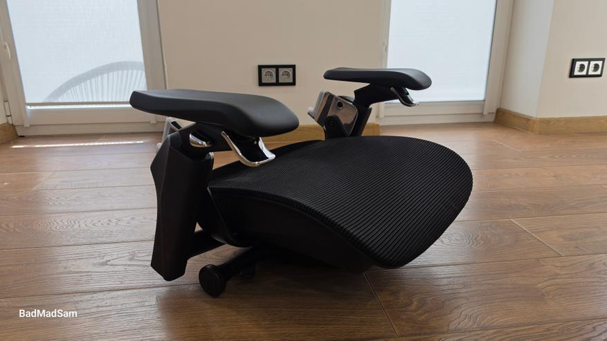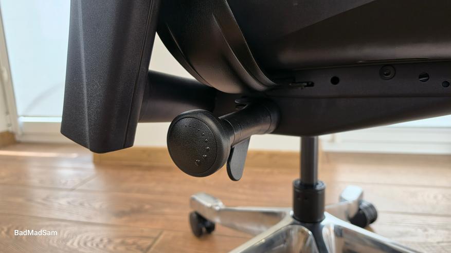 С механизмом наклона сначала не все очевидно. Привычного сценария, когда выбрал угол и зафиксировал, здесь нет. Спинка фиксируется только в базовом положении. Дальше можно задать максимальный угол отклонения переключателем под сиденьем справа и настроить усилие. В первые часы это раздражает, потому что пытаешься сделать как обычно, а не получается. Потом просто перестаешь искать фиксацию и начинаешь опираться на спинку, подстраивая усилие под себя. В таком режиме кресло начинает восприниматься иначе, оно не держит тебя в одной позе, а позволяет немного двигаться.