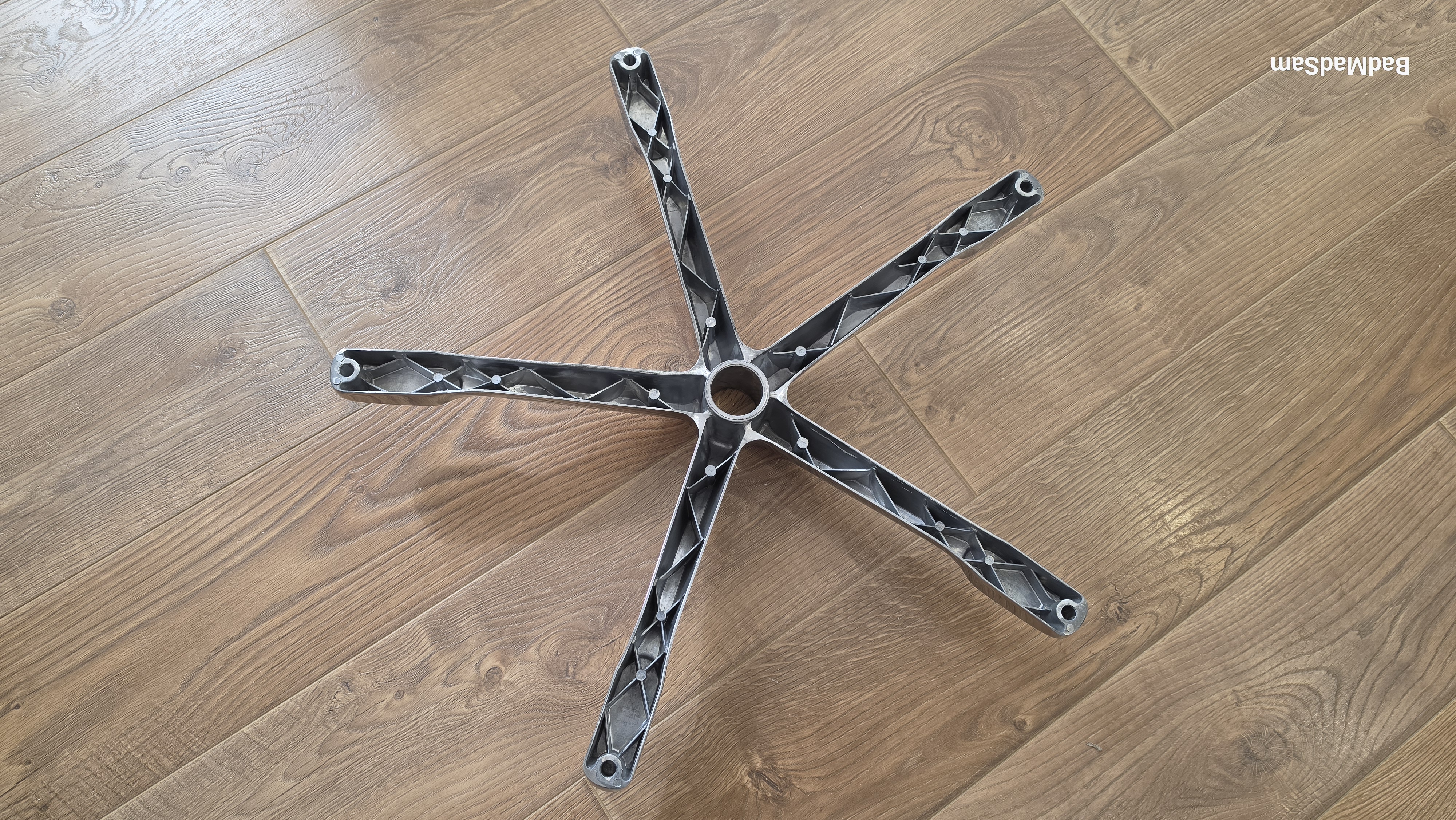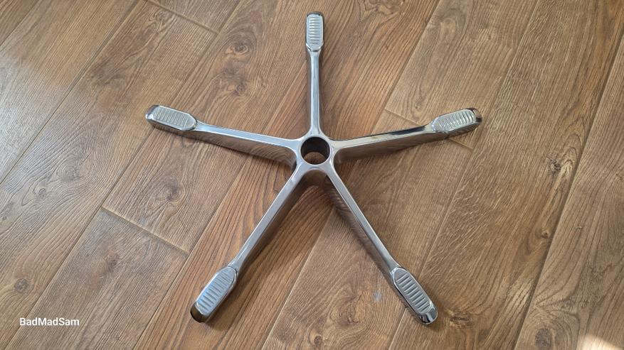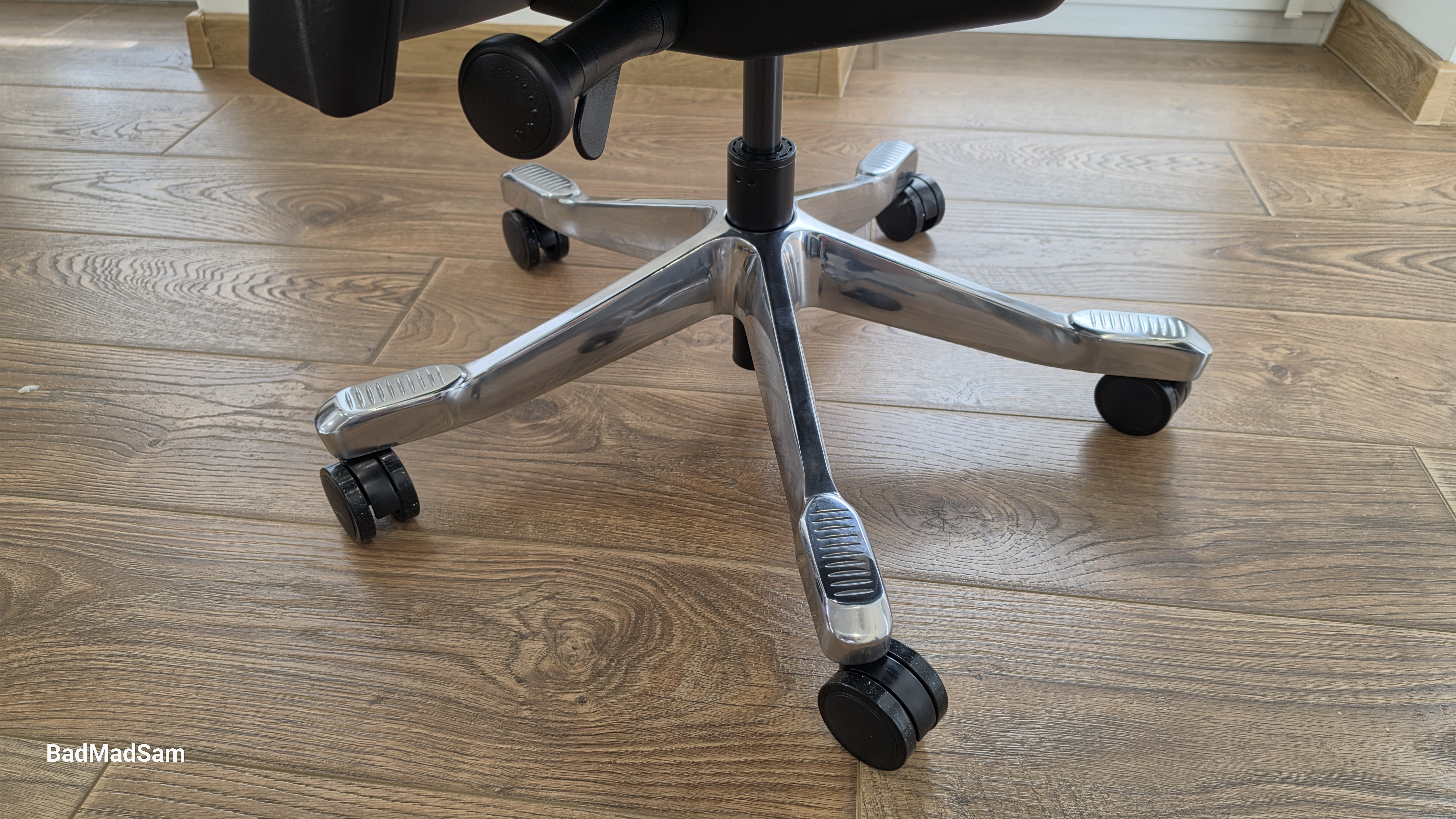 Основание — металлическая крестовина с полированной поверхностью. На фоне темного корпуса она выделяется. Лучи широкие, форма плавная. Колеса диаметром 60 мм смотрятся пропорционально.