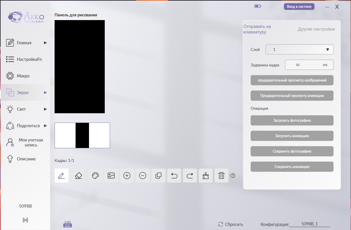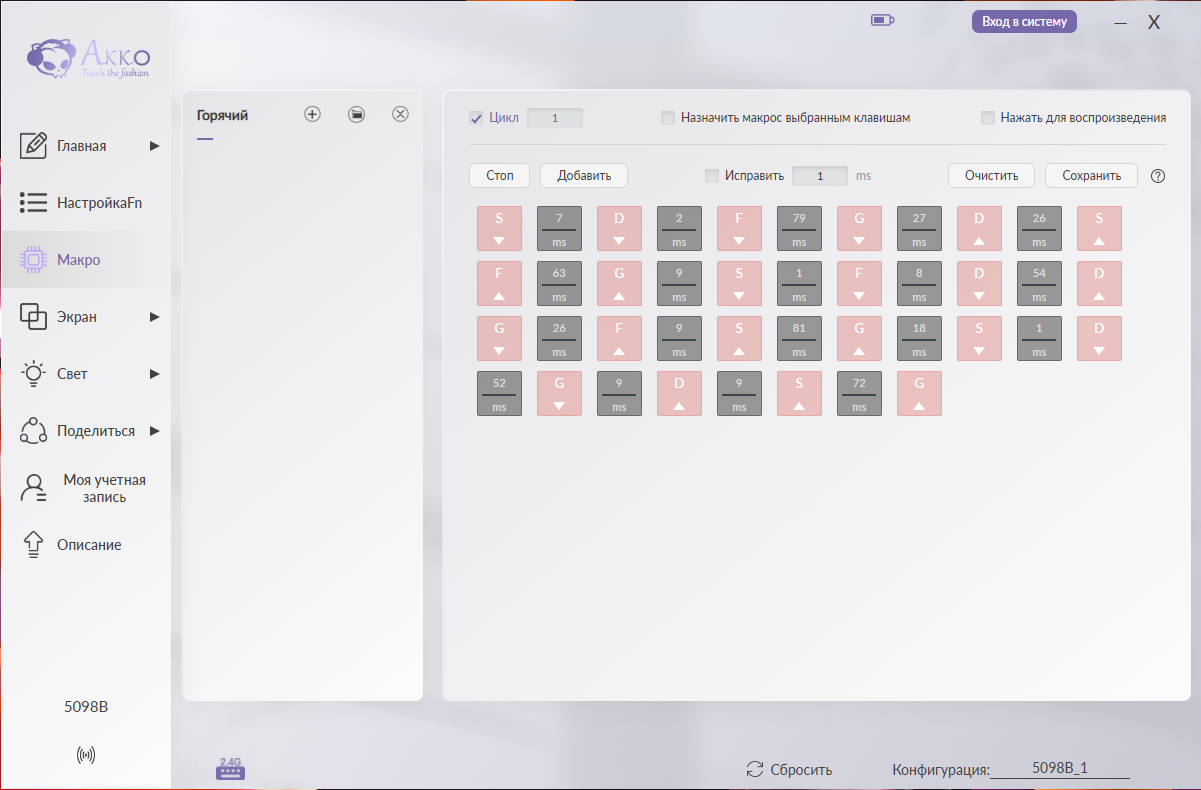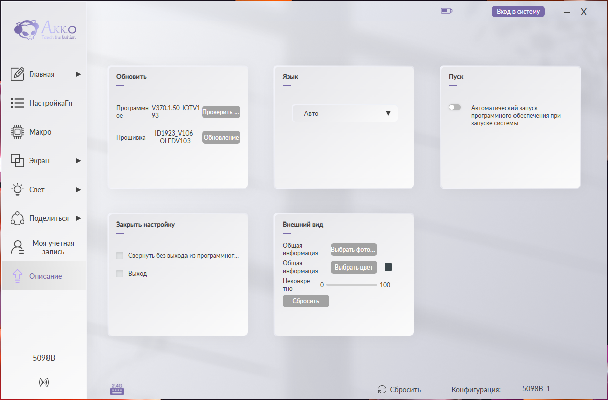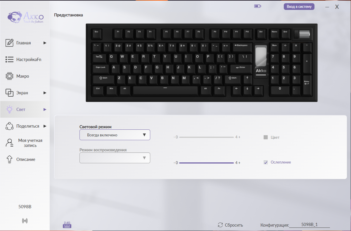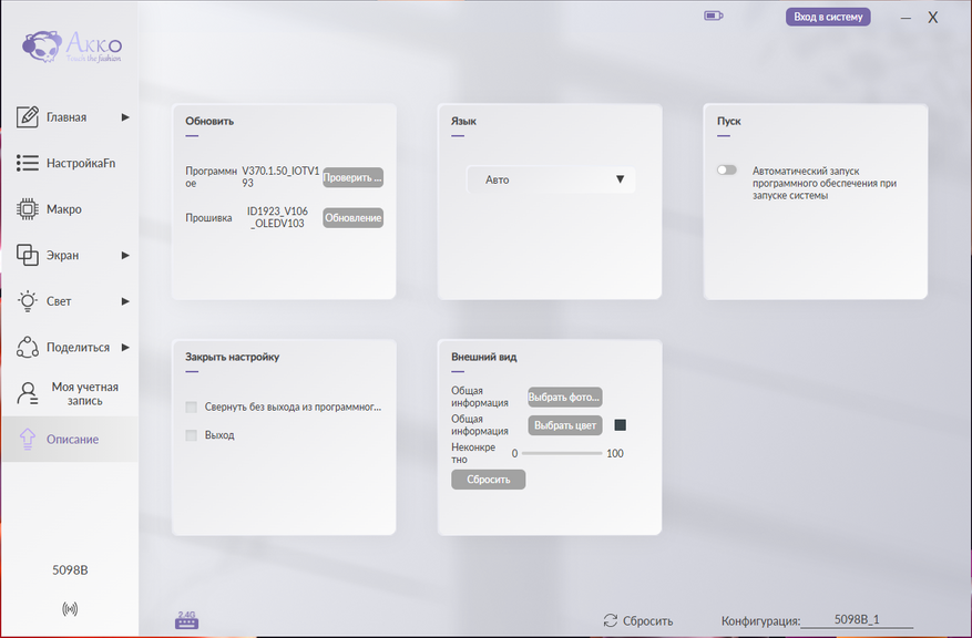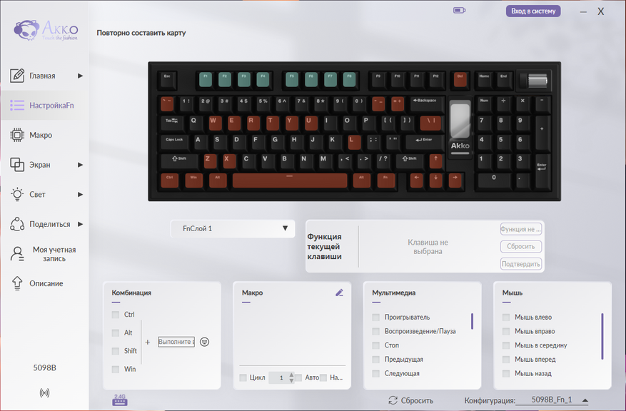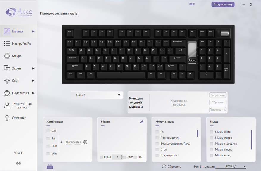 Для полной настройки модели 5098B требуется фирменное программное обеспечение Akko Cloud Driver. Его интерфейс организован в виде тематических вкладок, каждая из которых отвечает за определенный аспект настройки: