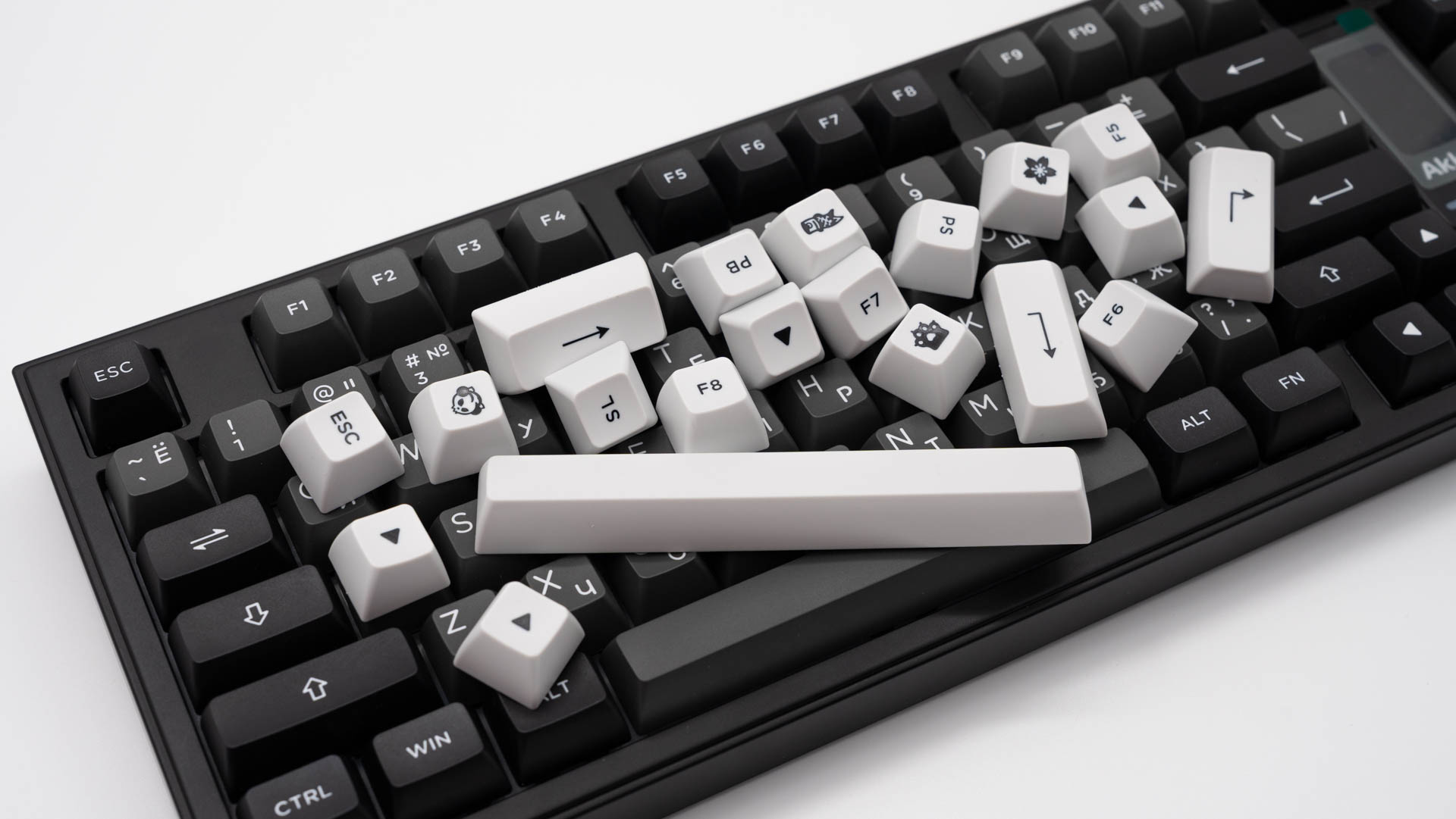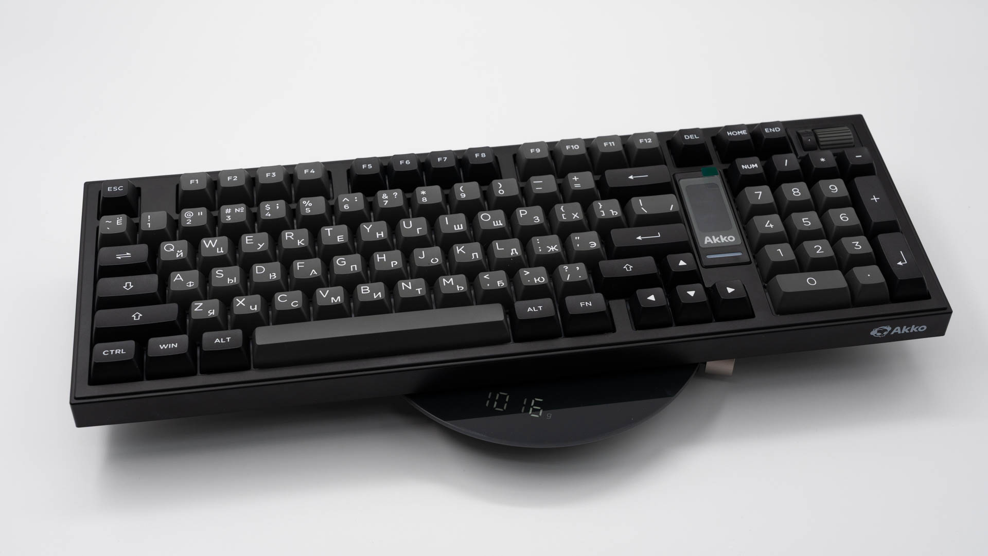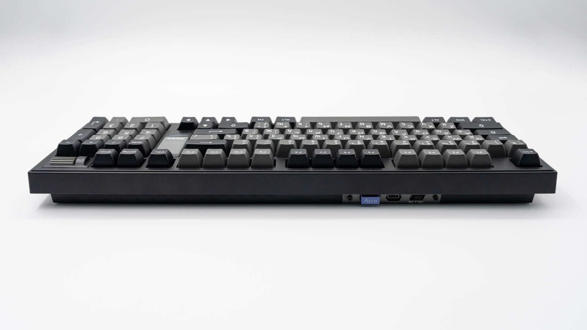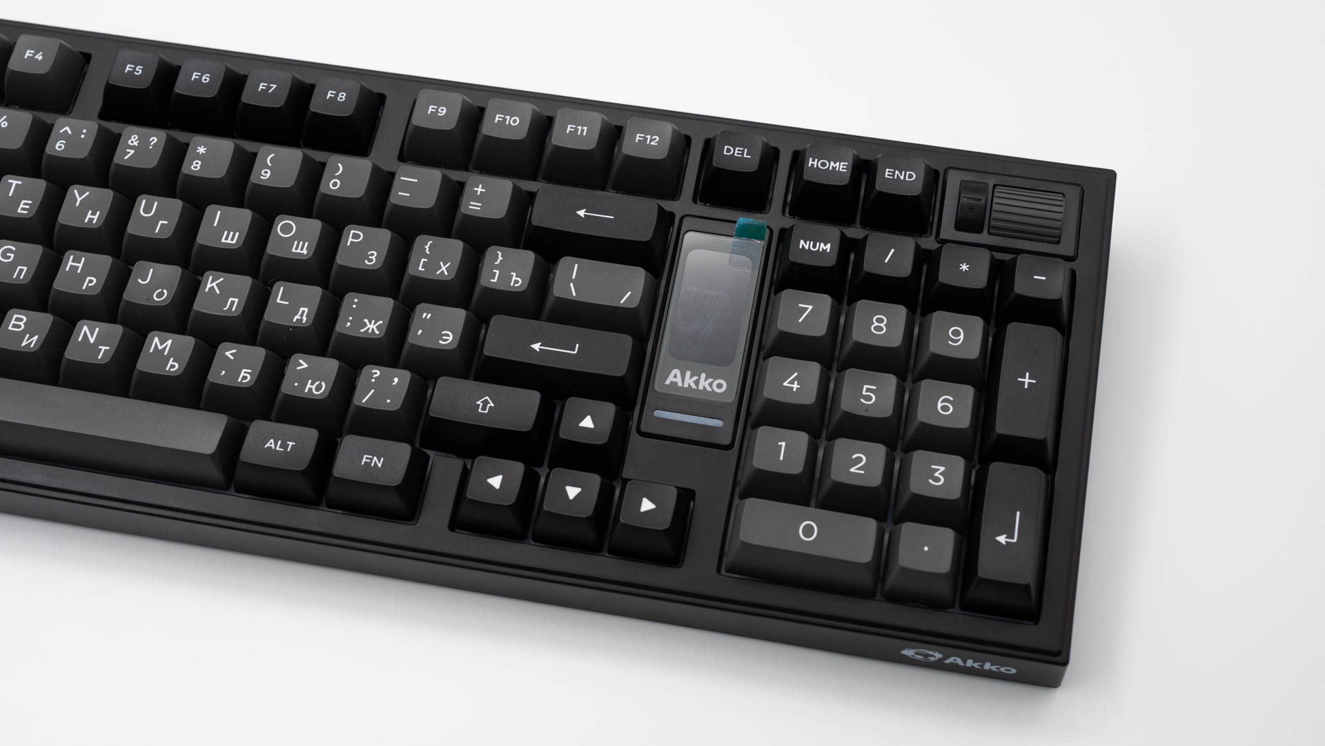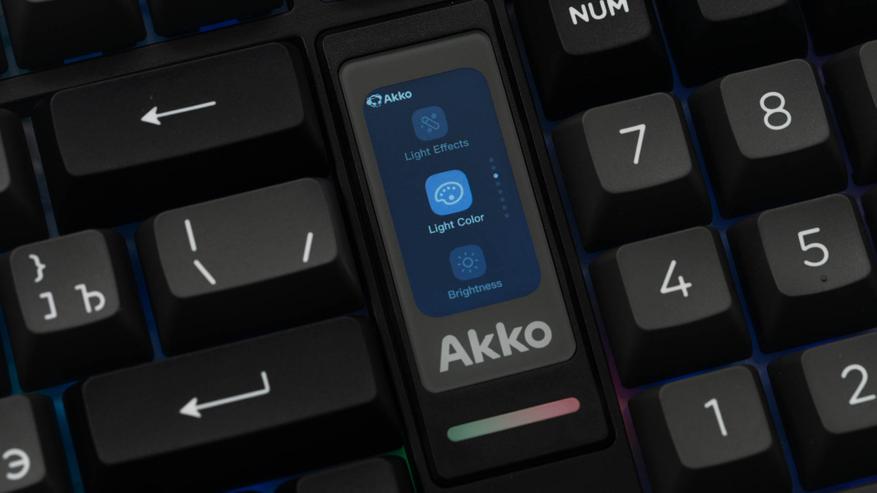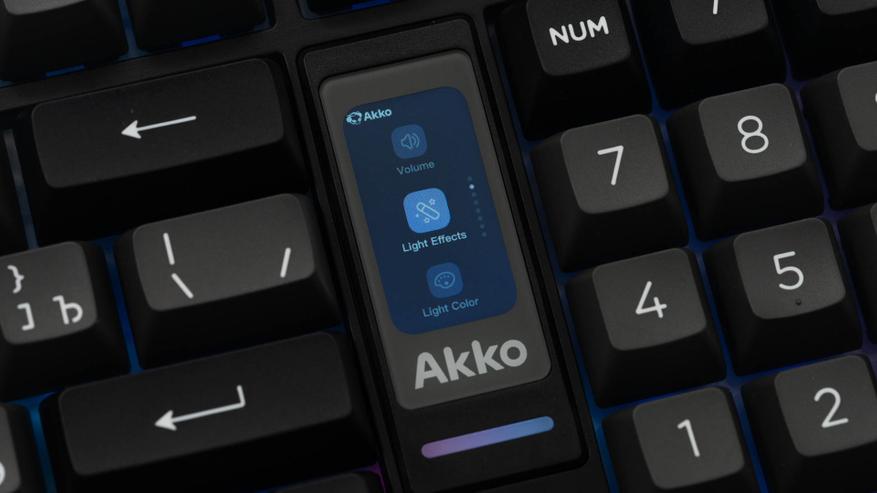 Ключевыми элементами, определяющими облик клавиатуры, стали интегрированный мультимедийный роллер для контроля громкости и 1.47-дюймовый TFT-экран. Размещение этих компонентов потребовало пересмотра традиционной компоновки: клавиши управления (Del, Home, End) интегрированы в функциональный ряд, а такие кнопки, как Ins, PgUp и PgDn, вынесены за его пределы. В результате удалось обеспечить расширенный набор функций, не увеличивая общие размеры.