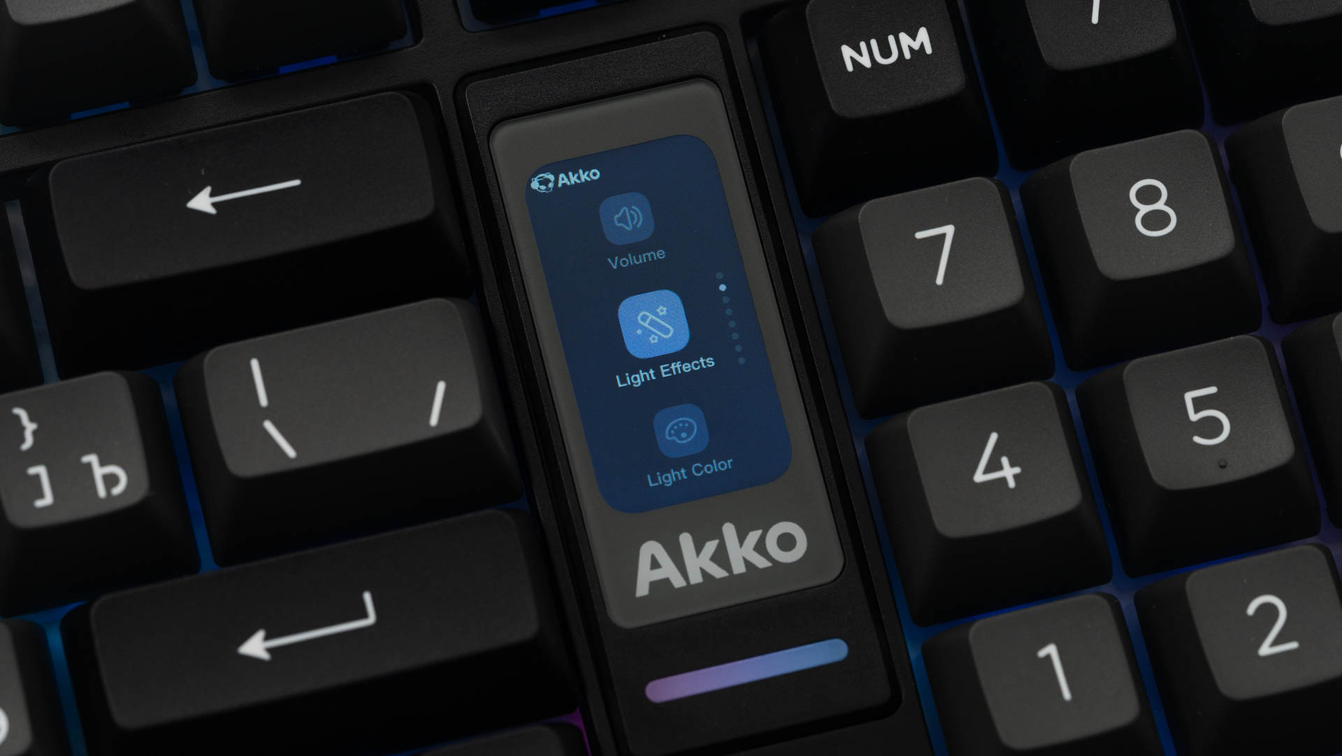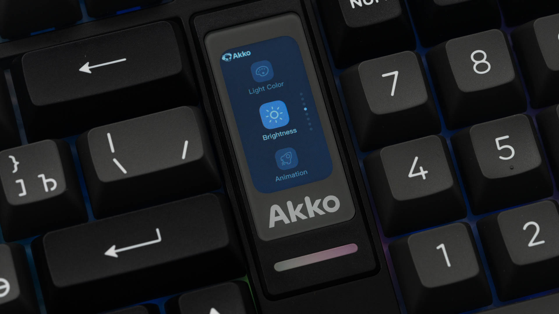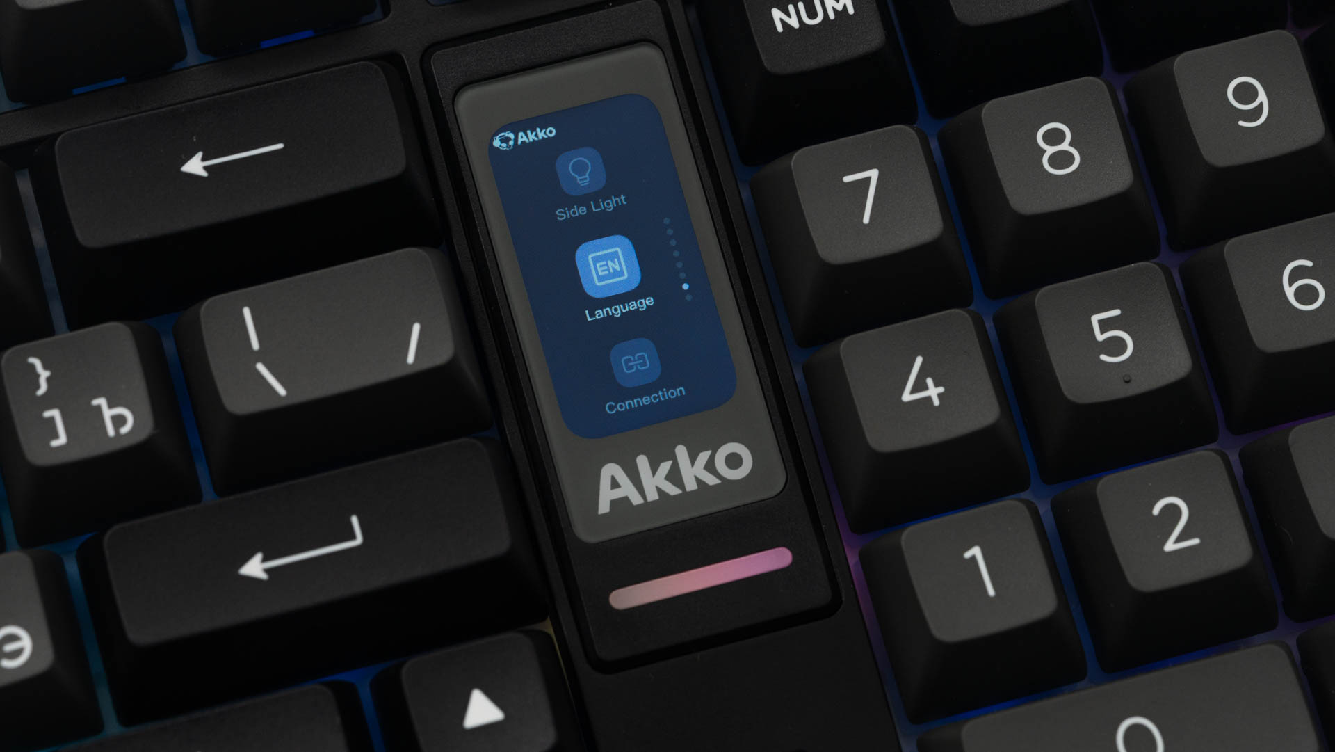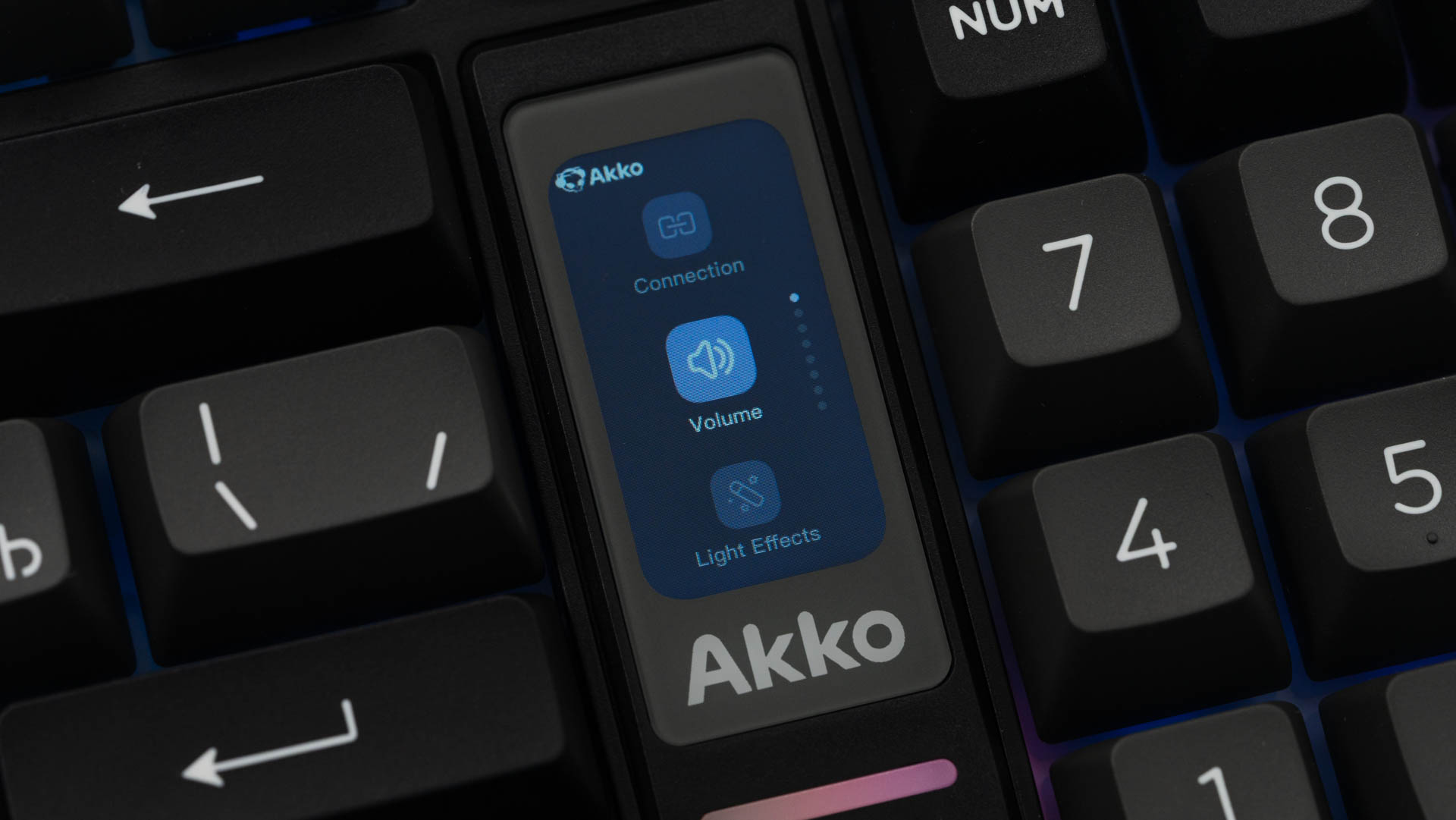 Ключевыми элементами, определяющими облик клавиатуры, стали интегрированный мультимедийный роллер для контроля громкости и 1.47-дюймовый TFT-экран. Размещение этих компонентов потребовало пересмотра традиционной компоновки: клавиши управления (Del, Home, End) интегрированы в функциональный ряд, а такие кнопки, как Ins, PgUp и PgDn, вынесены за его пределы. В результате удалось обеспечить расширенный набор функций, не увеличивая общие размеры.