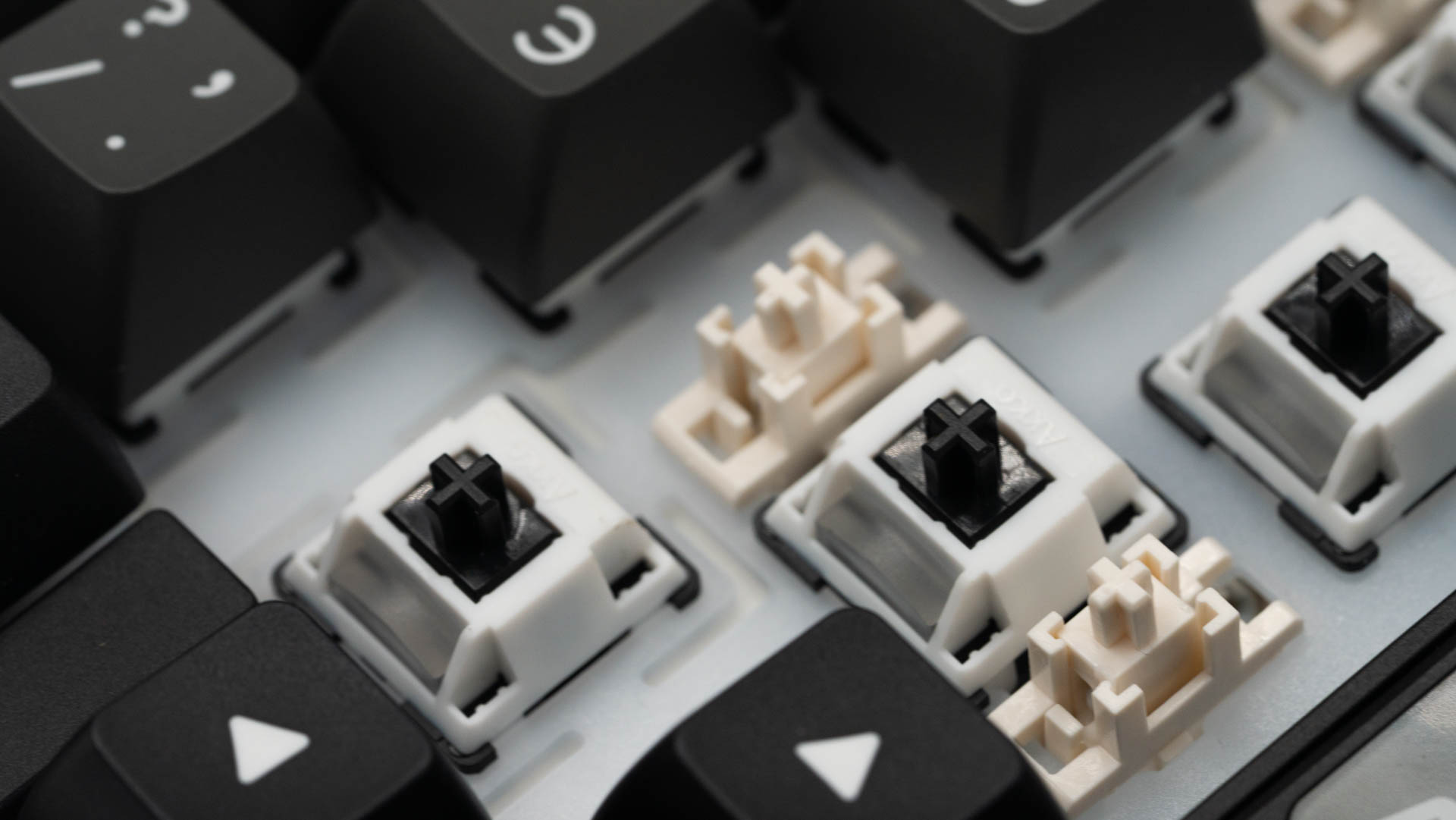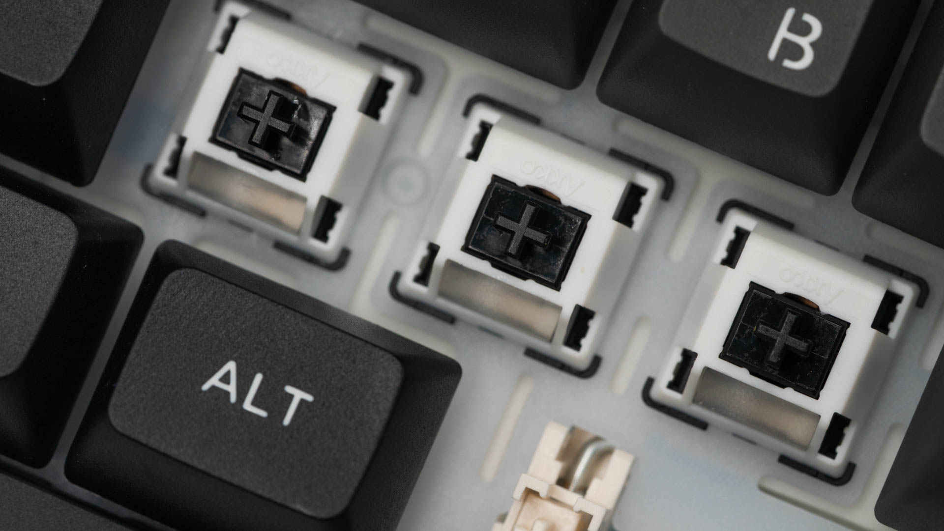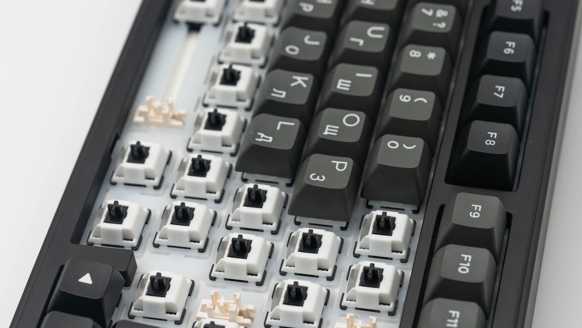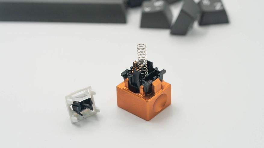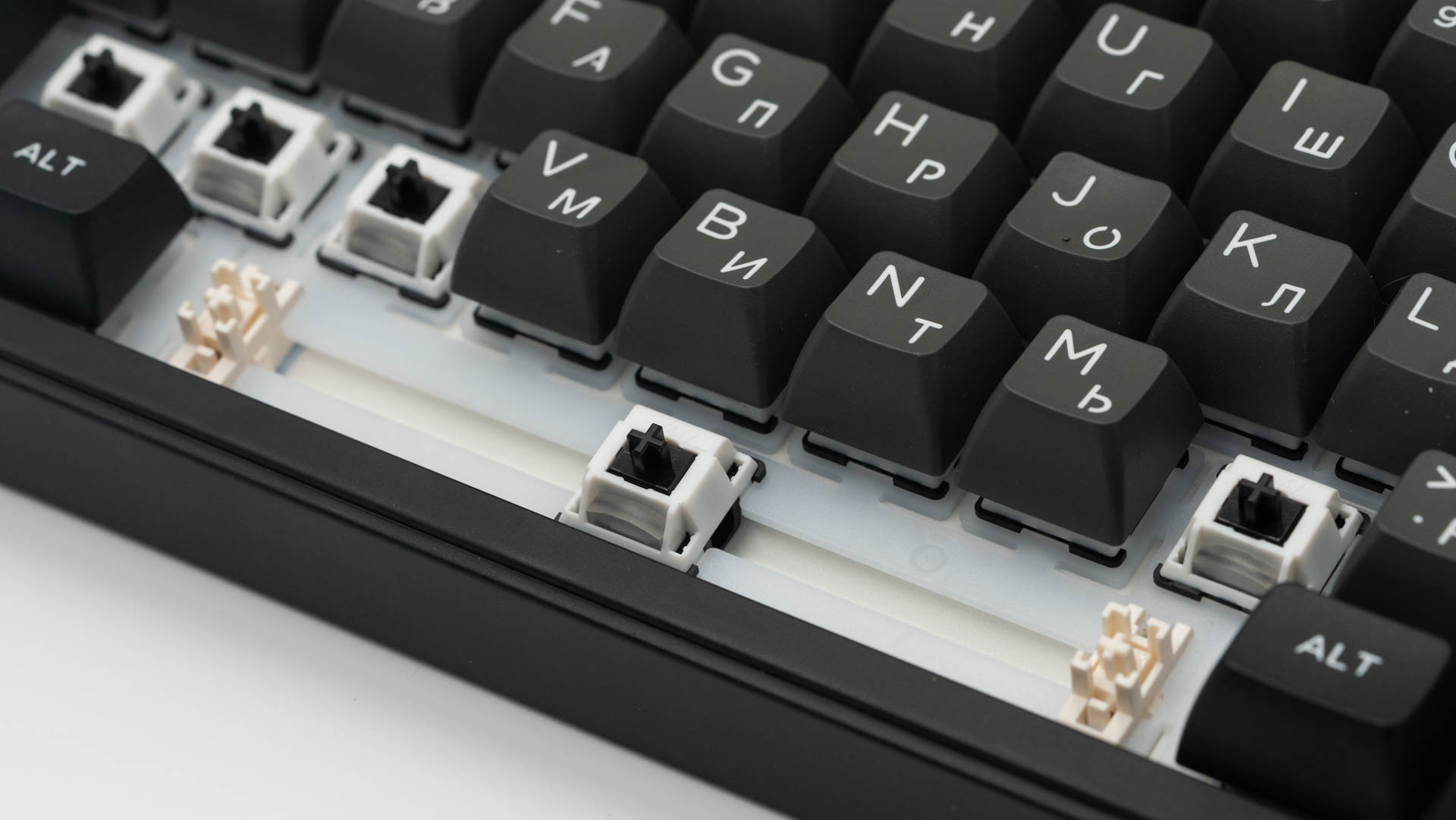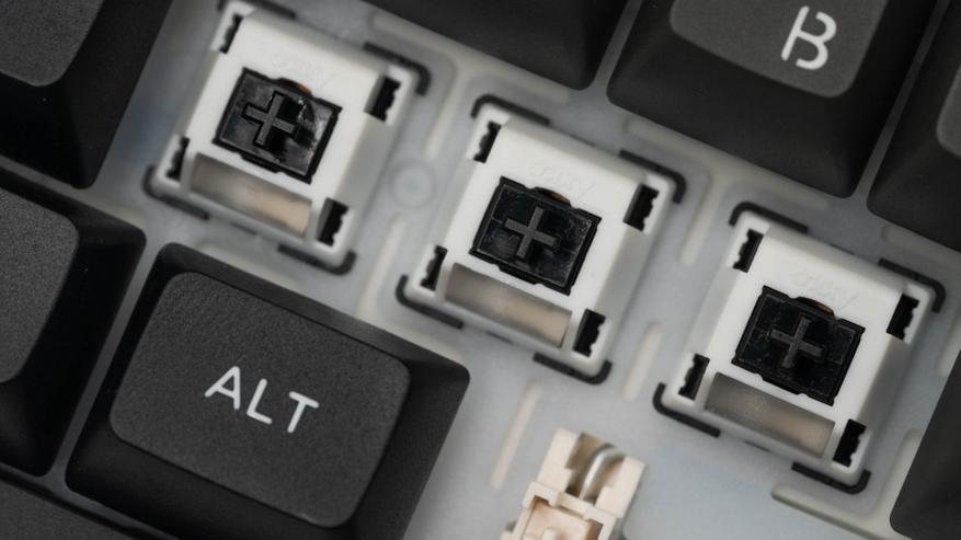 Под съемными клавишами установлены механические переключатели Akko V3 Piano Pro. Они характеризуются усилием срабатывания 45 грамм, общим ходом 3,1 мм и тактильным акцентом на 1,9 мм. По заявлению разработчика, Pro-версия получила предварительную смазку направляющих, что подтверждается разбором одного из переключателей.