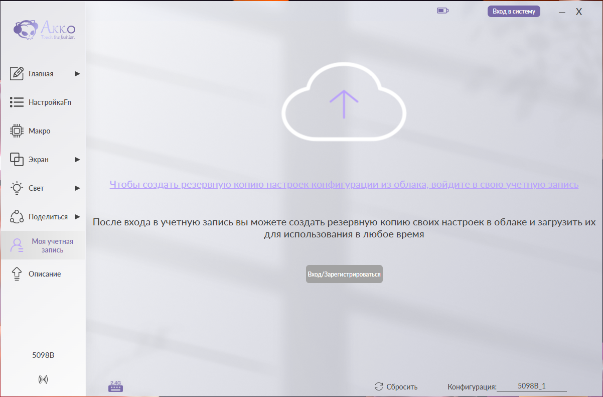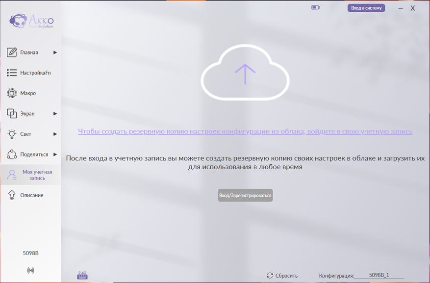 Моя учетная запись: Позволяет создать профиль для сохранения персональных конфигураций в облаке.