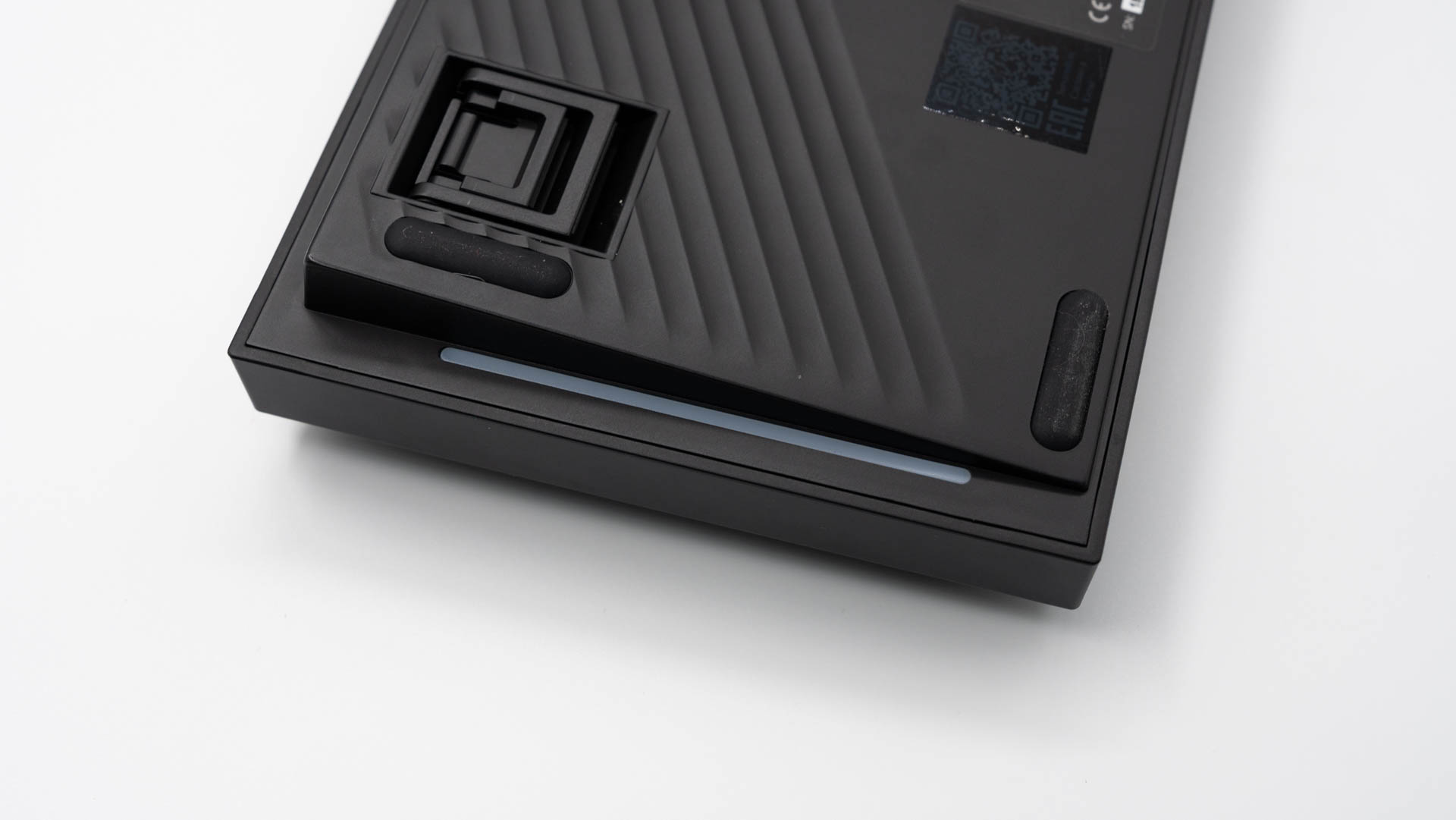 Нижняя панель клавиатуры выполнена с геометрическим рельефным рисунком и дополнен металлической накладкой, которая визуально продолжает тыльную вставку. Для надежного сцепления с рабочей поверхностью предусмотрены четыре прорезиненные опоры.