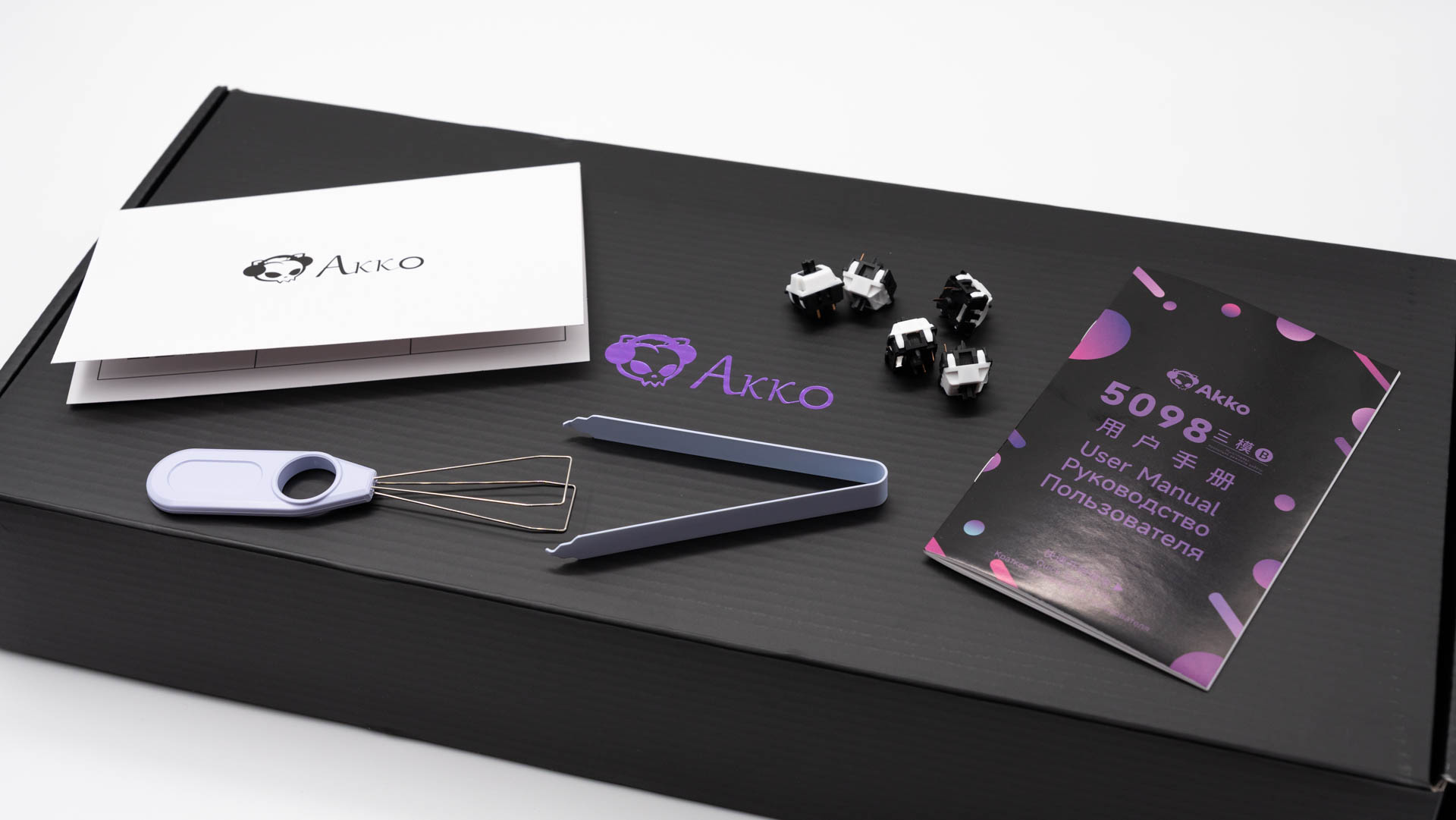 В комплекте, наряду со стандартными аксессуарами (кабель, инструкция, гарантийный талон), пользователь найдёт специализированные инструменты для ухода и кастомизации: съёмники клавиш и переключателей, а также запасные свитчи и кейкапы.