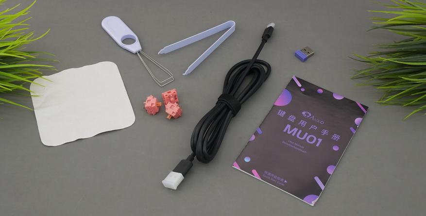 В отдельной черной коробке находится комплектация. Пользователю доступны салфетка из микрофибры, кабель питания, три дополнительных переключателя, руководство, USB-приемник, инструменты для демонтажа кейкапов и свитчей.