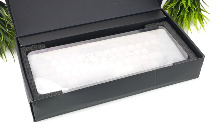 Механическая клавиатура Akko MU01 Mountain Seclusion располагается в тканевой основе и прикрыта пластиковой крышкой. По бокам находится вспененный материал, чтобы при транспортировке устройство не разболталось.