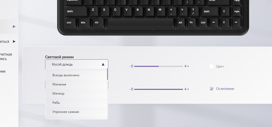 Подсветку клавиатуры я могу назвать чисто номинальной. Из-за плотности компоновки кейкапов типа MOA и самой реализации свечение невзрачное и простое.