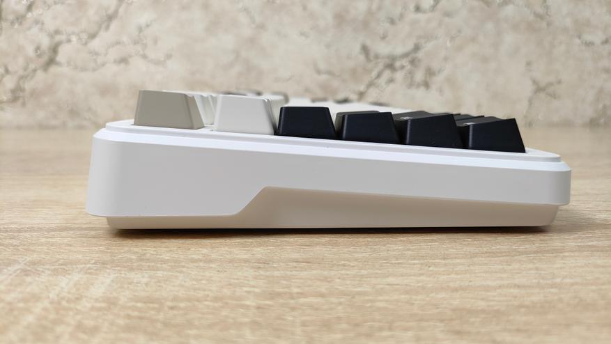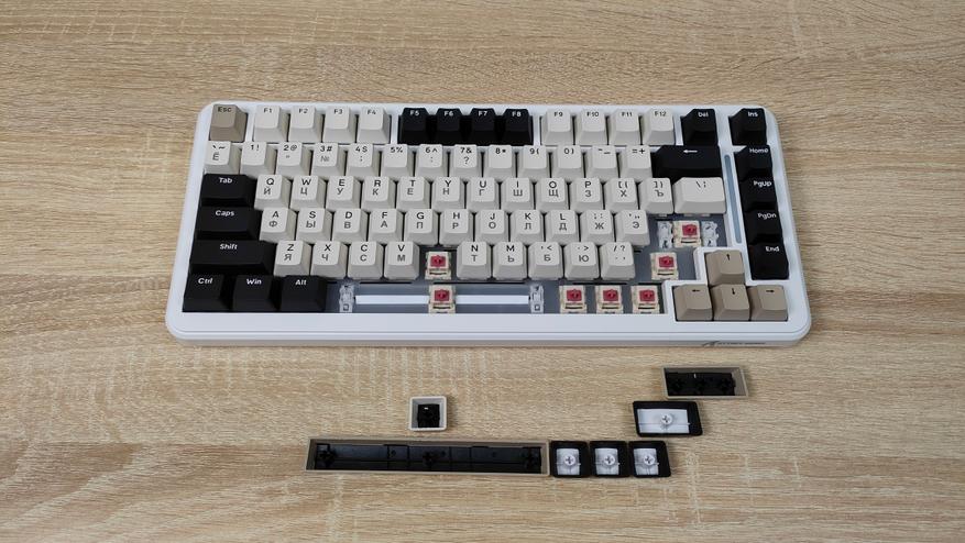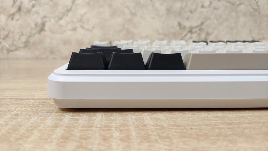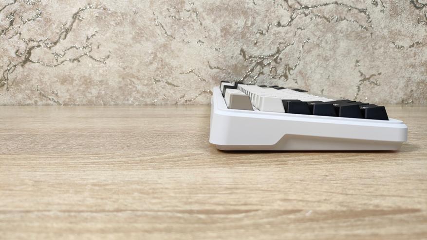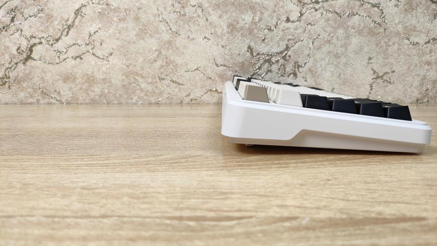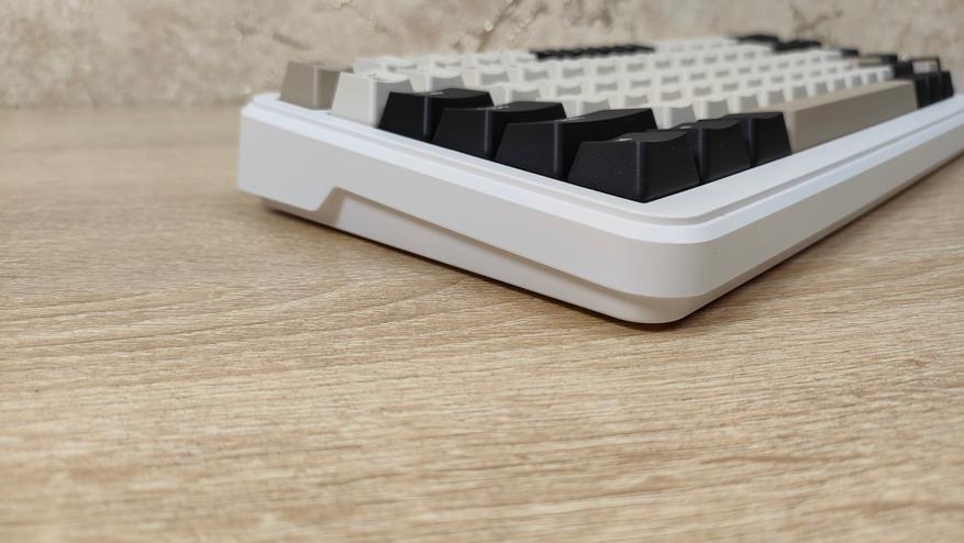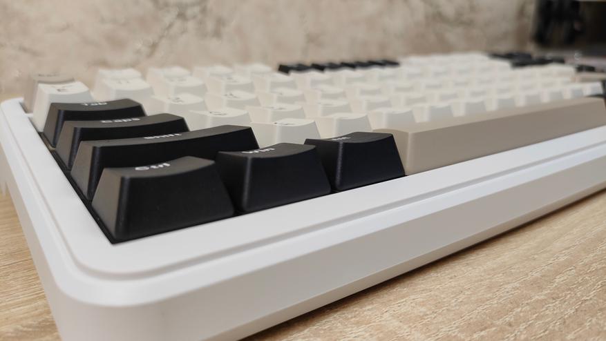 Формат, как уже можно понять меньше чем просто TKL, если быть более конкретным — 75%, ANSI, широкие шифты, одноэтажный Enter. Профиль колпачков OEM, которые, наверное, в каждой третьей клавиатуре, все клавиши, кроме пробела вогнутые.