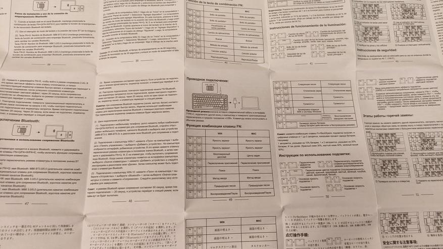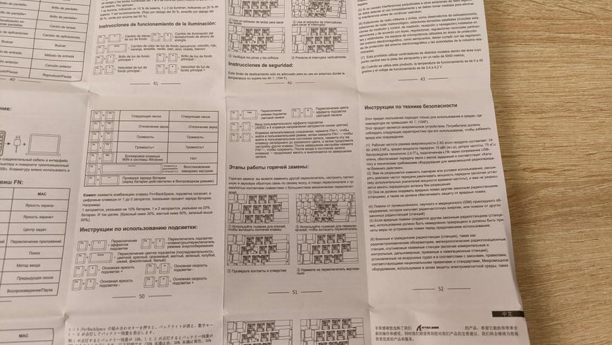 В остальном, всё как и у всех, имею в виду клавиатуру бренда, есть изображение клавиатуры, а также перечислено большое количество фишек и характеристик. Внутри привычный набор: клавиатура, крышка пыльник, кабель для подключения и зарядки, пара переключателей, инструмент для их извлечения, а также колпачков, руководство пользователя.