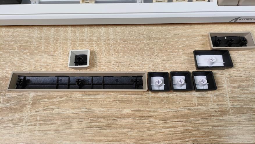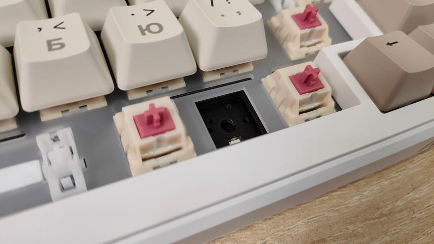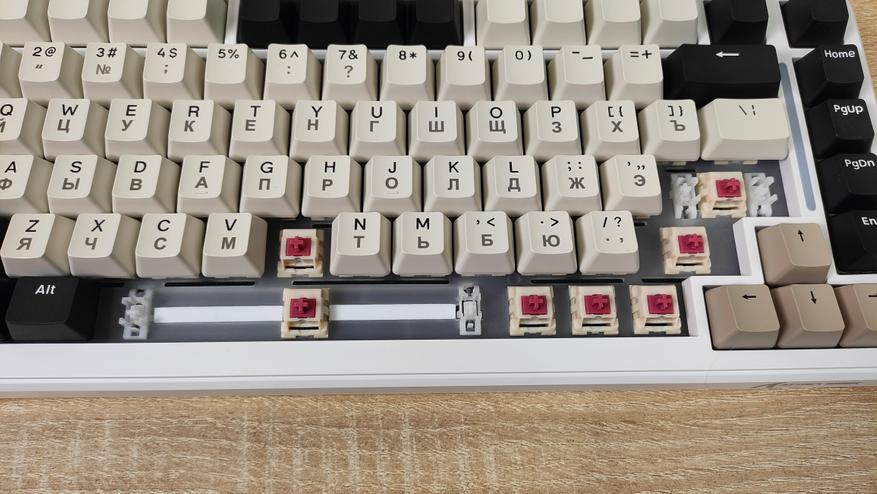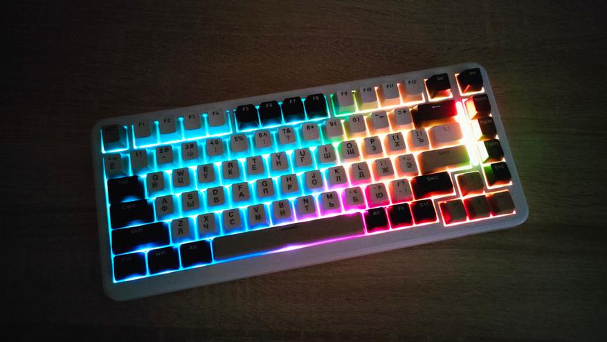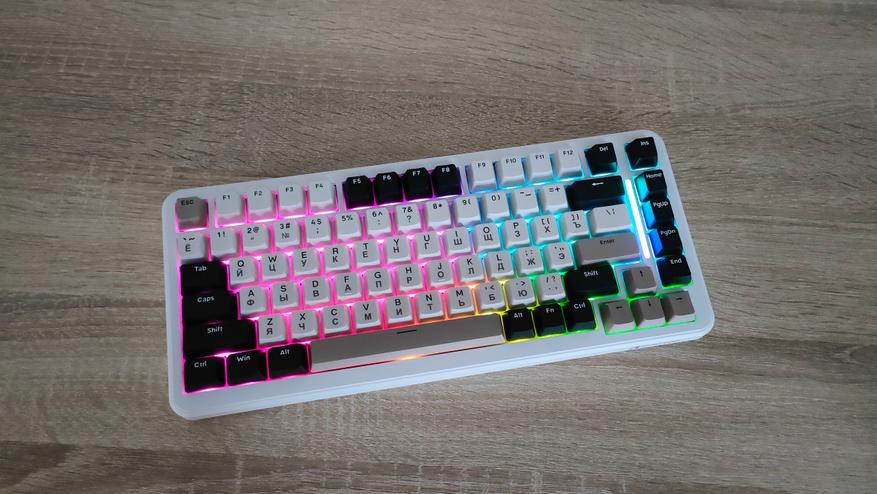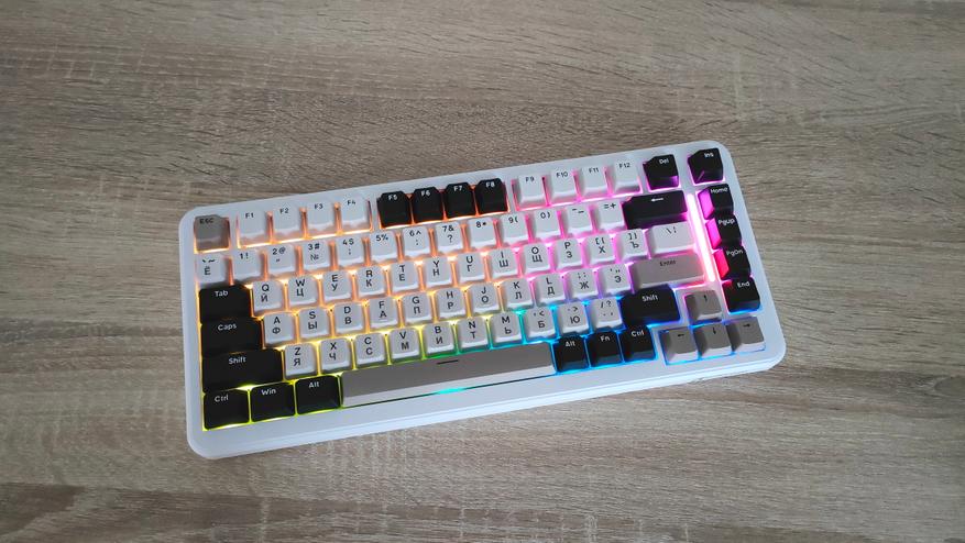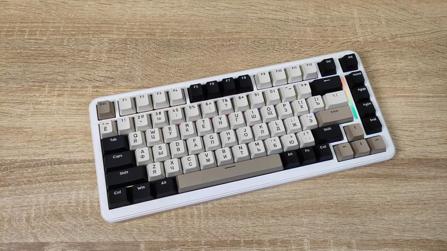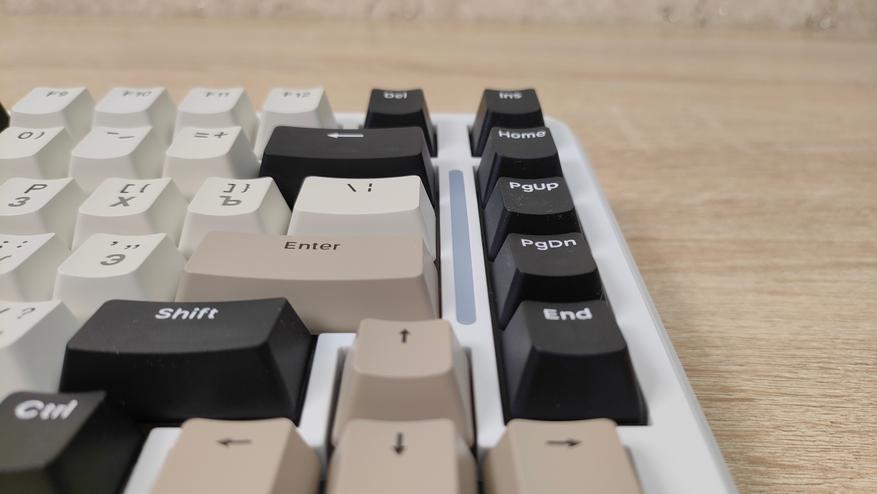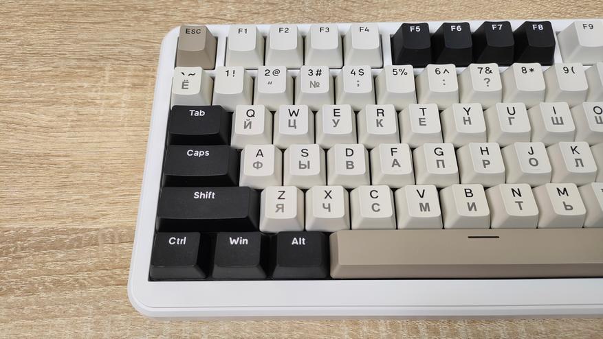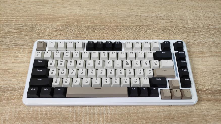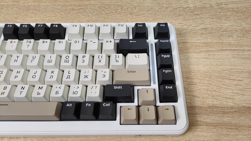 Используемые цвета — это бежевый, коричневый, белый и черный. Вроде по описанию пестрая, но в действительности это не так, хотя черный цвет колпачков несколько выделяется, тем не менее, выглядит она спокойно, никакой кислоты или необычных цветов. Зато гравировку на бежевых колпачках видно отлично, даже чуть лучше, чем латиницу, несмотря на черный цвет, а все потому, что гравировка чуть более барная, за что часто ругают. Устройство, несмотря на близкий индекс сильно отличается от M87, откушено несколько клавиш, а также передвинули светодиодную полоску. Вроде бы и все, но воспринимается клавиатура совсем иначе.