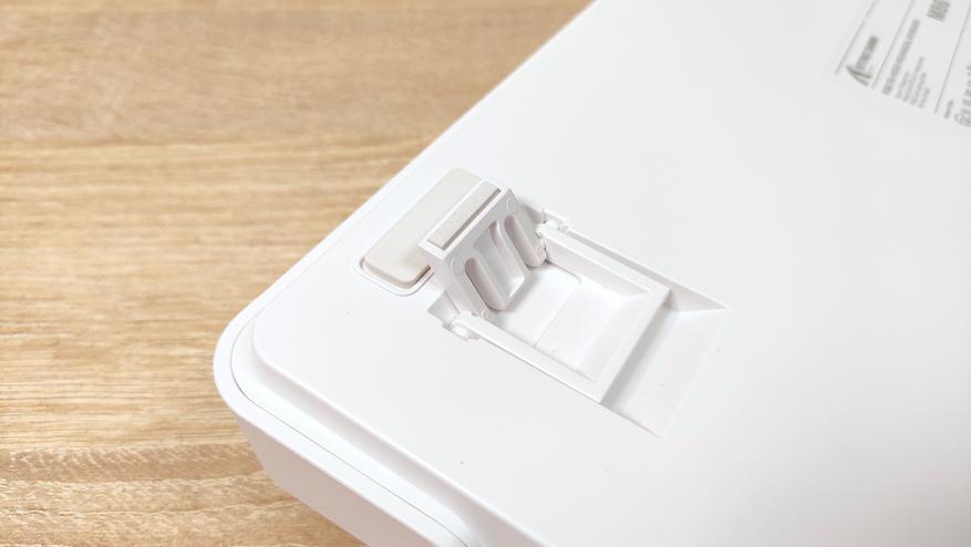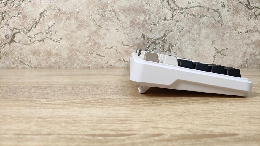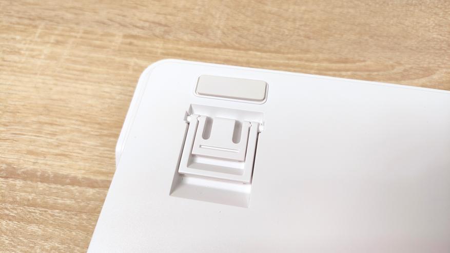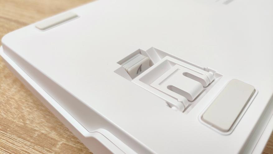 Приемо-передатчик находится в своем кармашке одной из ножек — это по сути единственное, что отличает эту сторону от других клавиатур. Я и раньше встречал такое решение, но оно более редкое, чем любой из торцов. Углов наклона всего три, настроить под себя можно и это хорошо.