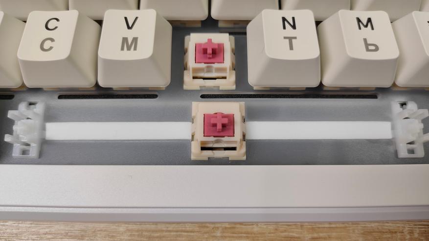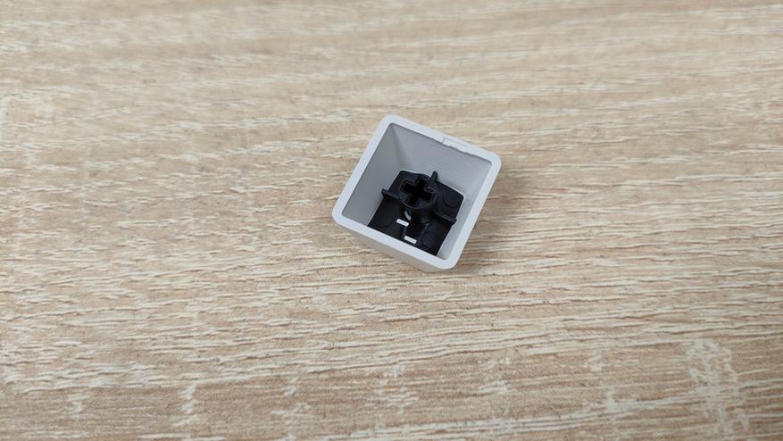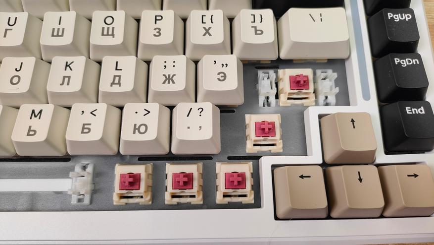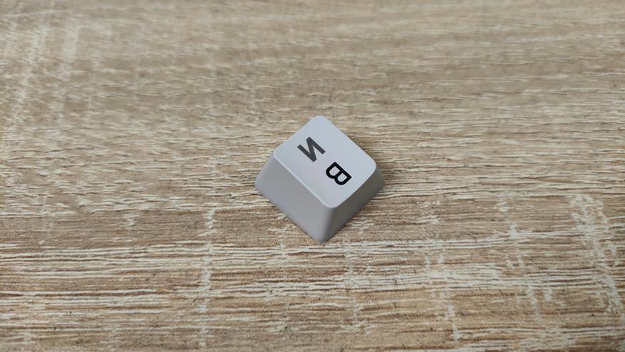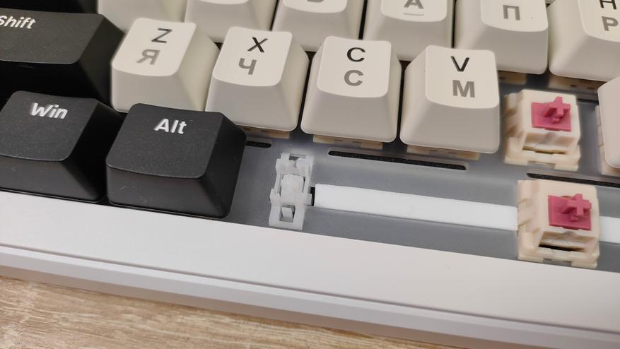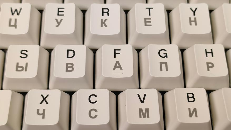 Колпачки имеют двойное литье из PBT, что делает их прочными, шершавыми, не стираемыми и непрозрачными. Толщина 1.3 мм, что немного, но до 0.9 мм далеко, а такие я встречал, правда из ABS, за них немного страшно. К обработке вопросов нет, даже перчатки не скажу, что сильно как-то цепляются. Гравировка кириллицы выглядит немного жирнее, чем латиница. Стабилизаторы привычные для пластины позиционирования, обильно смазанные и наверняка чуть гремящие, но это ожидаемо будет. Клавиатура собрана на прокладках и для пущего прогиба есть надрезы в «плейте».