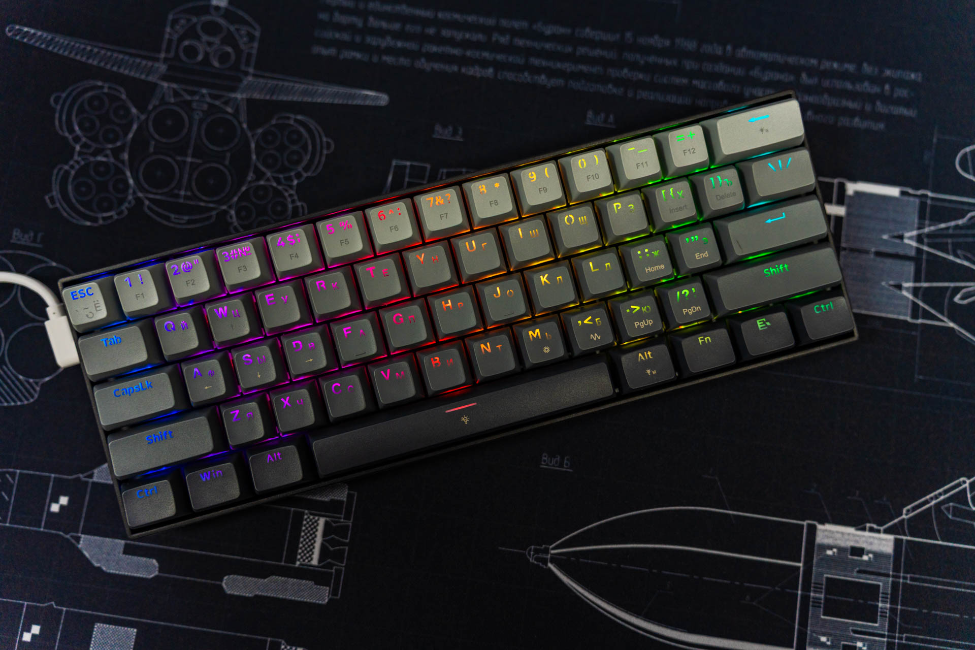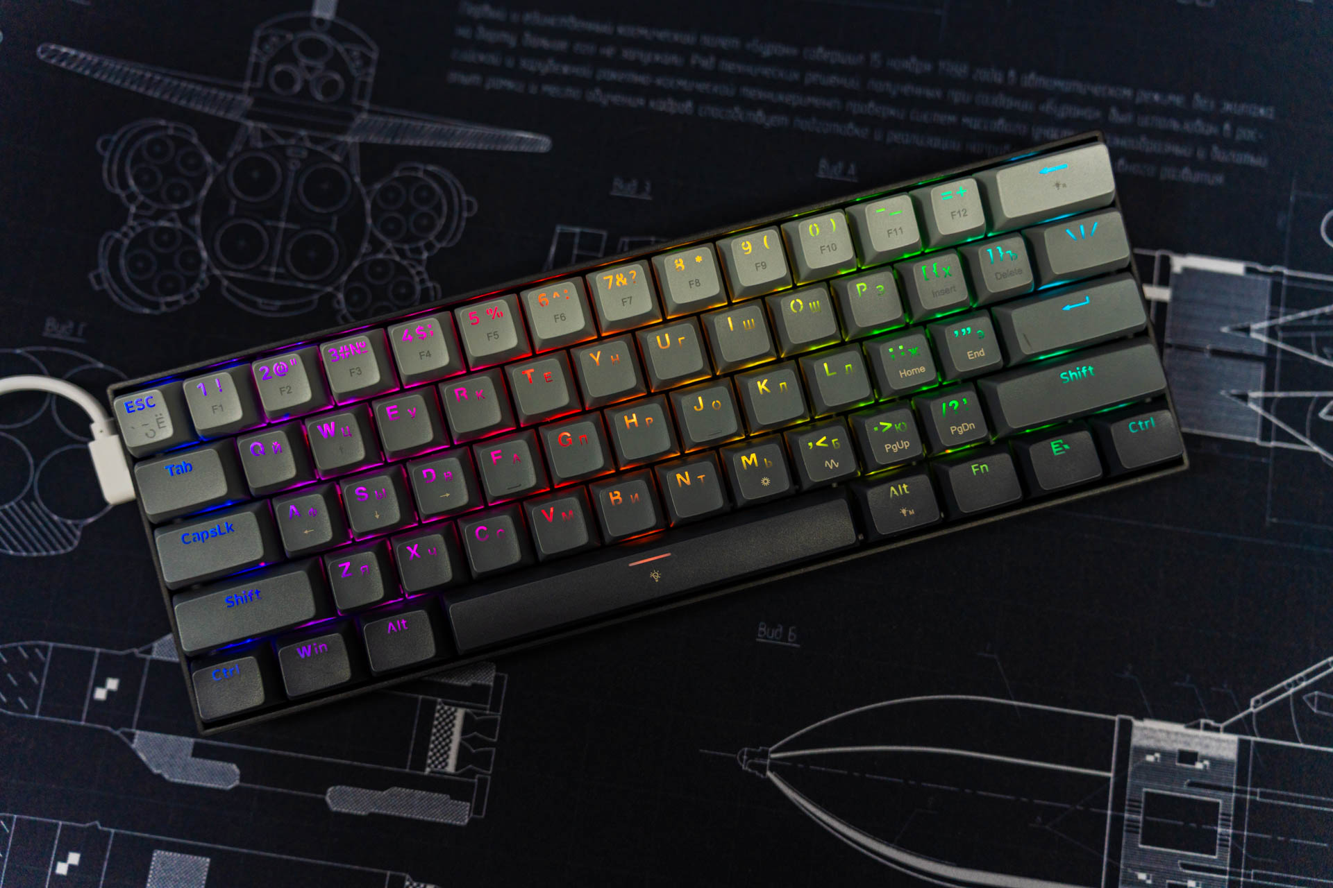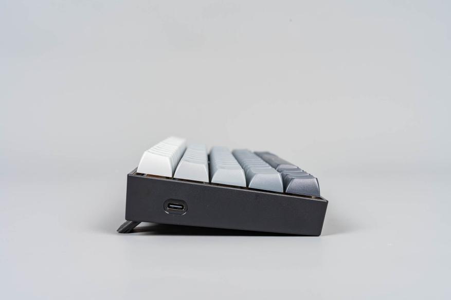 Внешний вид данной клавиатуры лаконичный и сдержанный. Основной акцент в дизайне сделан на градиентной расцветке колпачков, которая сочетает нейтральные оттенки, создавая спокойную, почти мистическую эстетику. Такое решение позволяет устройству органично вписаться в различные стили оформления рабочего пространства. Корпус клавиатуры выполнен из пластика — решение, которое может трактоваться неоднозначно. С одной стороны, пластик обеспечивает лёгкость конструкции и снижает итоговую стоимость устройства, что важно для бюджетного сегмента. С другой — такой материал смотрится не столь премиальным по сравнению с металлом.