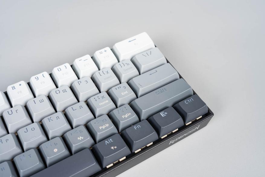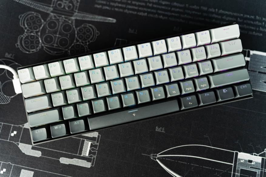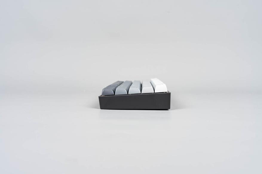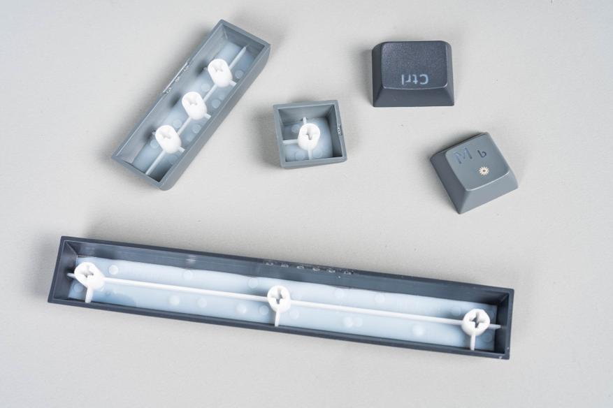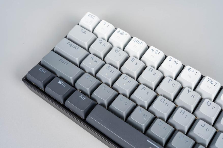 Профиль колпачков сочетает черты популярных вариантов вроде XDA и OEM: сферическое углубление и лёгкая вогнутость поверхности направлены на повышение эргономики при наборе текста. Колпачки клавиатуры изготовлены из ABS-пластика методом двойного литья: второй полупрозрачный слой обеспечивает равномерную подсветку символов. Толщина стенок составляет 1.3 мм, что является стандартным показателем для ABS-материала. Однако полупрозрачный слой нанесён только на верхнюю часть колпачков, а не по всей внутренней поверхности — это может незначительно влиять на яркость подсветки, но в целом сохраняет баланс между функциональностью и износостойкостью.