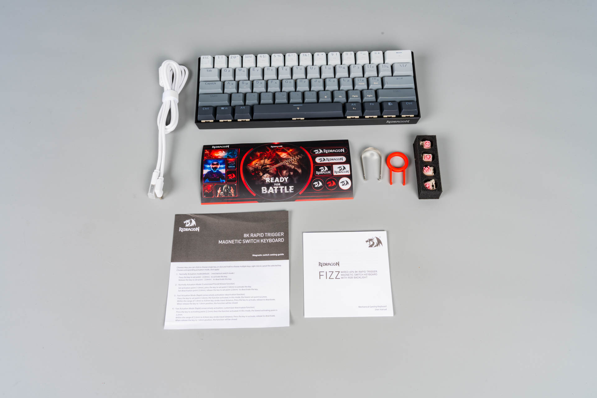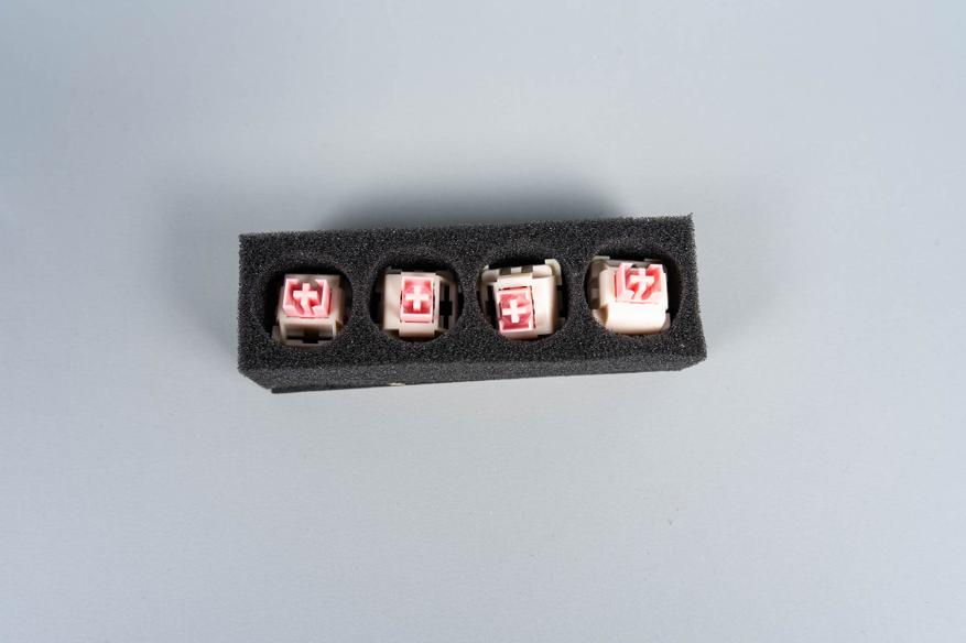 В комплекте с клавиатурой поставляются четыре магнитных переключателя Redragon Magnetic, упакованные в отдельный бокс с ложементом для удобства хранения. Визуально и по характеристикам они идентичны модели Outemu Magnetic Pink Beige, что указывает на возможное OEM-производство.