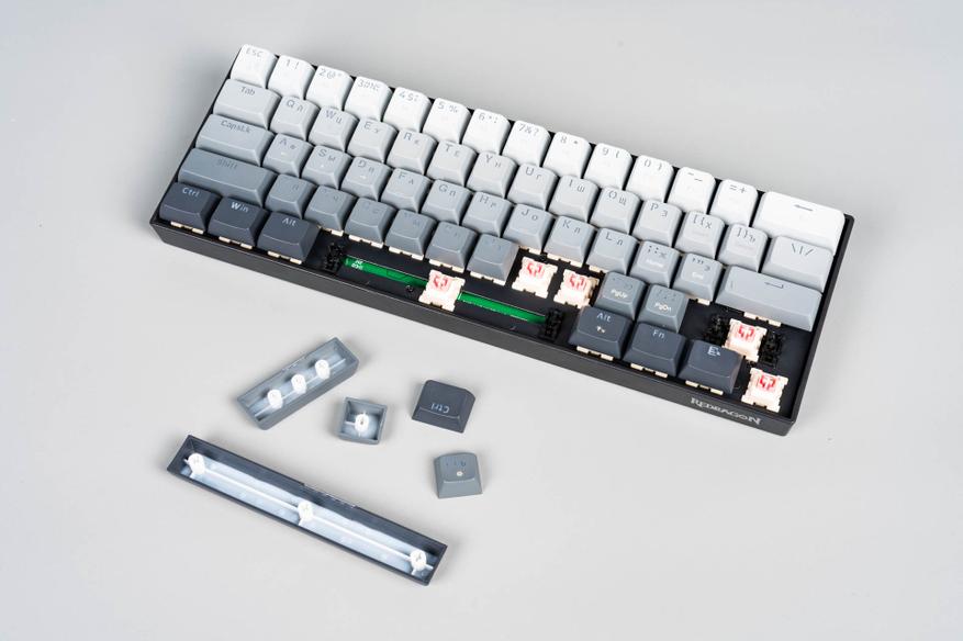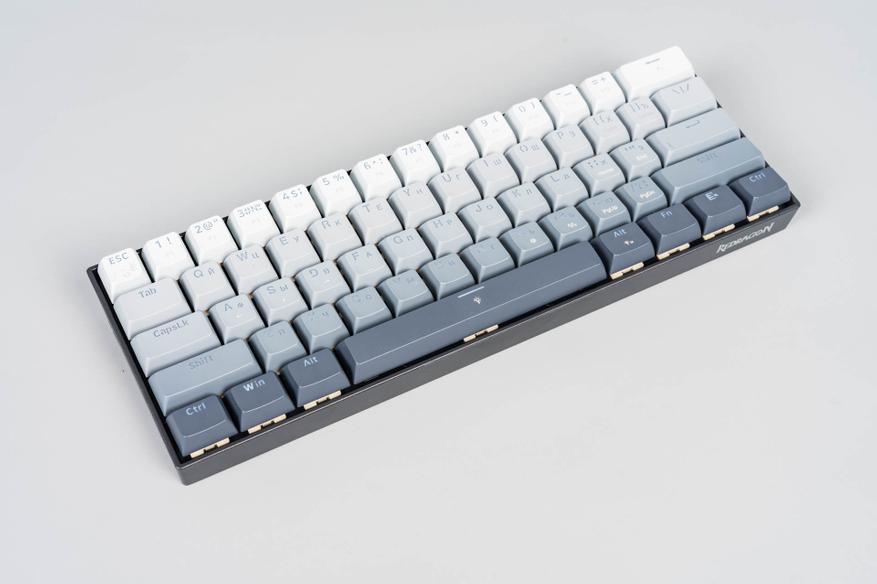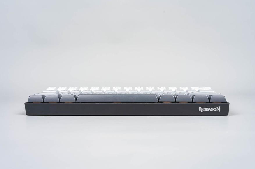 Форм-фактор Redragon FIZZ — 65% (ANSI), что подразумевает компактность за счёт отсутствия цифрового блока и некоторых функциональных клавиш. Раскладка включает одноэтажный Enter, широкие шрифты на клавишах и логичное расположение элементов (например, F2 традиционно находится над цифрой «2»).