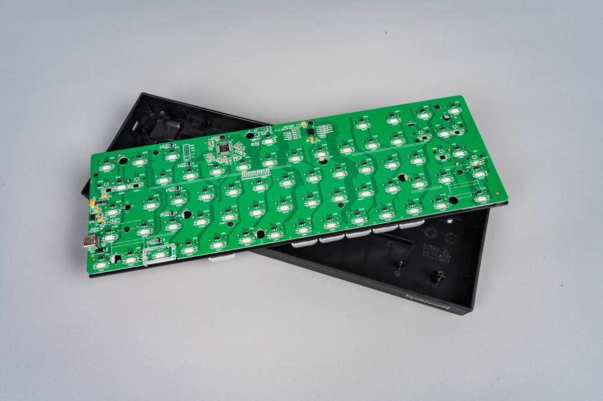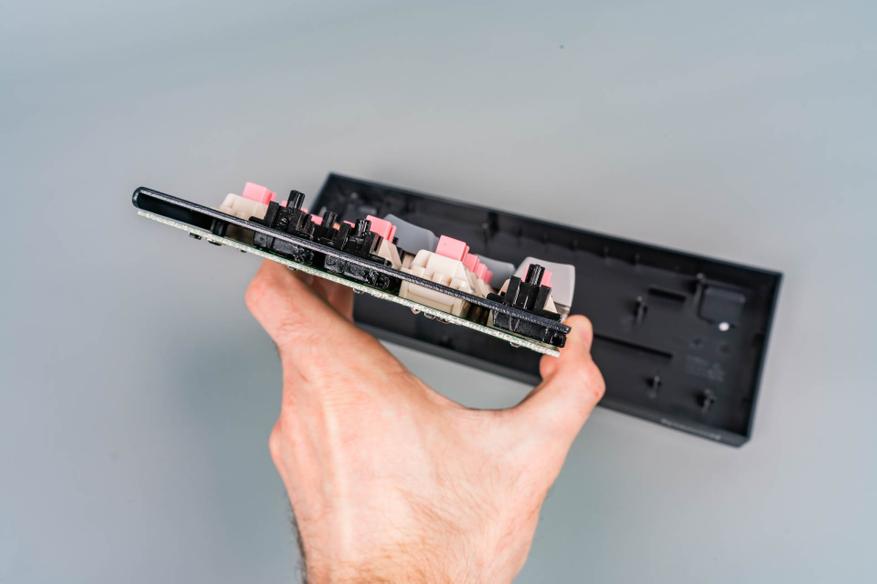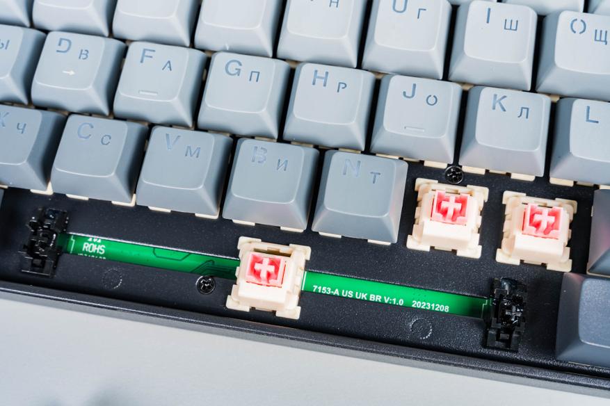Под переключателем расположен северный светодиод, обеспечивающий подсветку символов через полупрозрачные колпачки. Однако отсутствие в корпусе клавиатуры шумоизоляции как под переключателями, так и под пластиной позиционирования может привести к более выраженному акустическому резонансу («пингу») и механическому дребезгу — это типично для бюджетных клавиатур, где экономия на таких элементах снижает себестоимость.