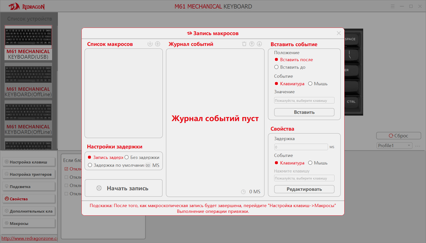 Программное обеспечение клавиатуры Redragon FIZZ предоставляет стандартный для современных устройств набор функций: