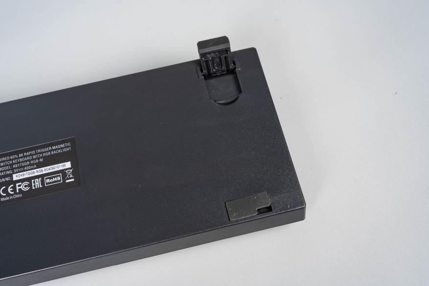 Нижняя часть клавиатуры выполнена в минималистичном стиле: здесь расположены резиновые антискользящие ножки с одним уровнем высоты и информационная наклейка с базовыми данными устройства.