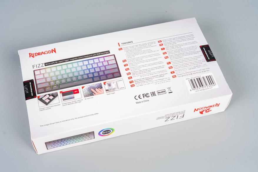Клавиатура FIZZ поставляется в коробке, оформленной в узнаваемом стиле Redragon. Лицевая сторона упаковки демонстрирует изображение самой клавиатуры, что позволяет оценить её дизайн, а также содержит ключевые технические параметры. На оборотной стороне приведён расширенный список особенностей модели и краткие спецификации. В целом, упаковка даёт базовое представление о продукте, но не раскрывает всех деталей.
