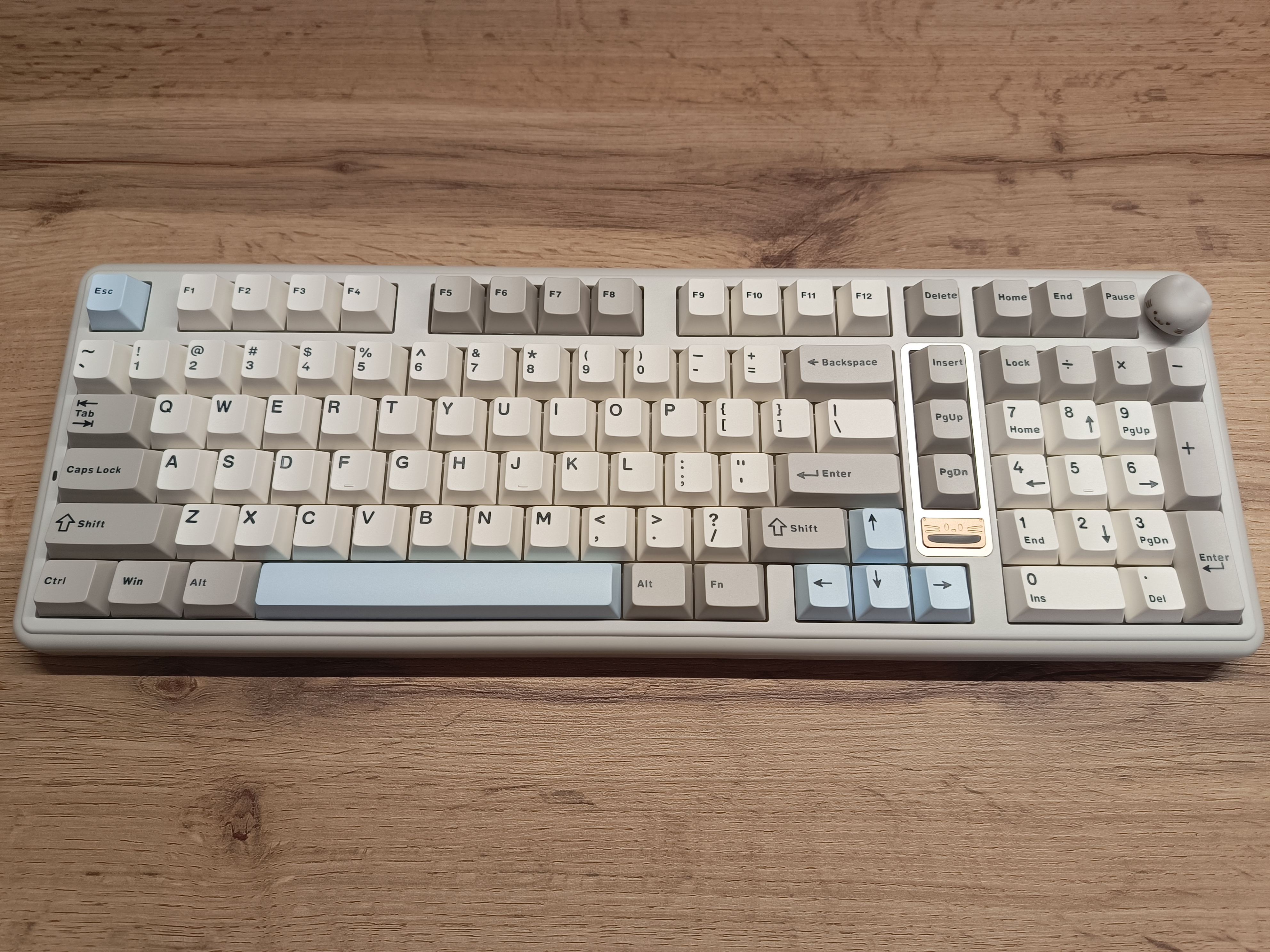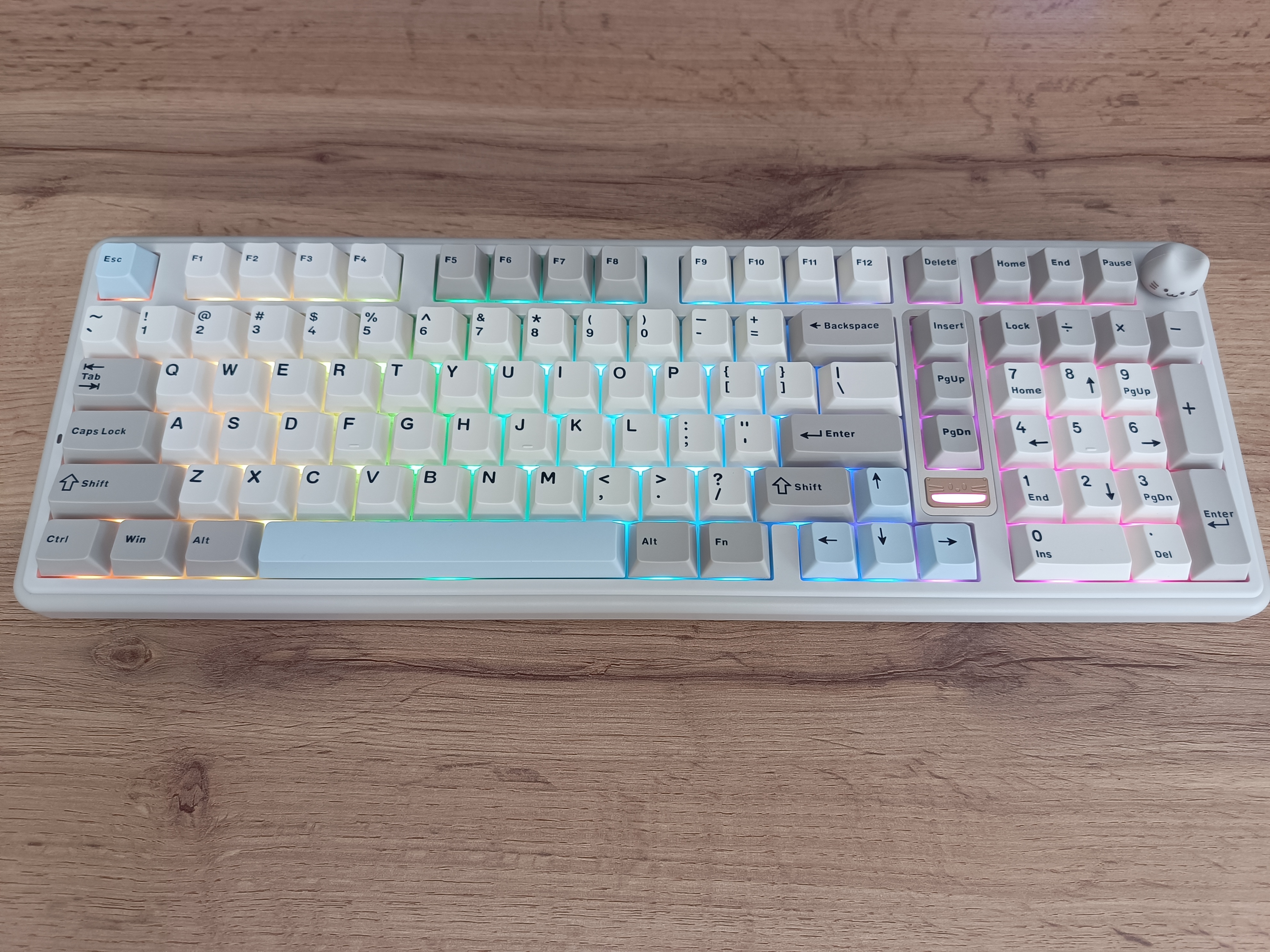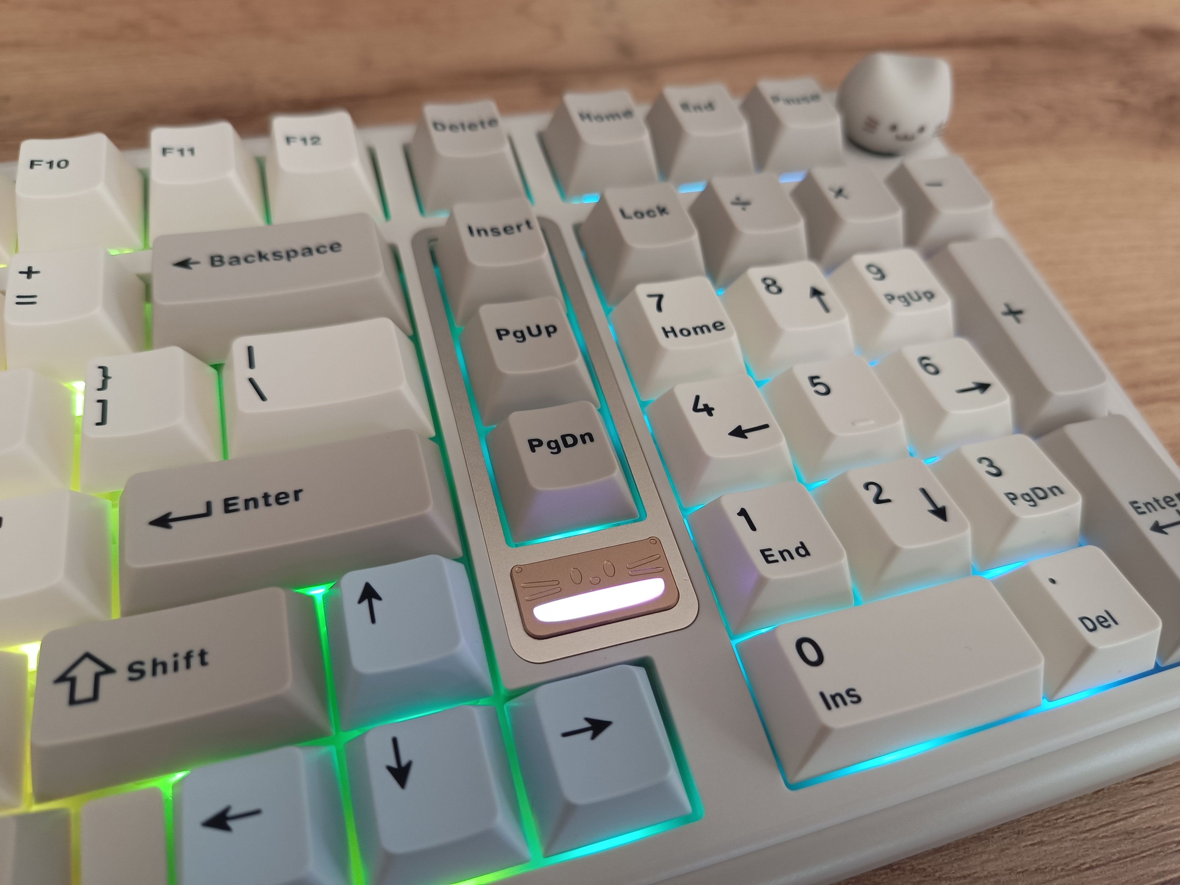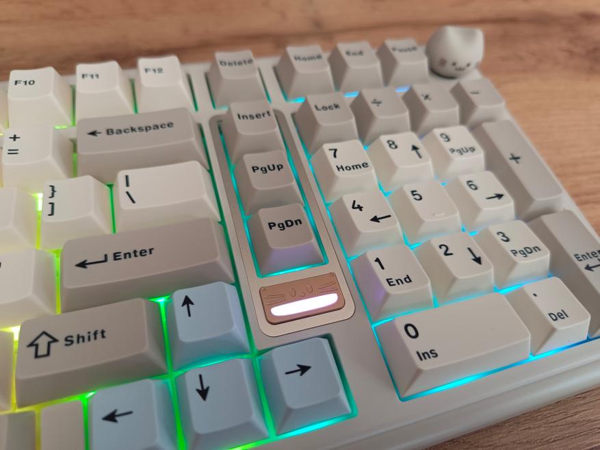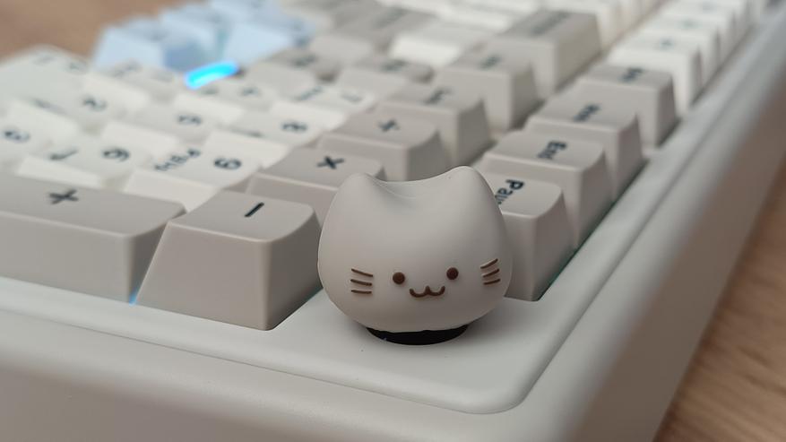 Особенность внешнего вида клавиатуры заключается в двух милых «котиках». Первый — это логотип, у которого подсвечивается рот, создавая забавный эффект. Второй котик представлен в виде кейкапа на энкодере, но если он вам не по душе, в комплекте предусмотрена обычная круглая крутилка в хромированном исполнении.
