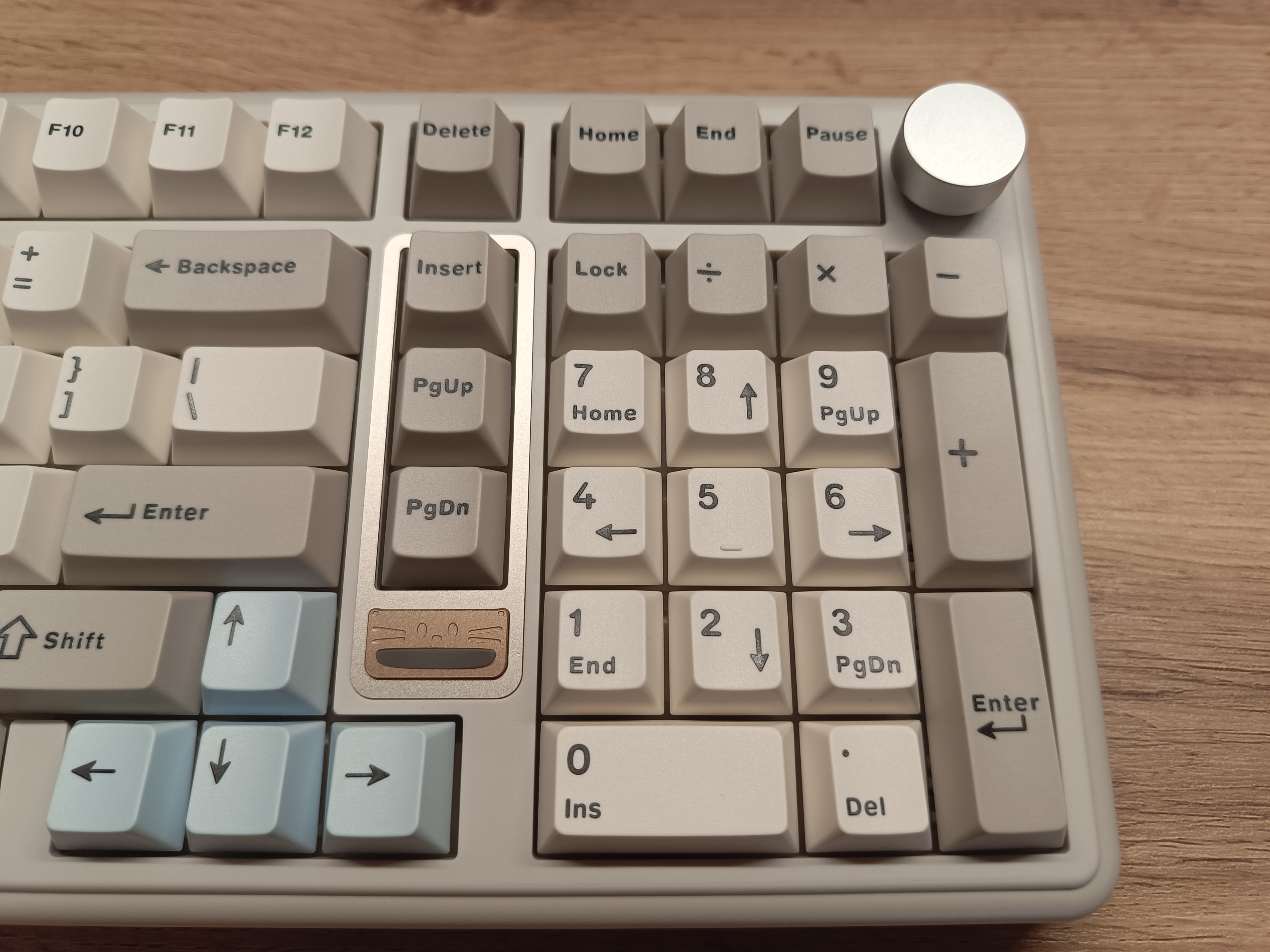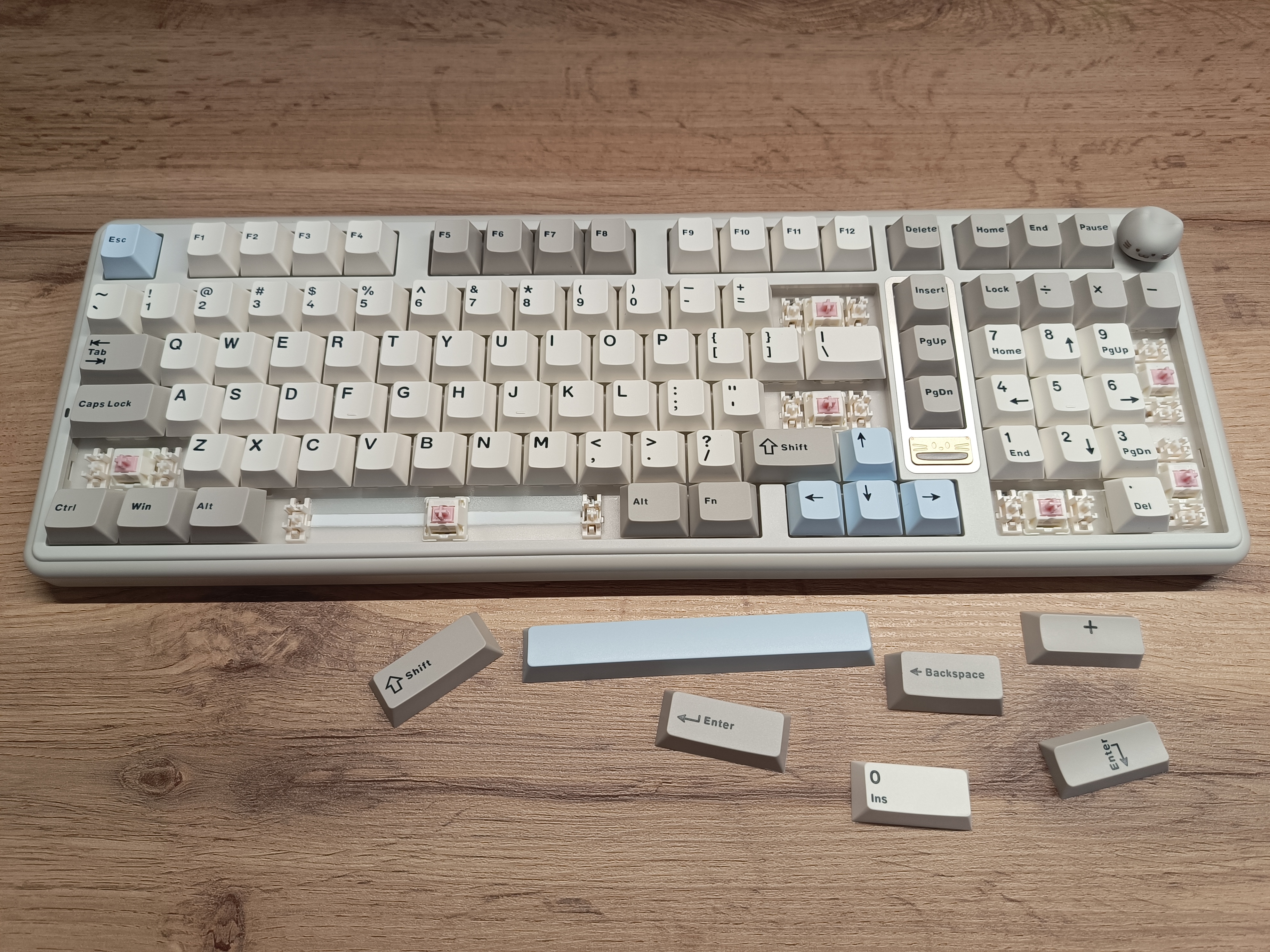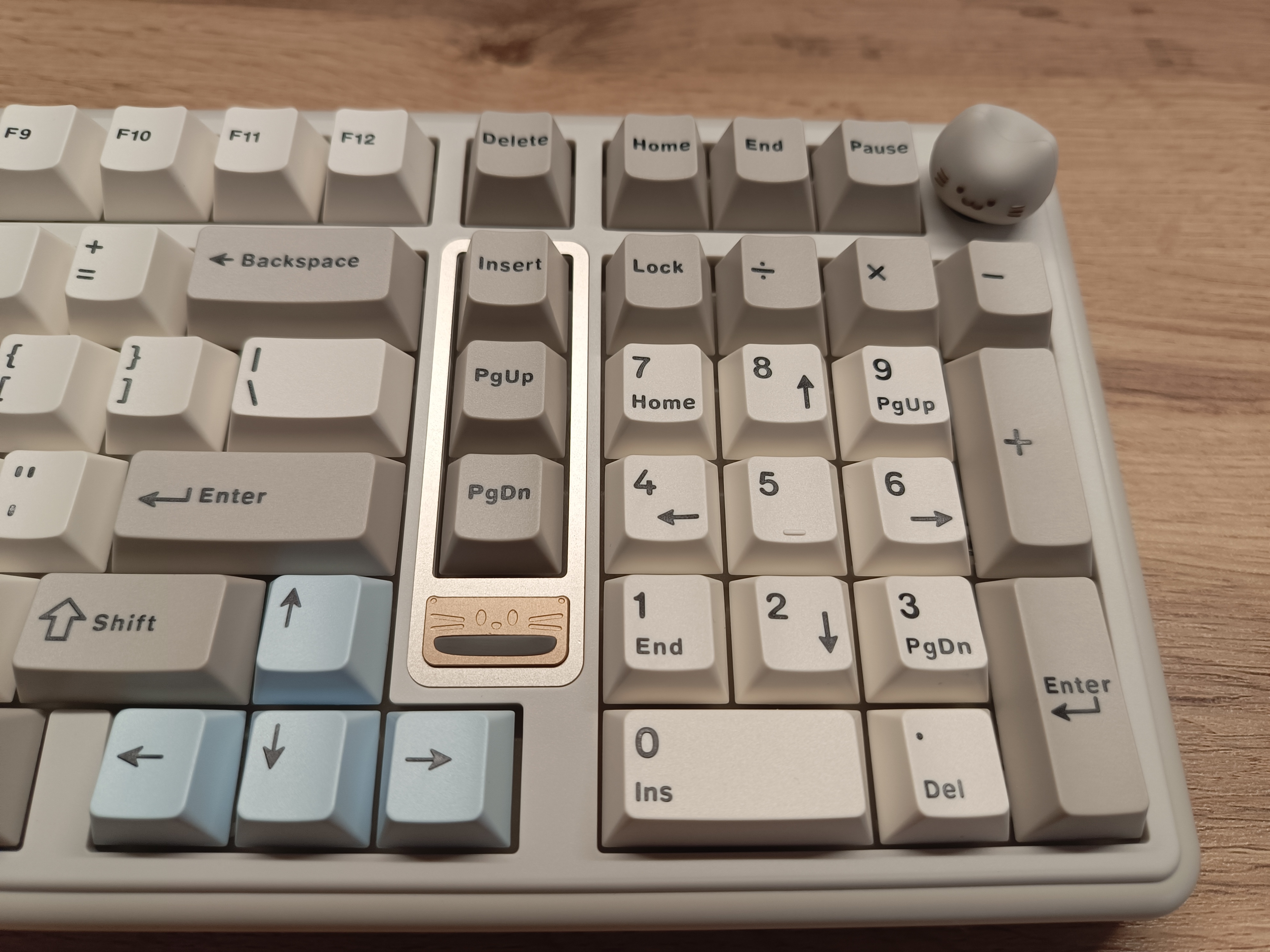 Особенность внешнего вида клавиатуры заключается в двух милых «котиках». Первый — это логотип, у которого подсвечивается рот, создавая забавный эффект. Второй котик представлен в виде кейкапа на энкодере, но если он вам не по душе, в комплекте предусмотрена обычная круглая крутилка в хромированном исполнении.