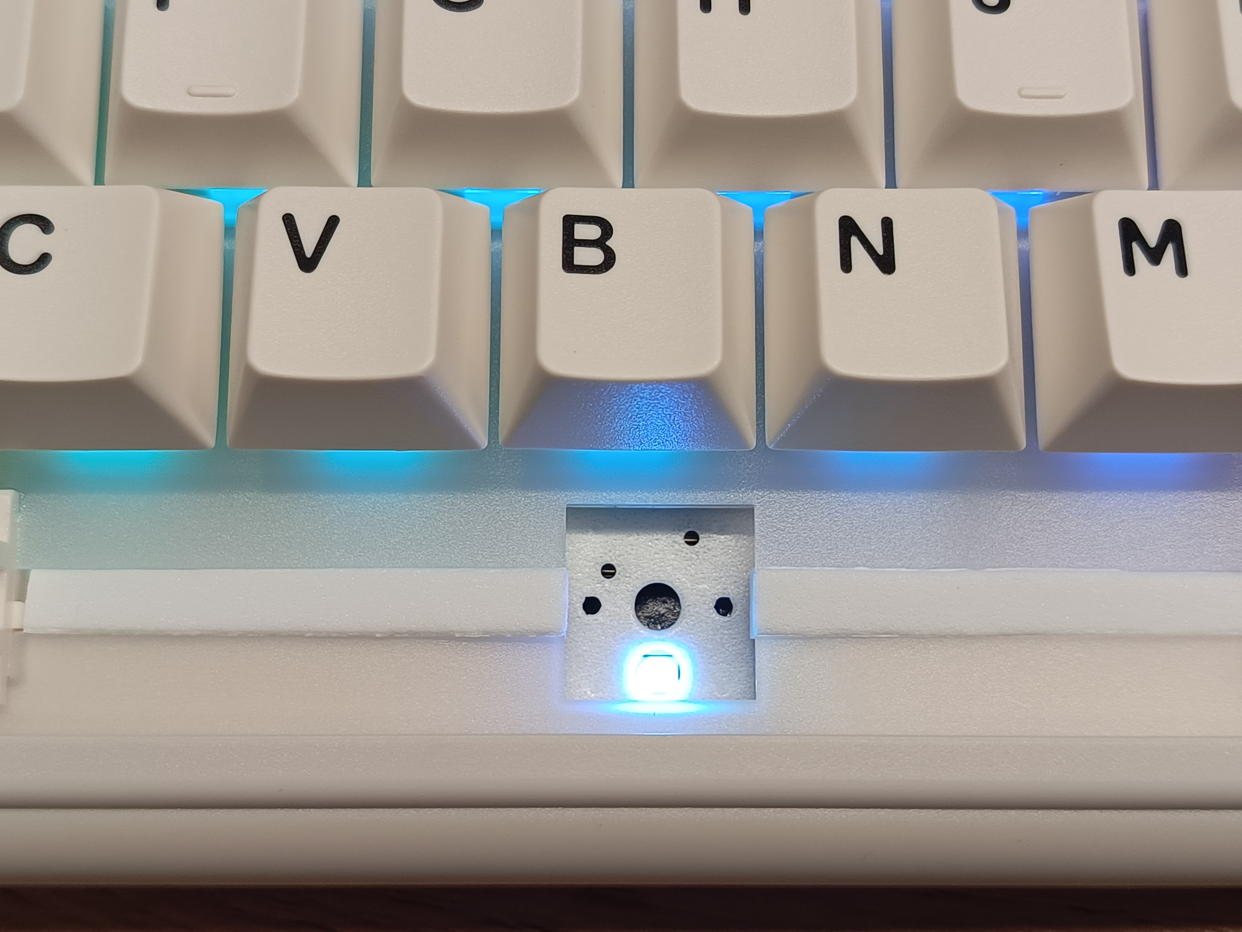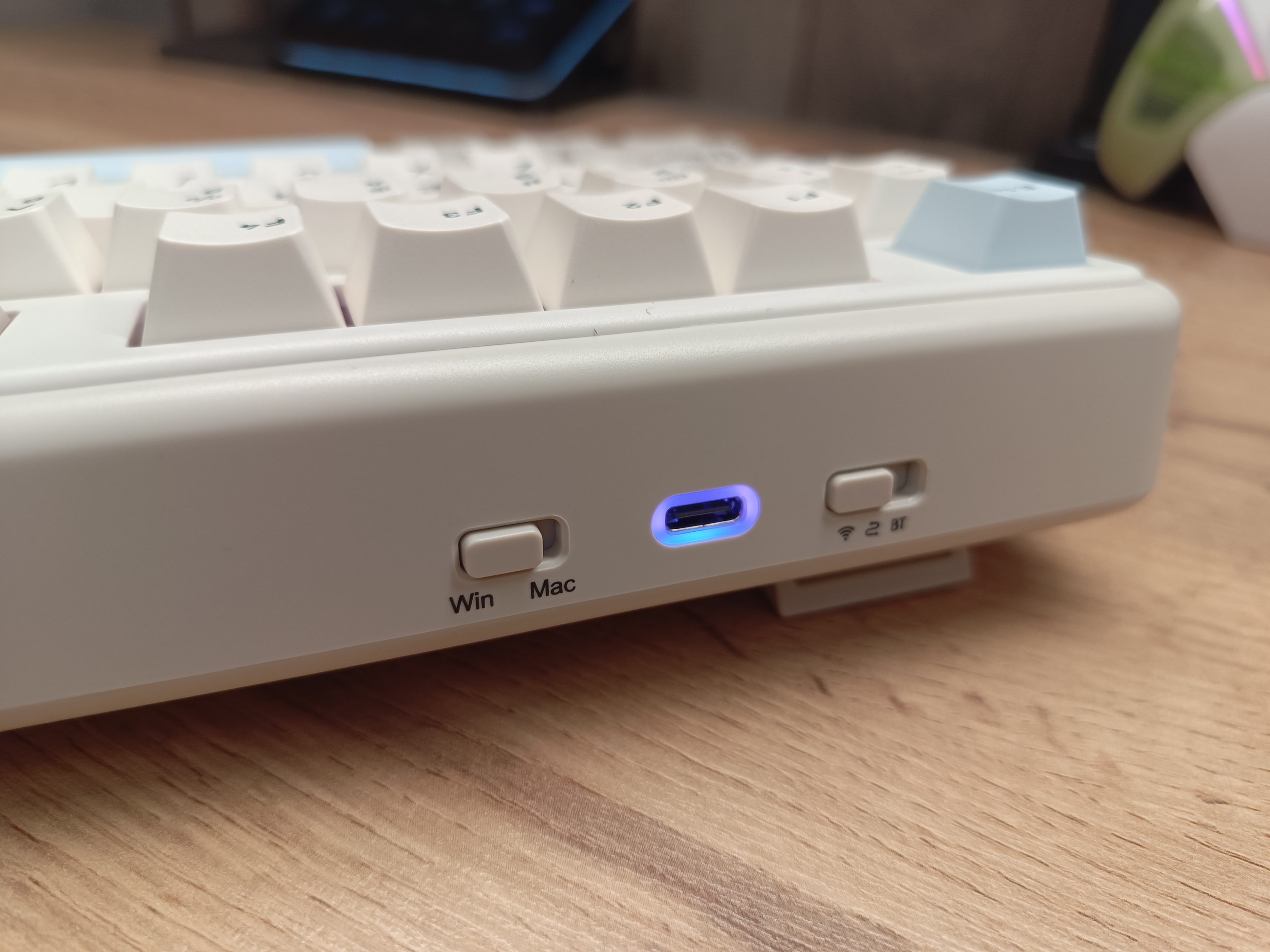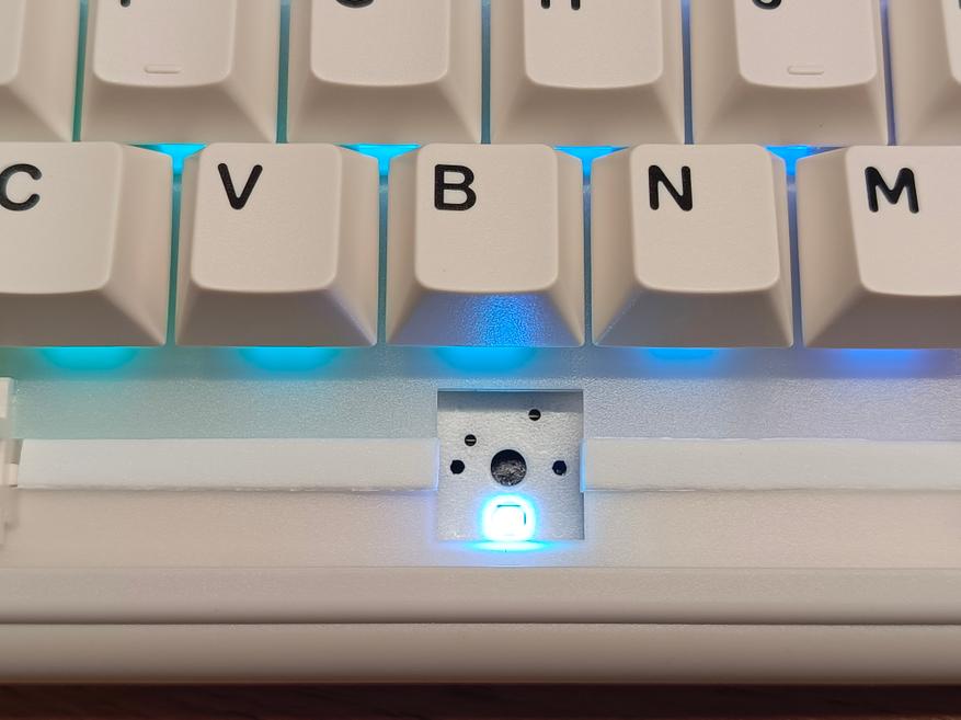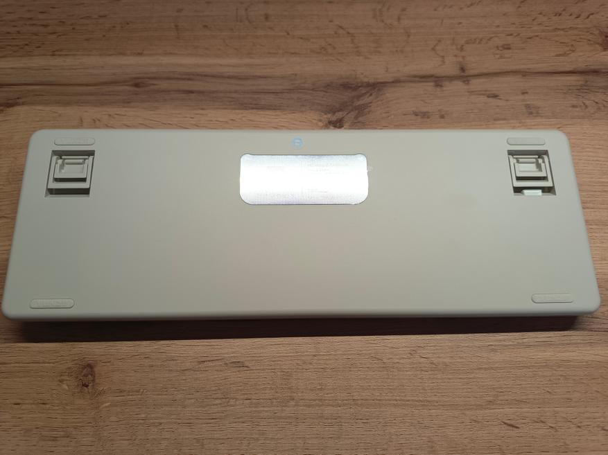 С обратной стороны, ближе к левому краю, находится тумблер, отвечающий за выбор раскладки между Windows и Mac, при этом символы на кейкапах нанесены только для Windows. Второй тумблер отвечает за тип подключения: радиоканал, Bluetooth или провод. Между этими тумблерами установлен разъём Type-C, который выделен круговой подсветкой. Разъём используется как для зарядки клавиатуры, так и для проводного подключения.