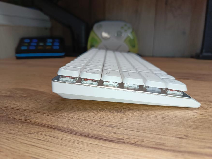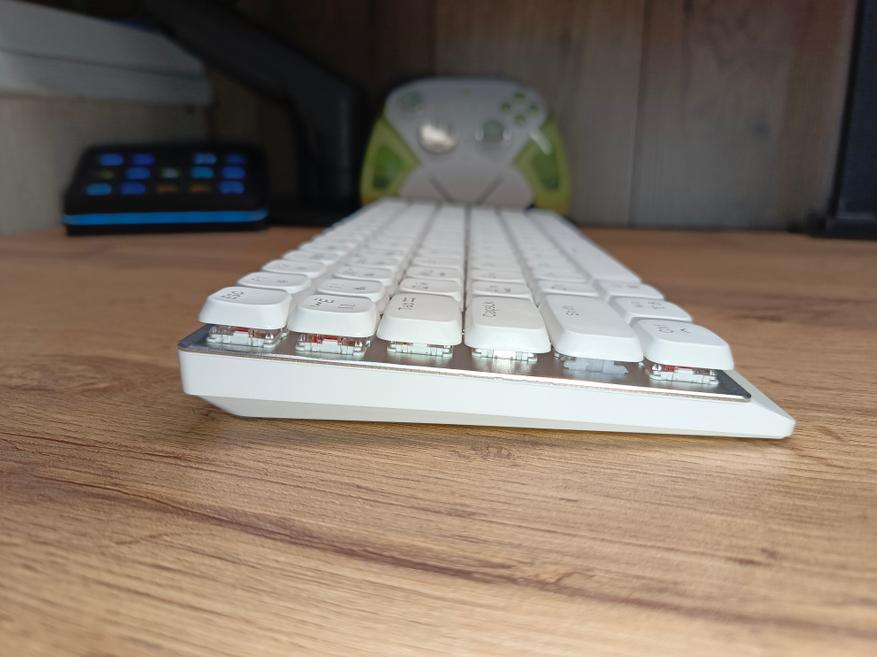 Vaiver Leaf V2 использует низкопрофильные механические переключатели JERRZI Low Profile Red. Это линейные свитчи, нажатие мягкое и плавное, без щелчков и тактильного сопротивления. Звук, по моим ощущениям, подпружиненный, ну и, как говорится, на любителя. Меня полностью устраивают, так как они не очень громкие для данного типа клавиатуры. Конечно, клавиатура не совсем тихая, так как здесь нет гаскет-структуры. Пластиковый корпус с алюминиевой пластиной создают неплохую жесткость корпусу, но не тишину.