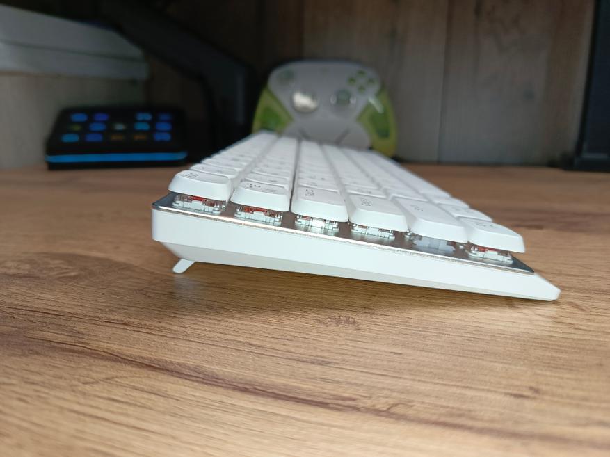 Клавиатура изначально имеет небольшой наклон, но если этого покажется мало, то можно изменить наклон в большую сторону с помощью двойных откидных лапок. По столу не скользит, стоит уверенно благодаря резиновым накладкам. Весит 470 грамм.