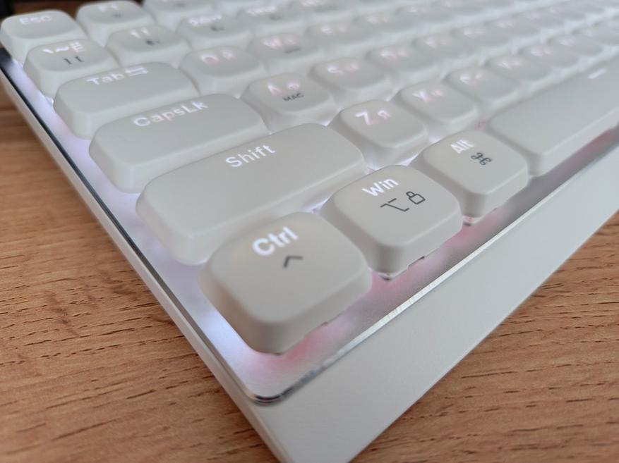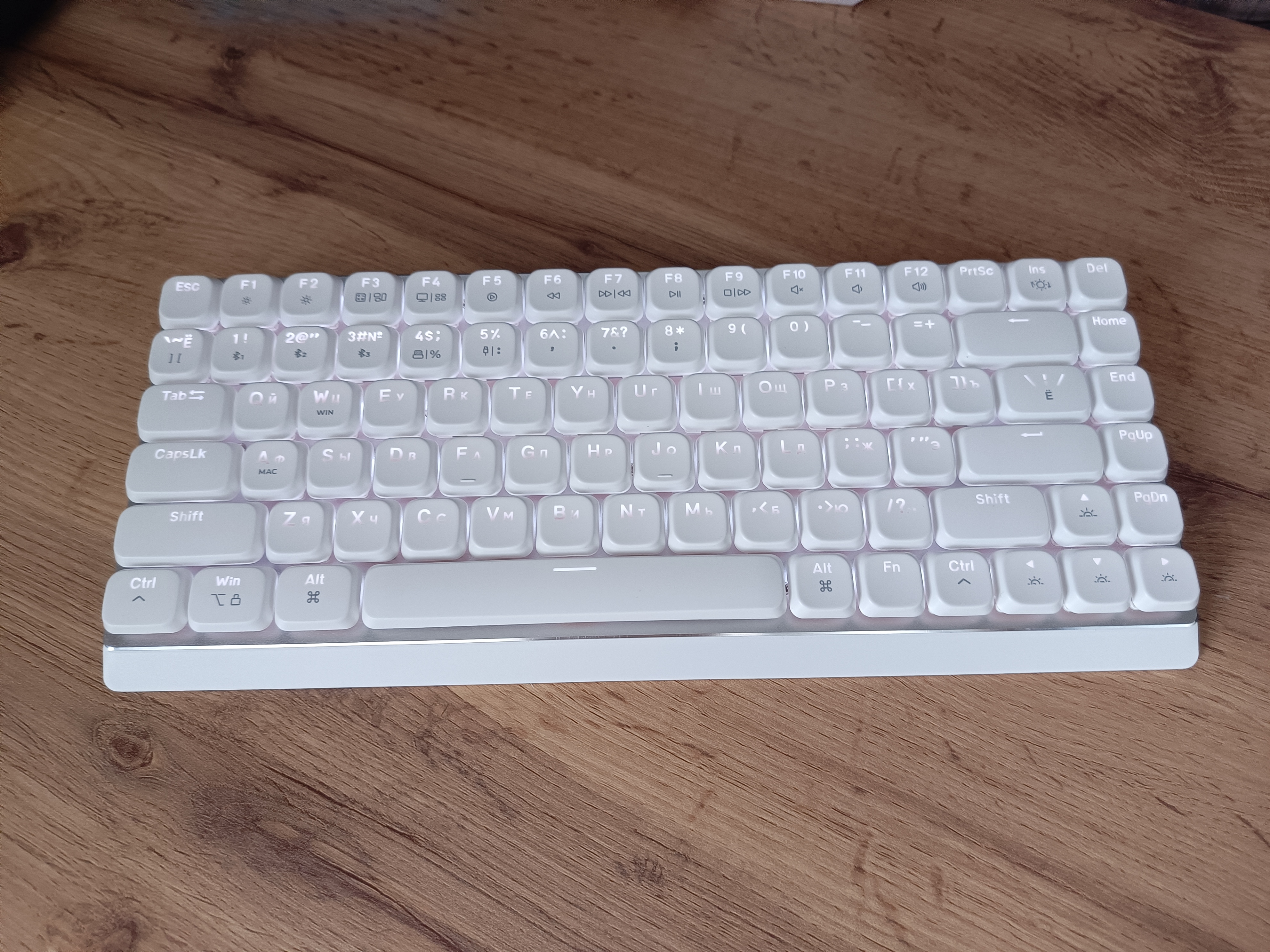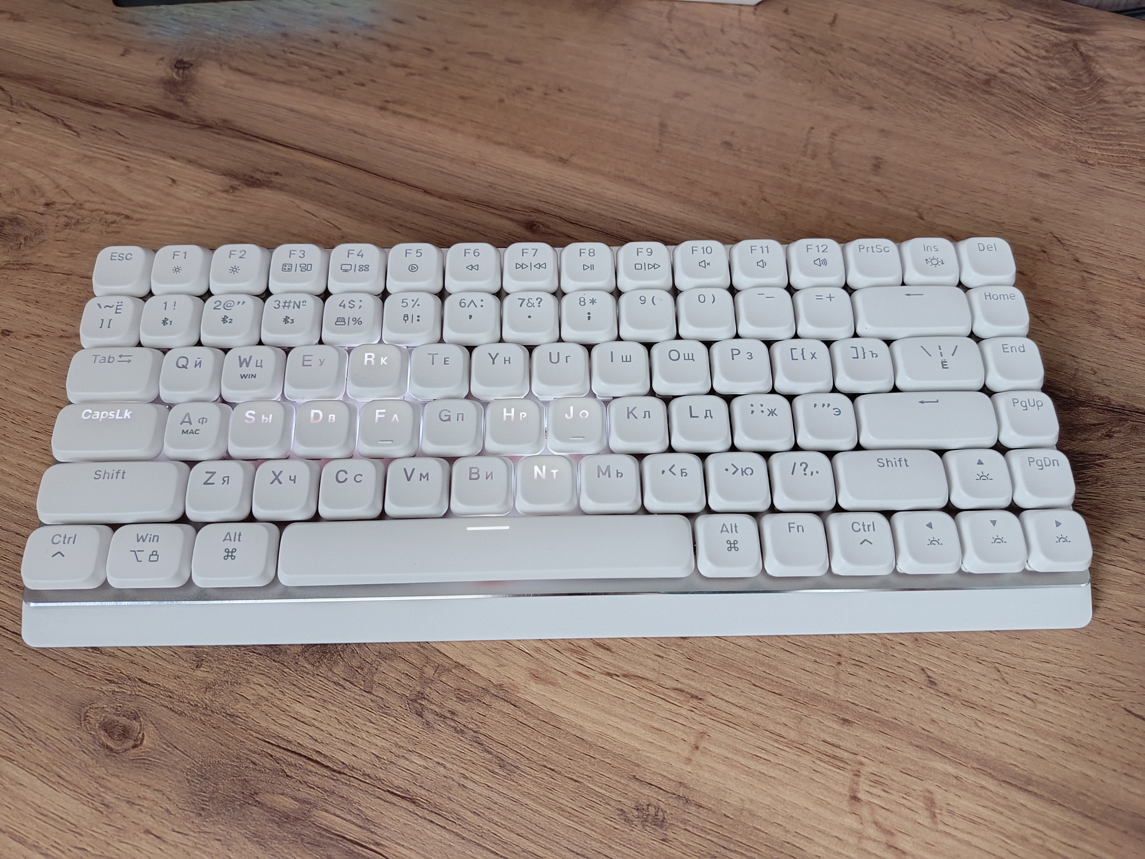 С первого взгляда клавиатура производит впечатление аккуратного и современного устройства. Ничего лишнего — минимализм, компактный формат 75% и приятная белая подсветка. Это не просто игровой аксессуар, а вполне универсальная модель, которая одинаково уместно смотрится и на рабочем столе, и в геймерском сетапе.