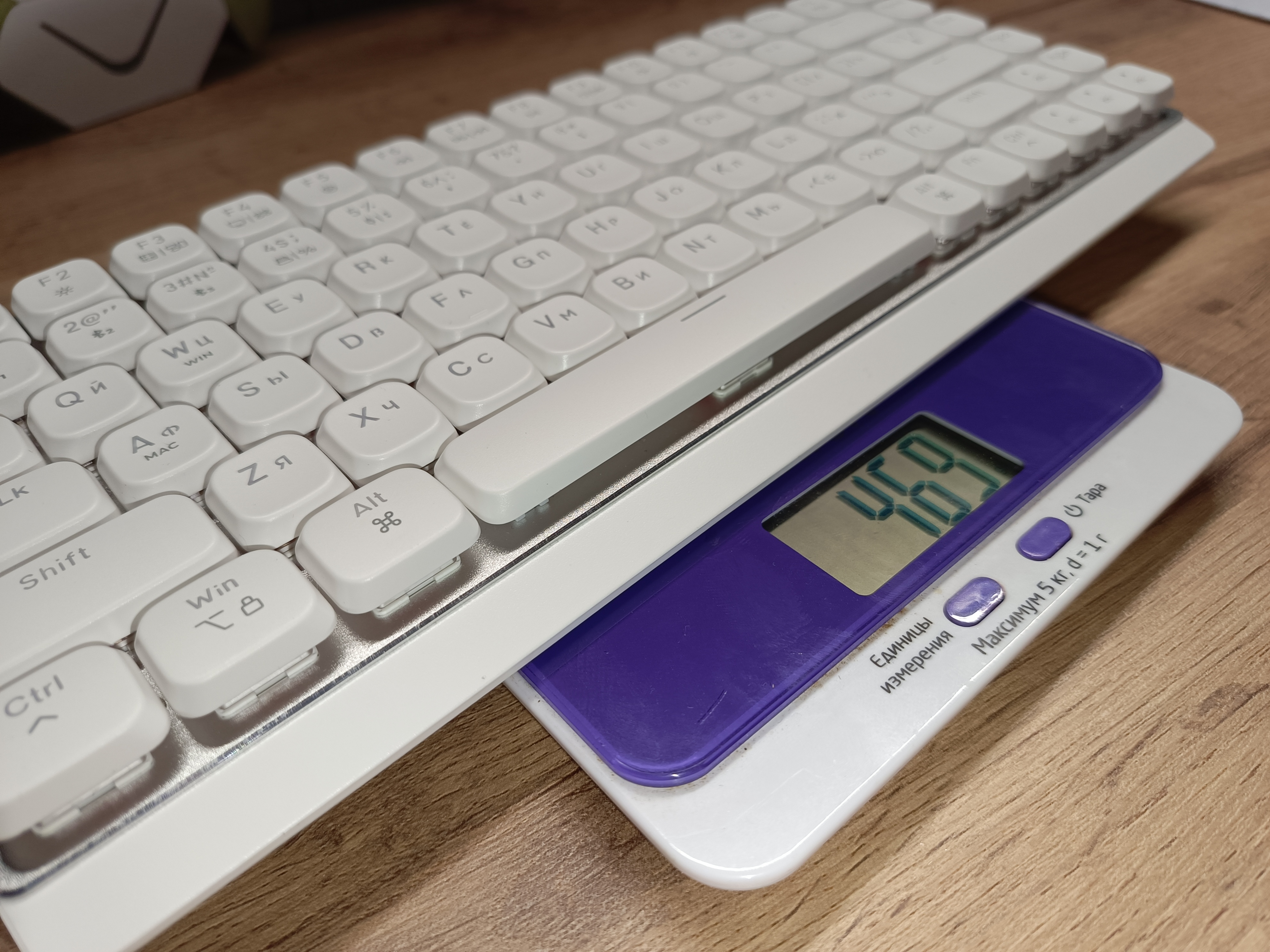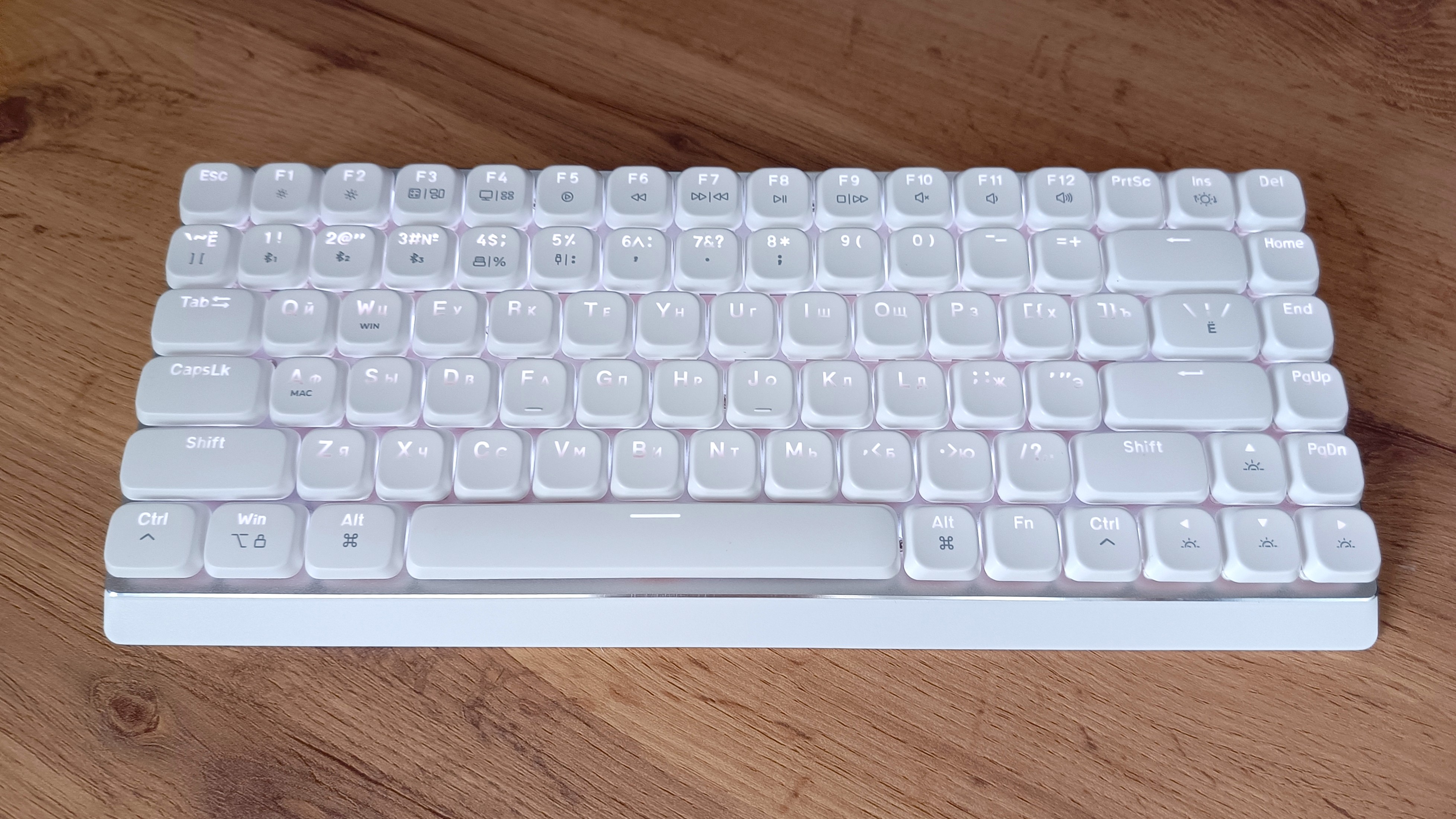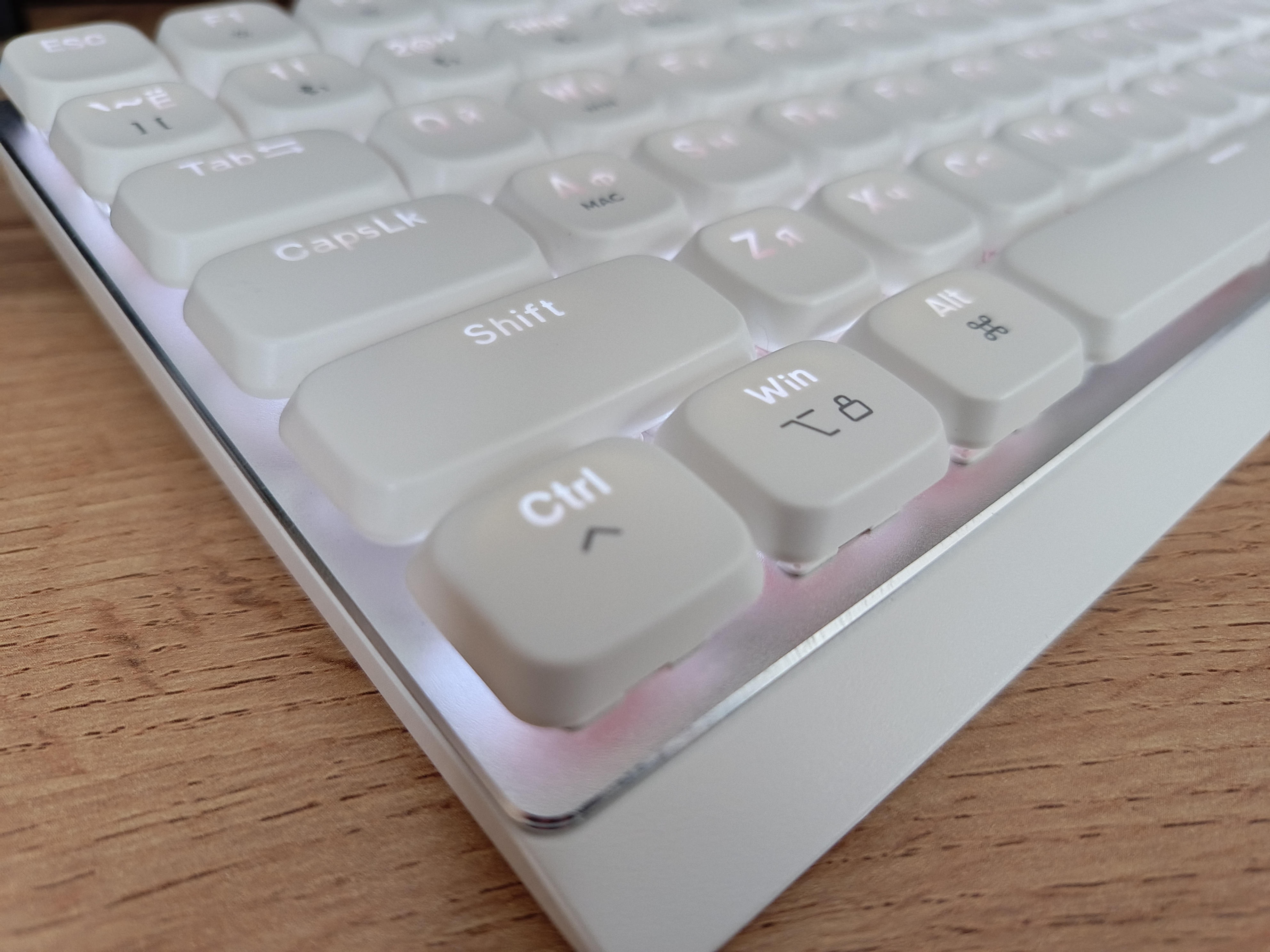 С первого взгляда клавиатура производит впечатление аккуратного и современного устройства. Ничего лишнего — минимализм, компактный формат 75% и приятная белая подсветка. Это не просто игровой аксессуар, а вполне универсальная модель, которая одинаково уместно смотрится и на рабочем столе, и в геймерском сетапе.