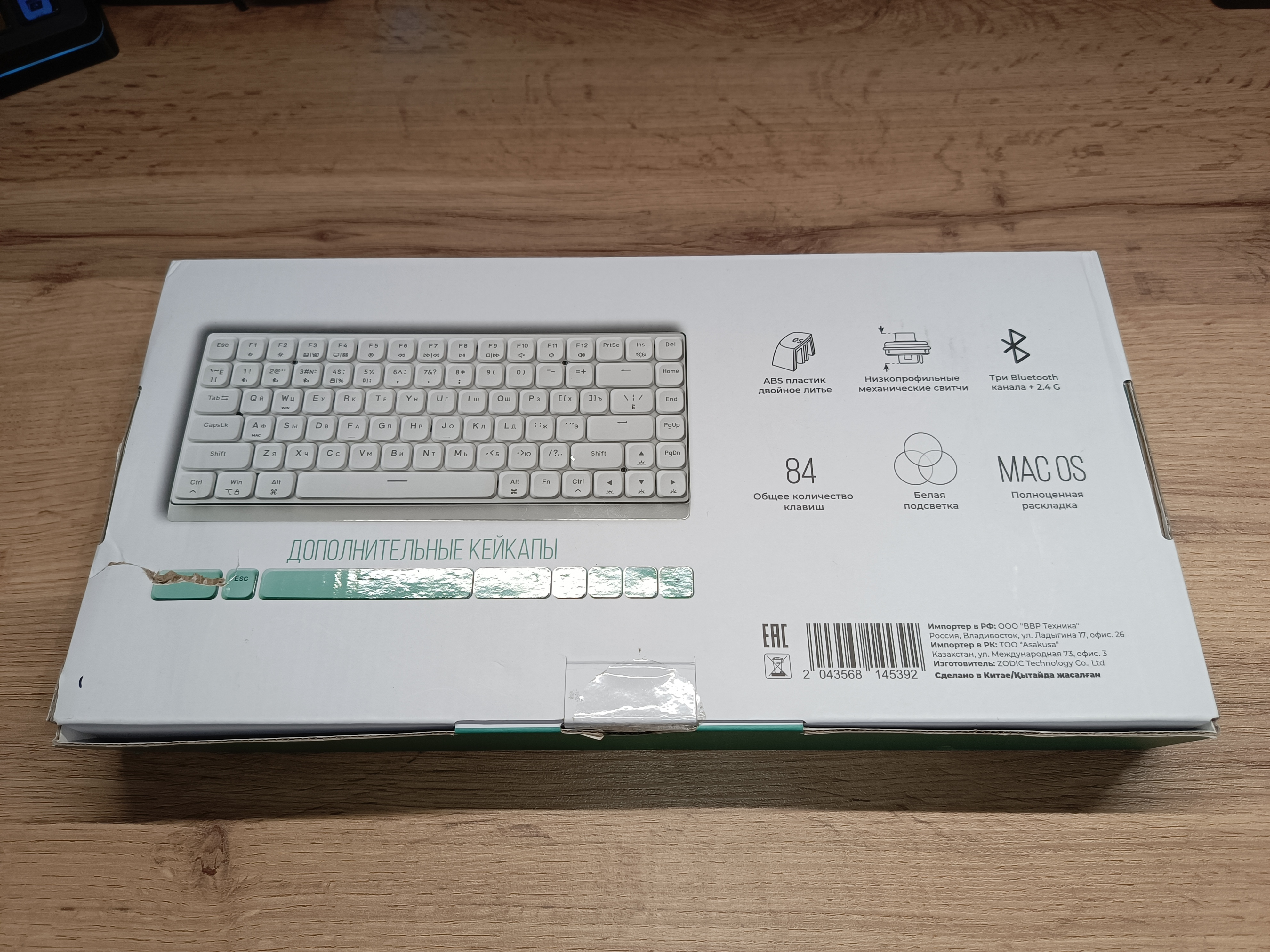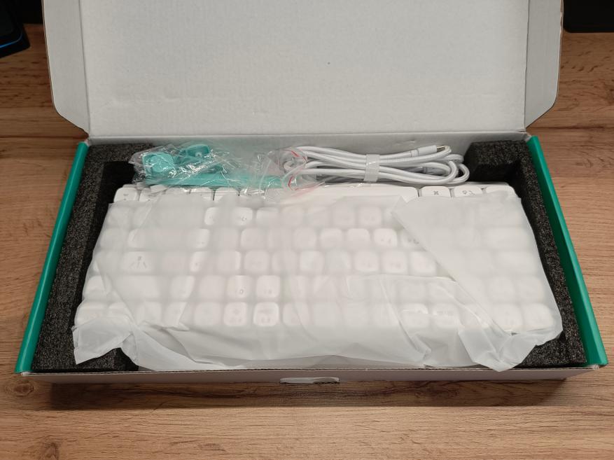 Упаковка максимально простая — обычный картон с цветным принтом без претензии на премиум. Зато внутри всё аккуратно зафиксировано и упаковано. В комплекте есть кабель USB длиной 1,8 метра в нейлоновой оплётке, донгл для беспроводного подключения в цвете корпус, инструкция на русском языке и дополнительный набор кейкапов другого цвета. Также в комплект положили съёмник для клавиш.