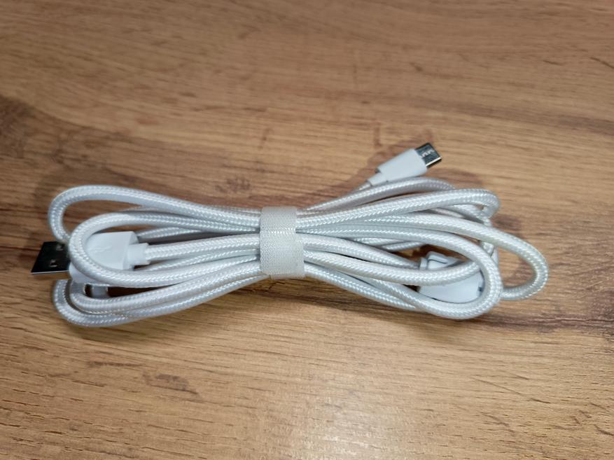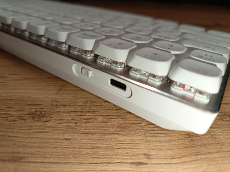 В левом углу клавиатуры расположен TYPE-C разъем для зарядки и проводного подключения. Клавиатура поддерживает три способа подключения. Первый — через радиоканал с помощью комплектного донгла. Второй — по Bluetooth на расстоянии до 10 метров. Третий — проводное подключение с помощью кабеля, который входит в комплект. Кабель белого цвета, с нейлоновой оплеткой и фильтром от высокочастотных помех. Его длина составляет 1,8 метра, что удобно для использования.