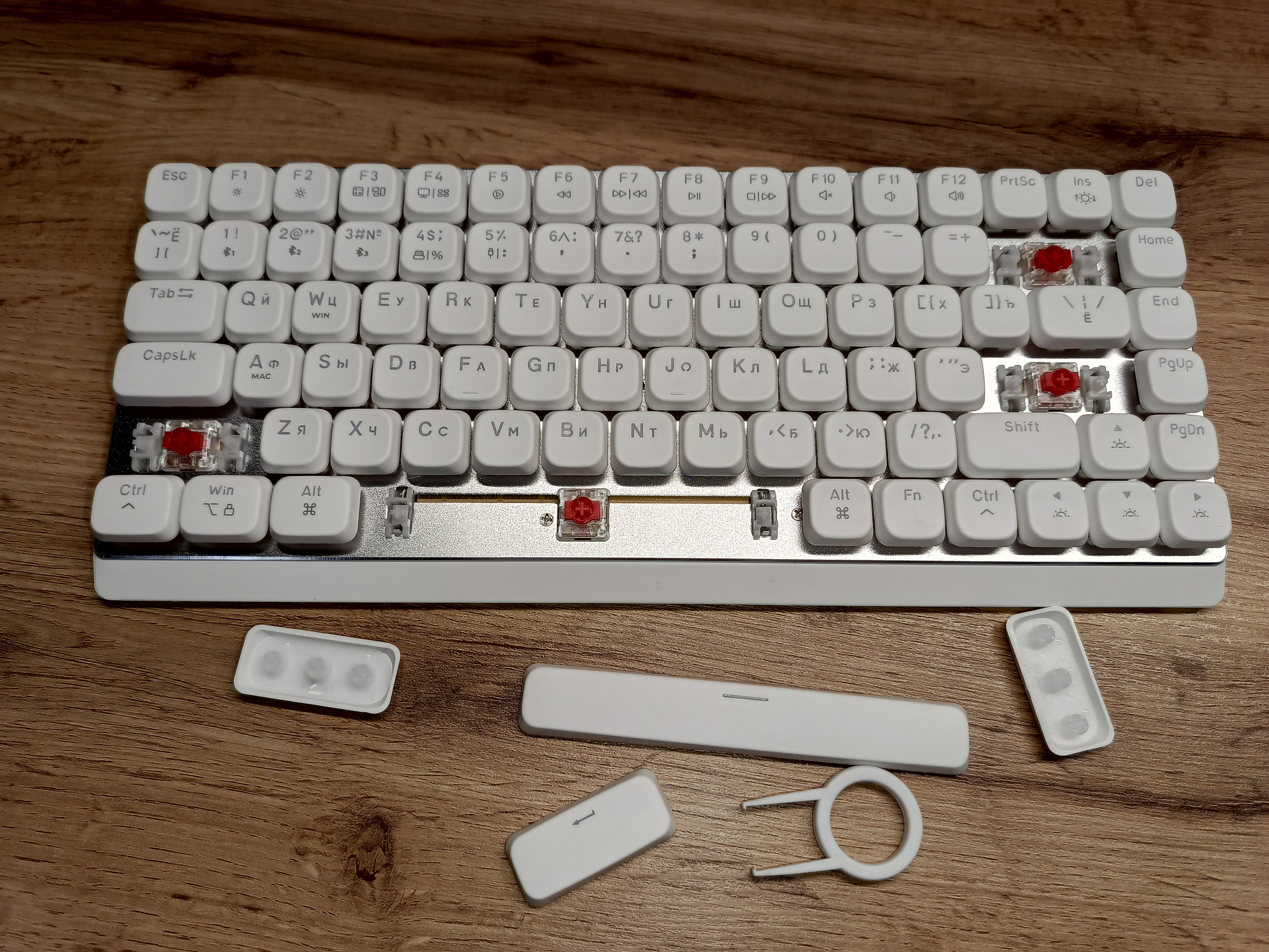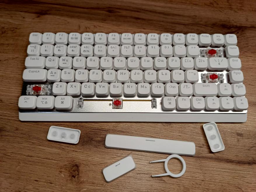 | Особенности | Низкий профиль, простая замена колпачков (инструмент в комплекте), кириллица с подсветкой |