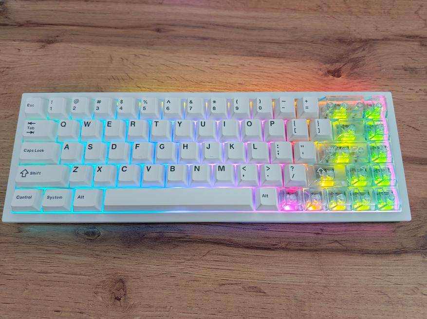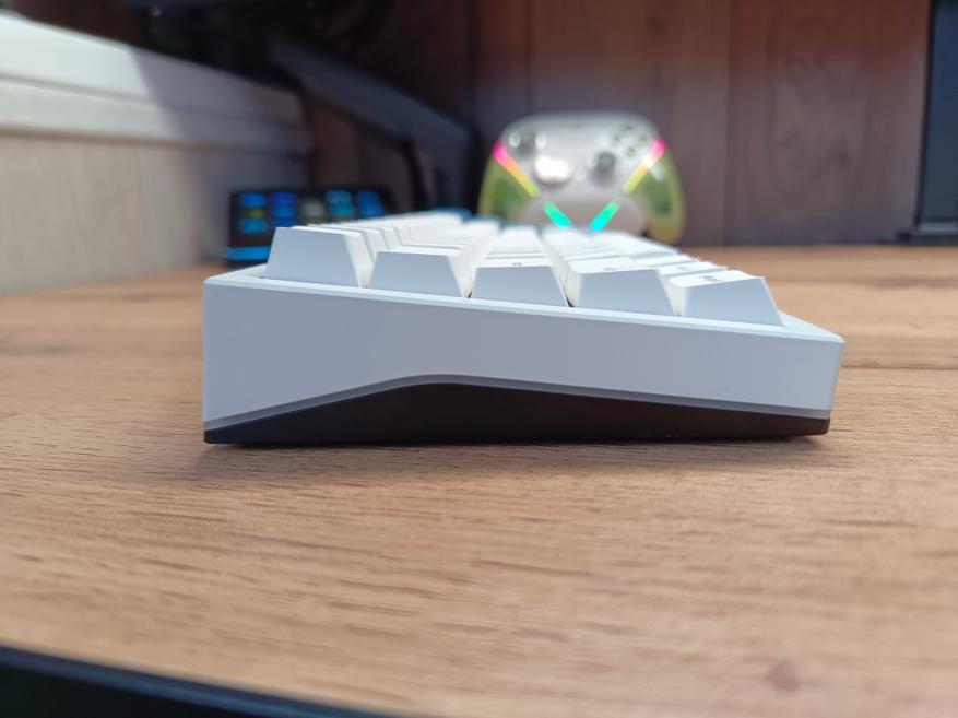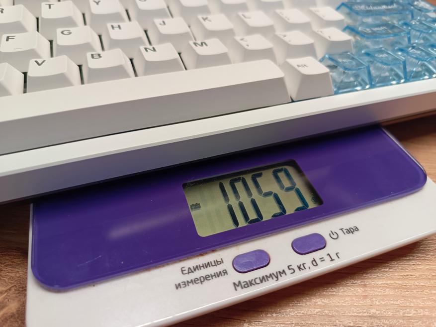 В итоге перед нами довольно добротная и компактная клавиатура с частично металлическим корпусом и пластиковыми элементами. Благодаря металлической рамке формат 65% получил заметный вес — чуть более килограмма, что обеспечивает устойчивое положение на столе.